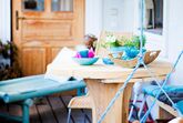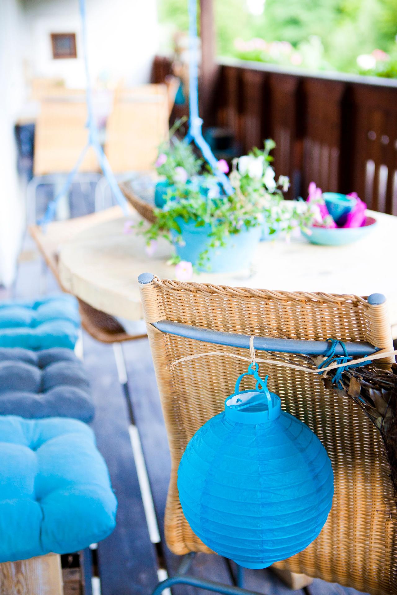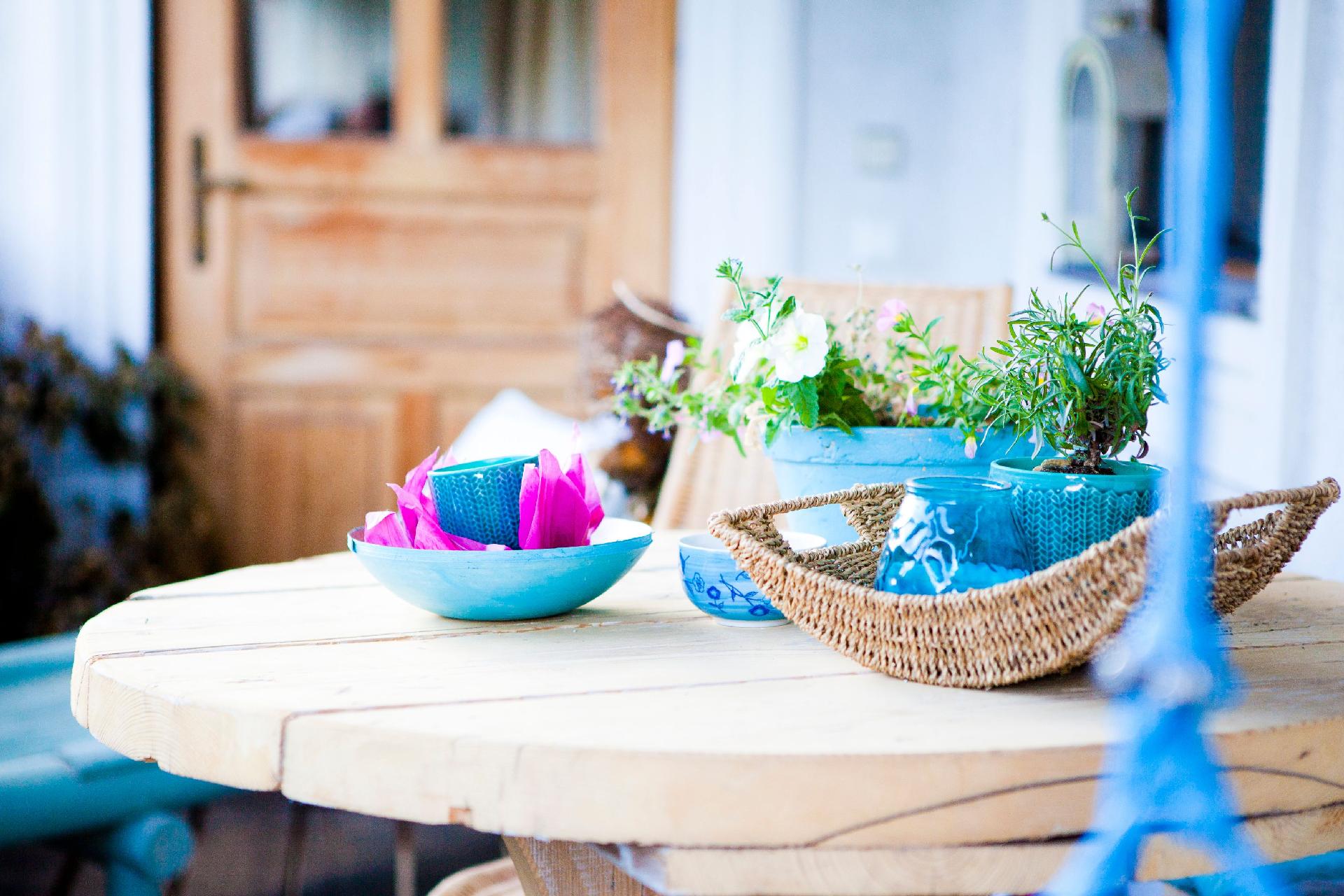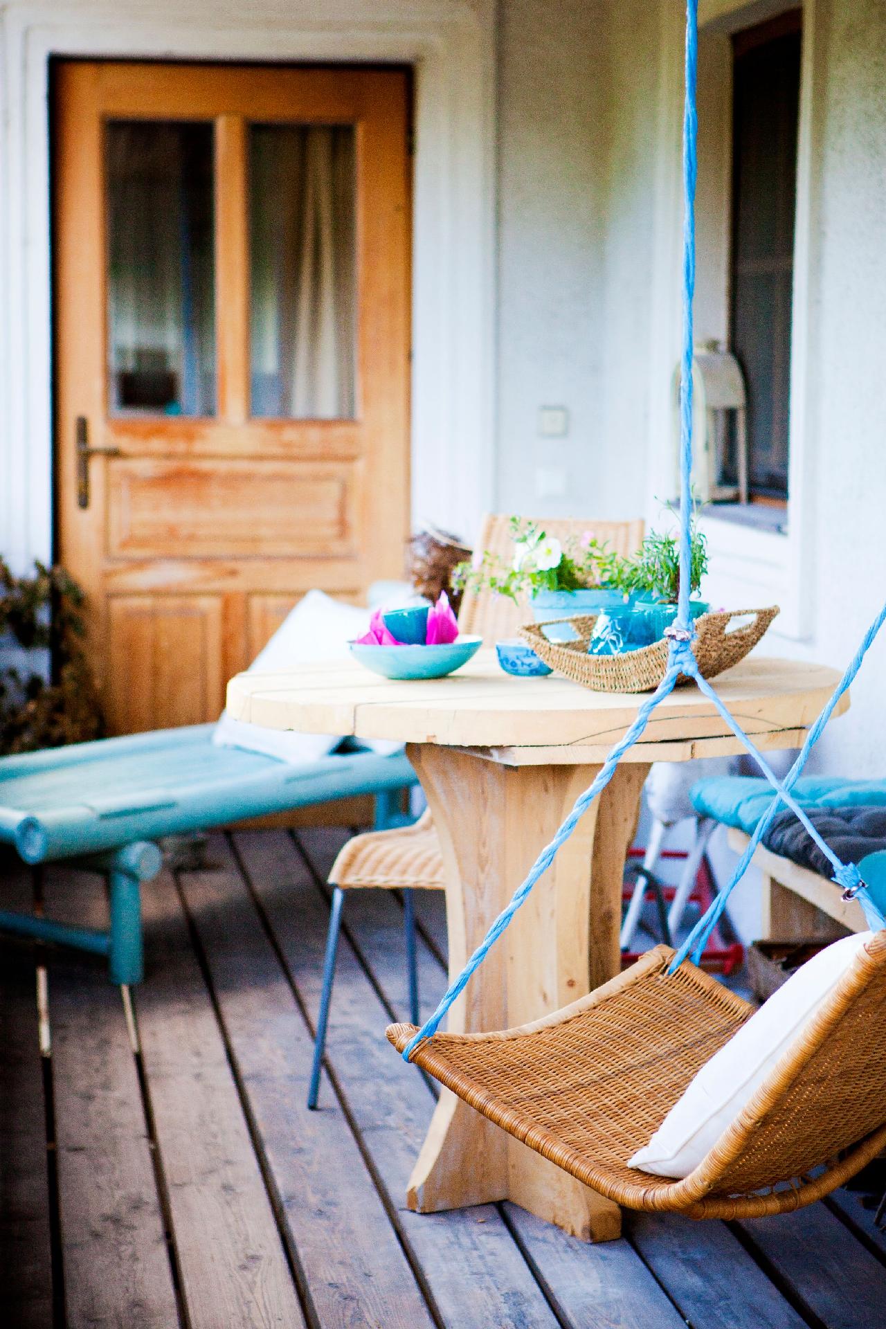 Wir bieten einen Gemeinschaftsbalkon mit einem eigenen Sitzplatz mit Tisch und einer Gartenliege. Der Balkon geht zur Hauptstraße;