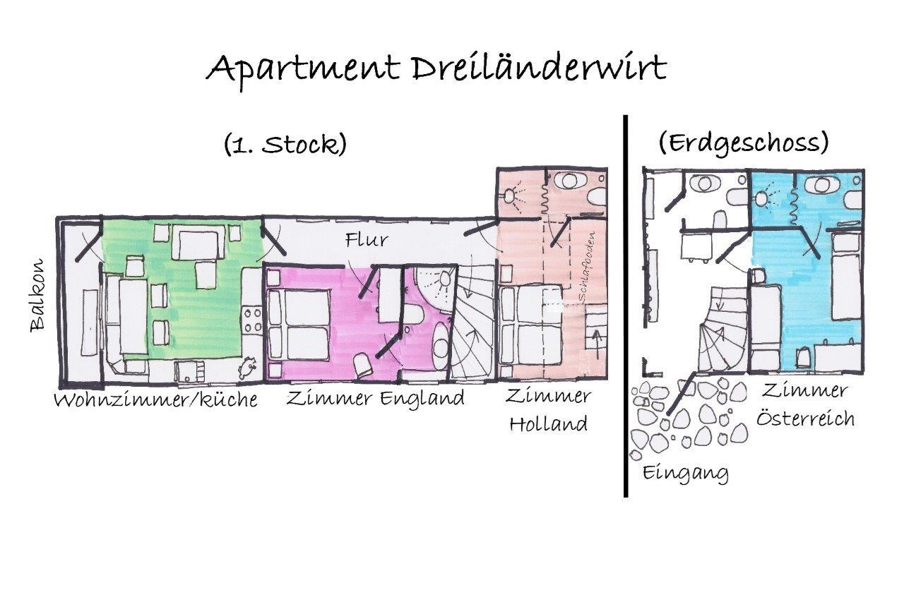 - 1 Schlafzimmer mit Doppelbett (Zimmer England), 1 Schlafzimmer mit 2 Einzelbetten (Zimmer Österreich), 1 Schlafzimmer mit 2 Einzelbetten und Hochbett mit 2 Schlafplätzen (Familienzimmer Holland).