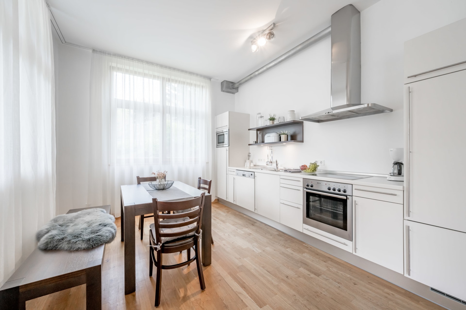 • Offen zur voll ausgestatteten Küche mit Sitz-Essecke