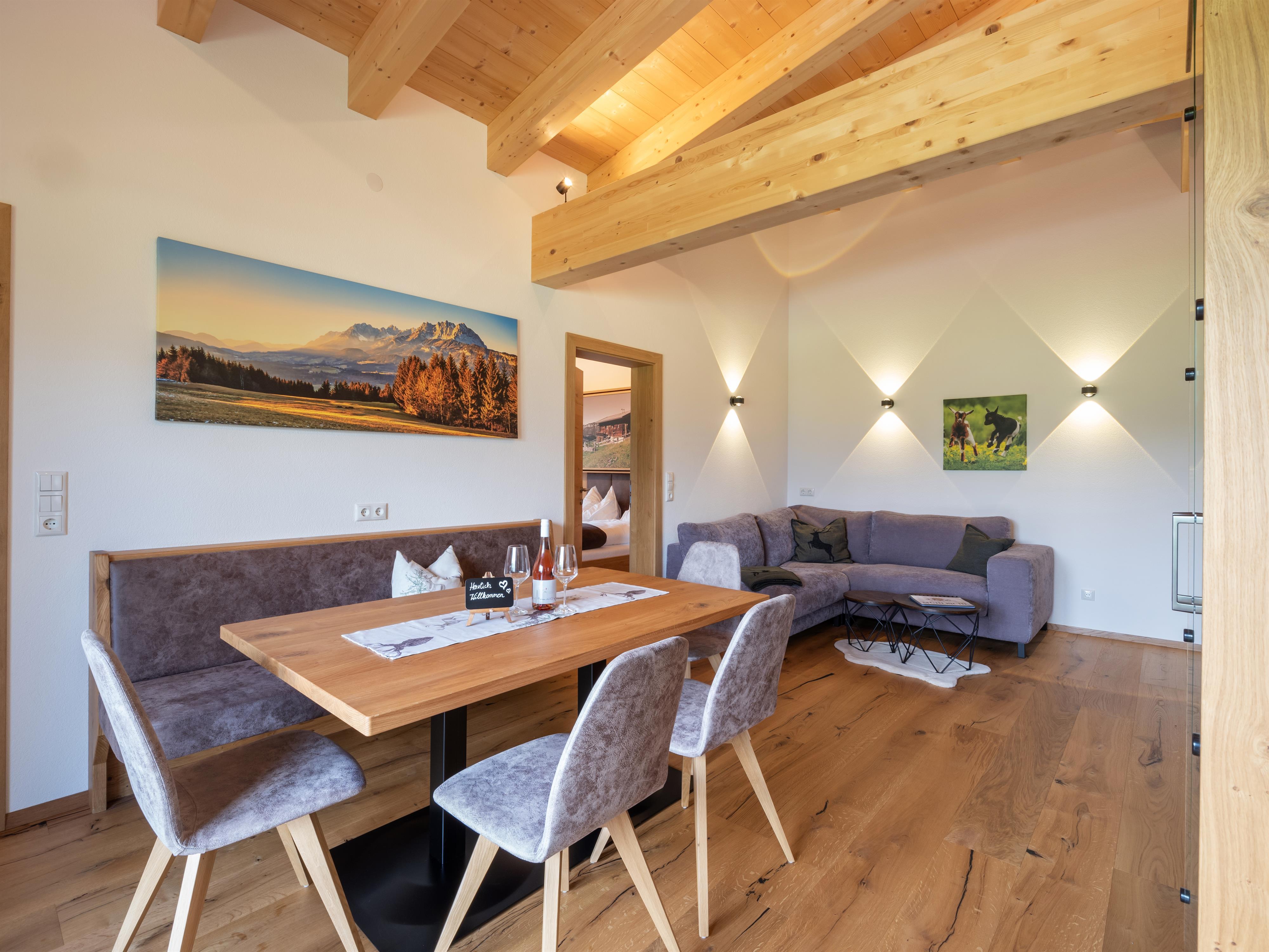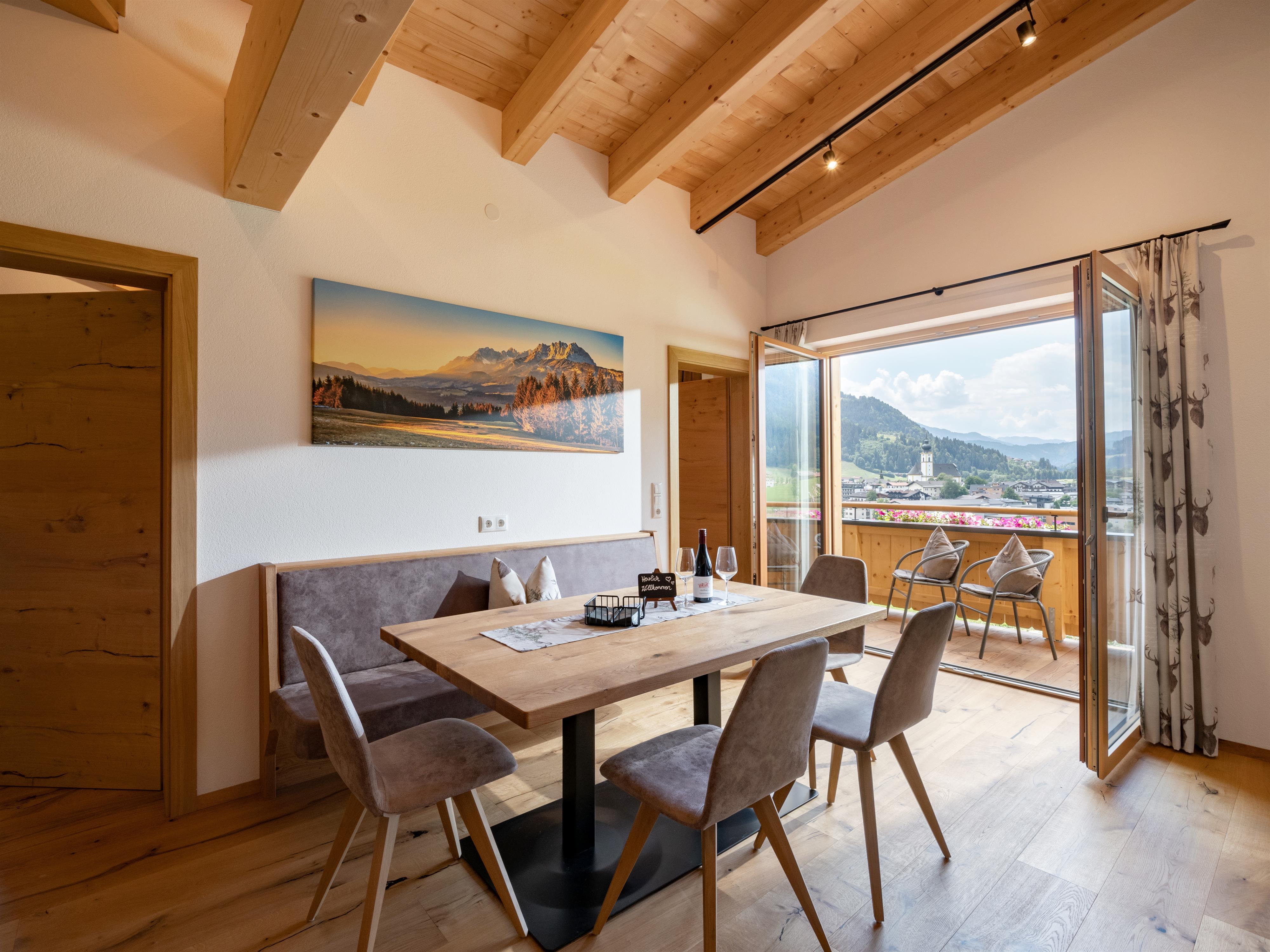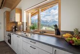 Weiters kommen Sie vom Eingangsbereich durch die Küche, die mit einzigartigem Blick auf den Wilden Kaiser eine ideale Möglichkeit bittet beste Gerichte auf den Tisch zu zaubern und nebenbei den herrlichen Ausblick zu genießen.