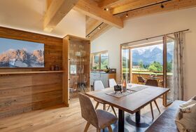 Das Herzstück des Apartments ist der große Esstisch der zum genießen und verweilen einlädt. Im hinteren Teil des Wohnraums befindet sich die Kuschelecke. Ein großzügiges Ecksofa mit Polster und Kuscheldecken diese lädt einfach zum genießen ein.