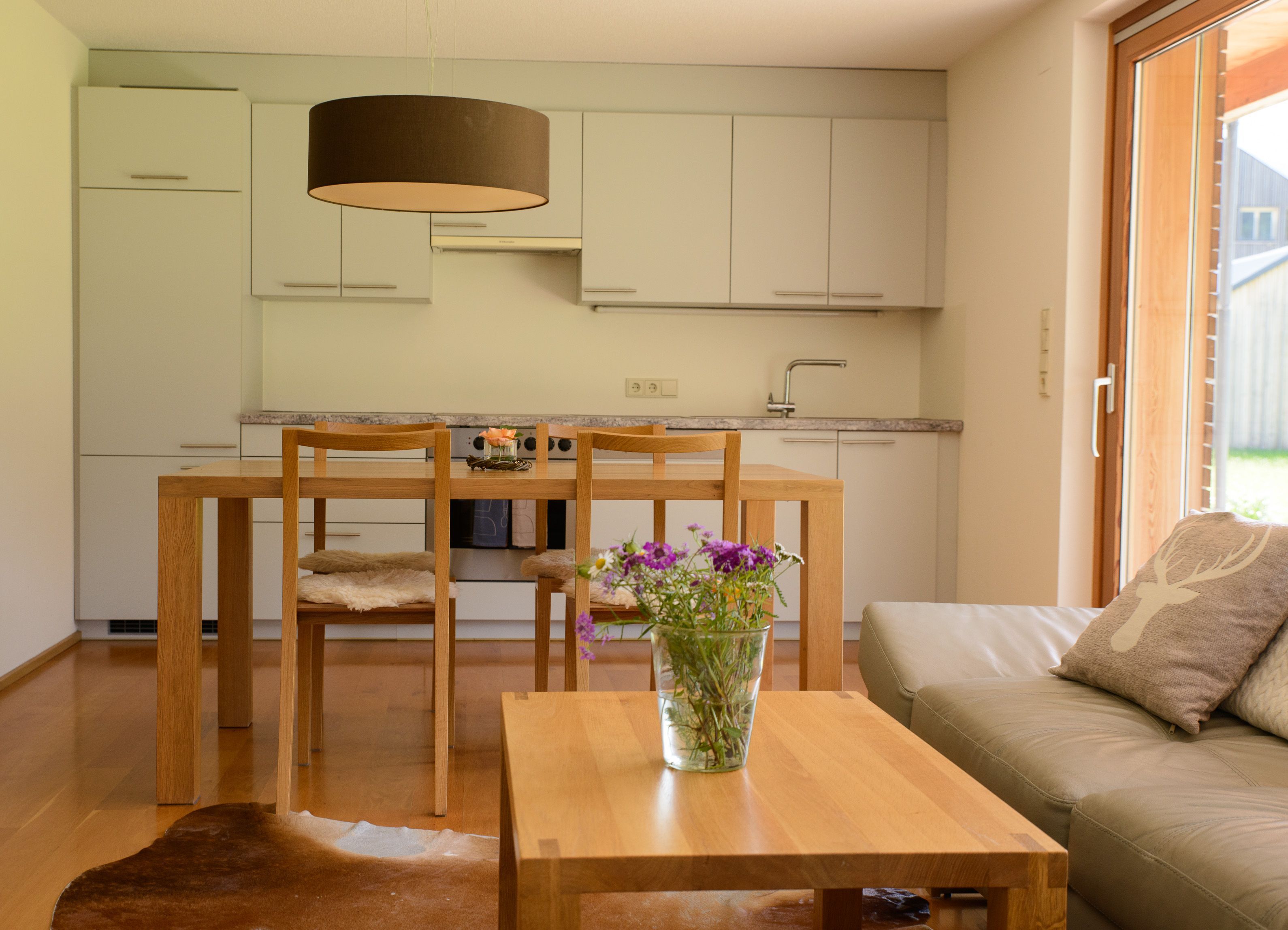 Wohnzimmer mit Couch und Essbereich - Küchenzeile mit Kühlschrank, Elektroherd, Geschirrspüler und Backrohr - 1 Schlafzimmer mit Doppelbett - Badezimmer mit Dusche, WC und Badewanne - Terrasse - TV - Kostenloser WLAN Zugang - Bettwäsche frisch für Sie bezogen - Handtücher - Geschirrtücher - komplettes Geschirr und Gläser sind vorhanden - Waschmaschine - Trockner - Fahrradabstellplatz - Schiaufbewahrungsraum - Liegestühle - pro Ferienwohnung ist ein Parkplatz vorhanden - Benützung von hauseigener Sauna, Schwimmbad und Whirlpool - Haustiere nicht erlaubt - Nichtraucherwohnung