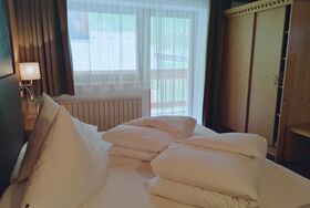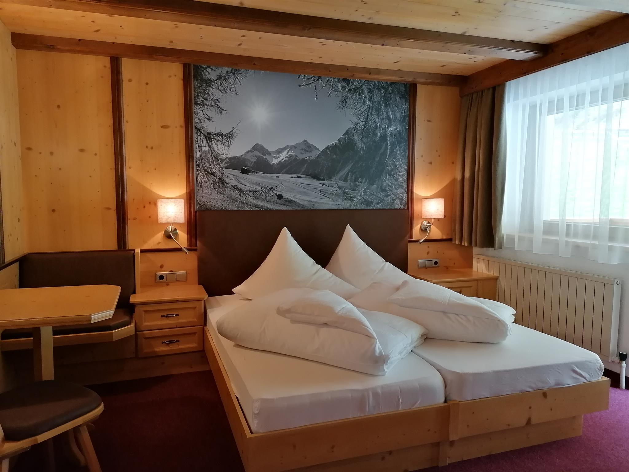 Gemütlich eingerichtetes Doppelzimmer zur Bergseite mit schönem Blick auf die Ötztaler Bergwelt und die Umgebung. Größe: ca. 19 m², 1. Etage