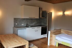 Geräumige Ferienwohnung mit einem Wohn-Schlafraum und integrierter Küchenzeile. Seperater Schlafraum mit 3 Betten. Blick nach Süden zum Hausberg Petzen.