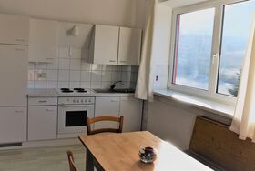 Gemütliche Ferienwohnung mit kombiniertem Wohn-Schlafraum inkl. integrierter Küchenzeile. Separater Schlafraum mit drei Betten. Blick nach Süden auf den Hausberg Petzen und den Feistritzbach nach Westen.