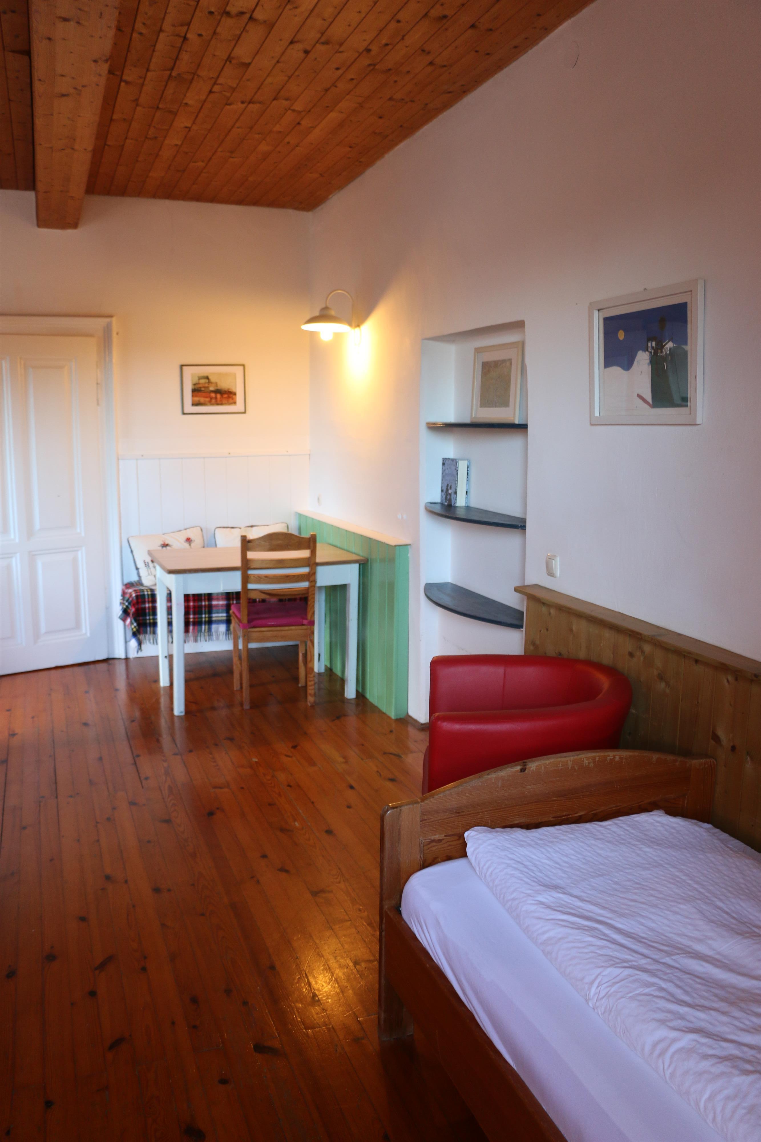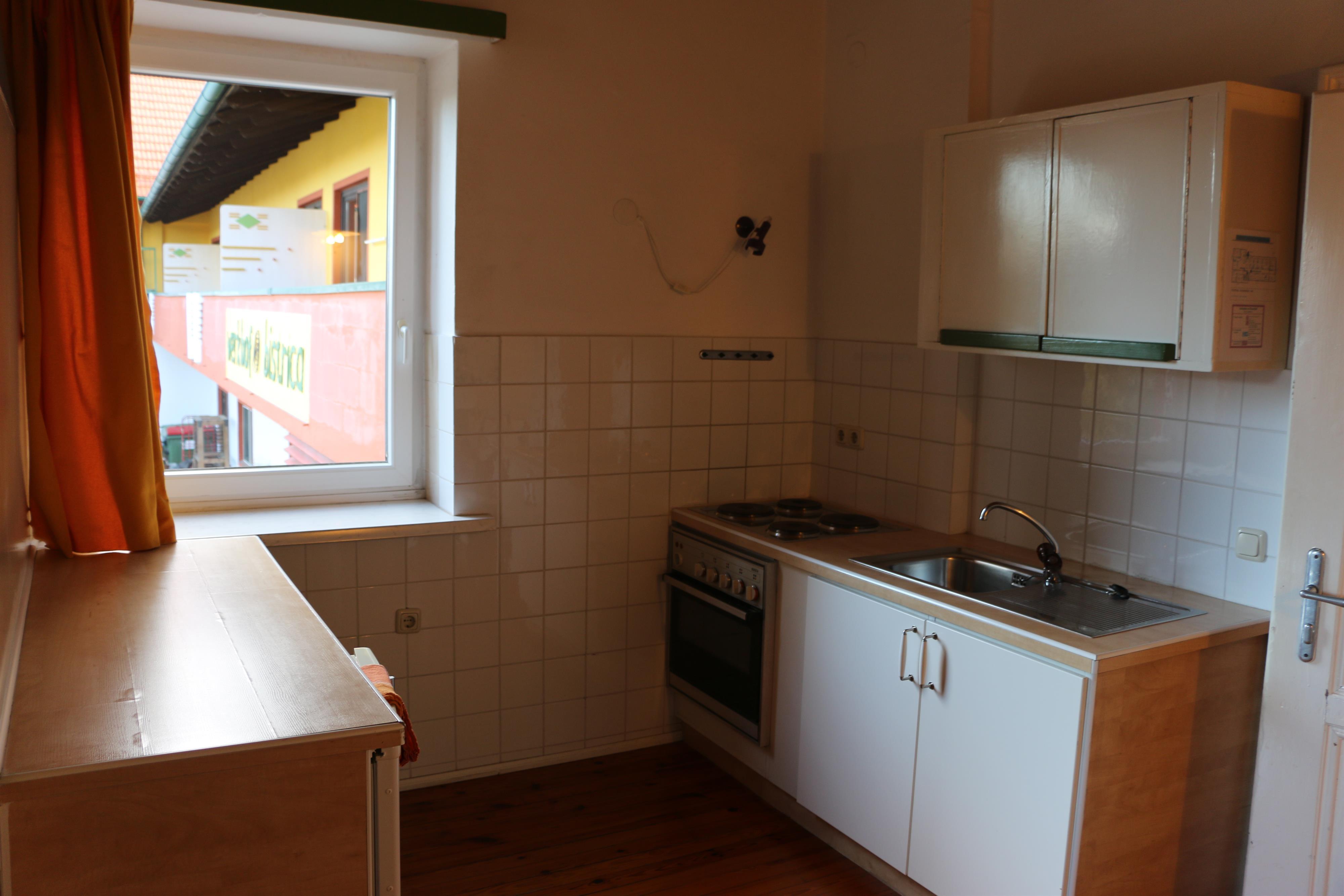Gemütliches Ein-Zimmer-Appartment - Der Küchenbereich wird duch einen Kleiderschrank vom Schlafbereich getrennt. Blick nach Westen, zum Garten und in den Innenhof.