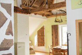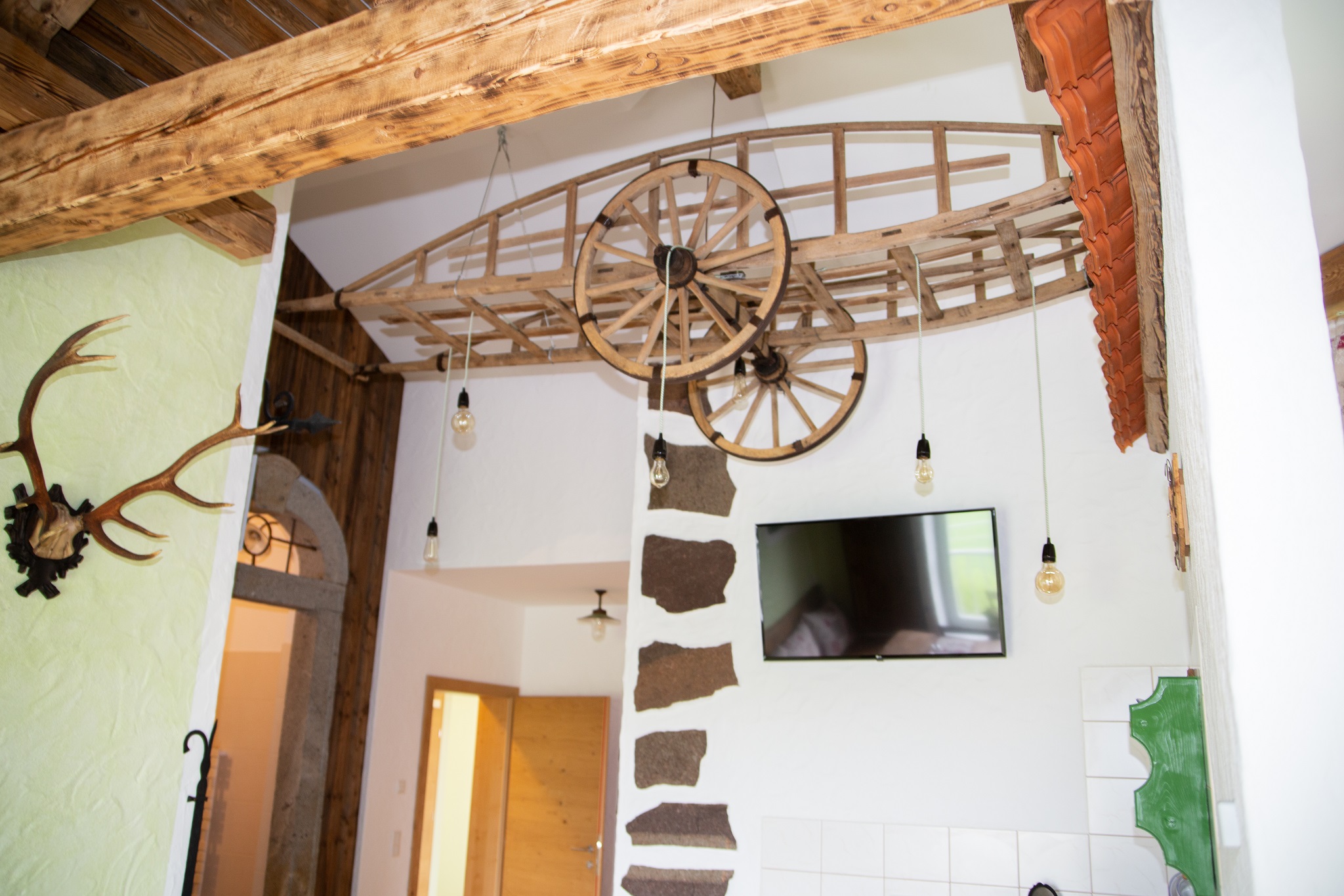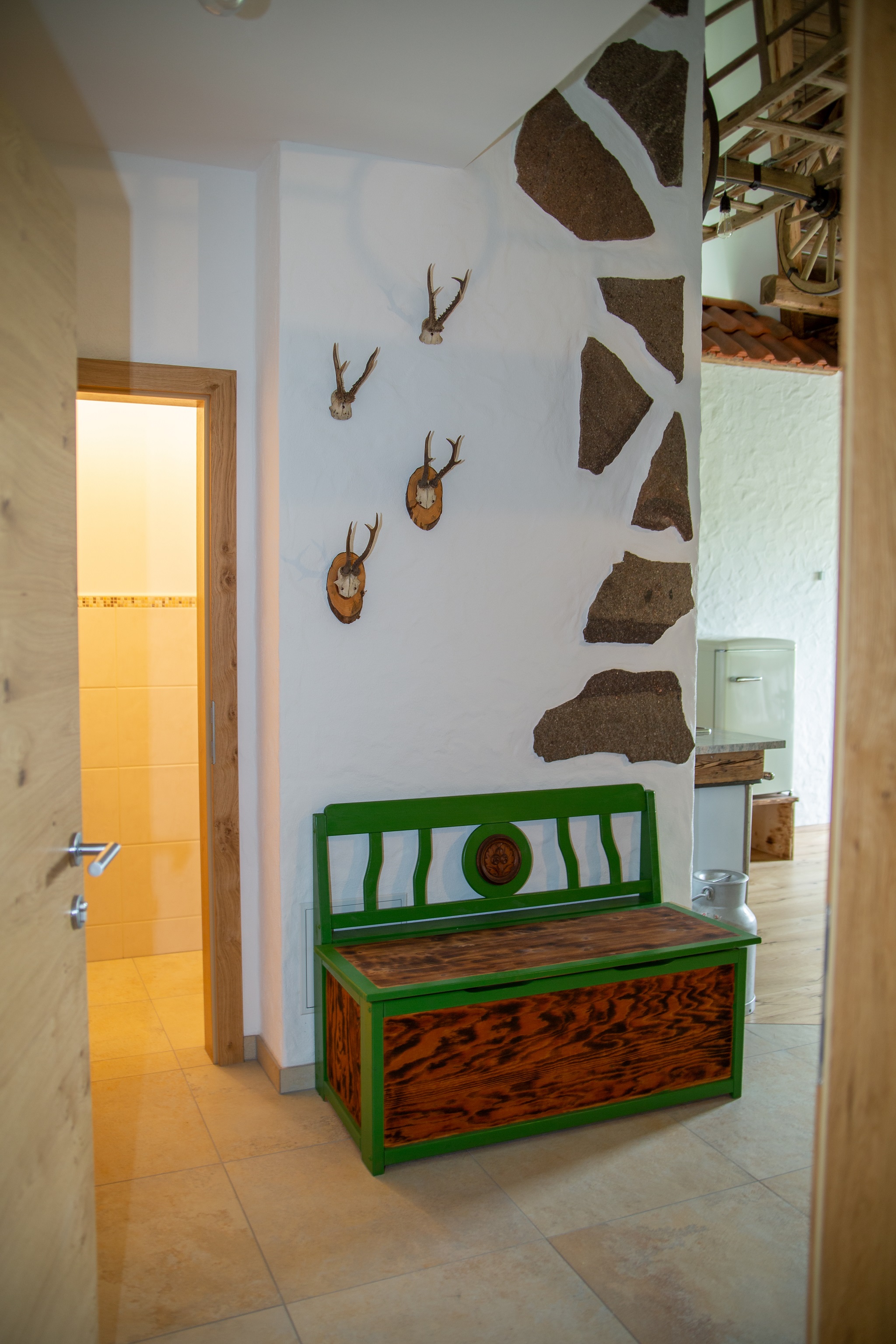 Diese Ferienwohnung ist ausgestattet mit 2 Fernsehern sowie einer Küchenzeile mit uriger Eckbank. Die Duschhalle überrascht mit einer gemütlichen Bank und einer Fass-Regendusche. Das WC ist separat. Für eure Kinder gibt es ein eigenes Kinderzimmer.