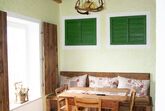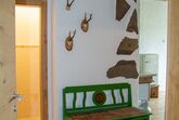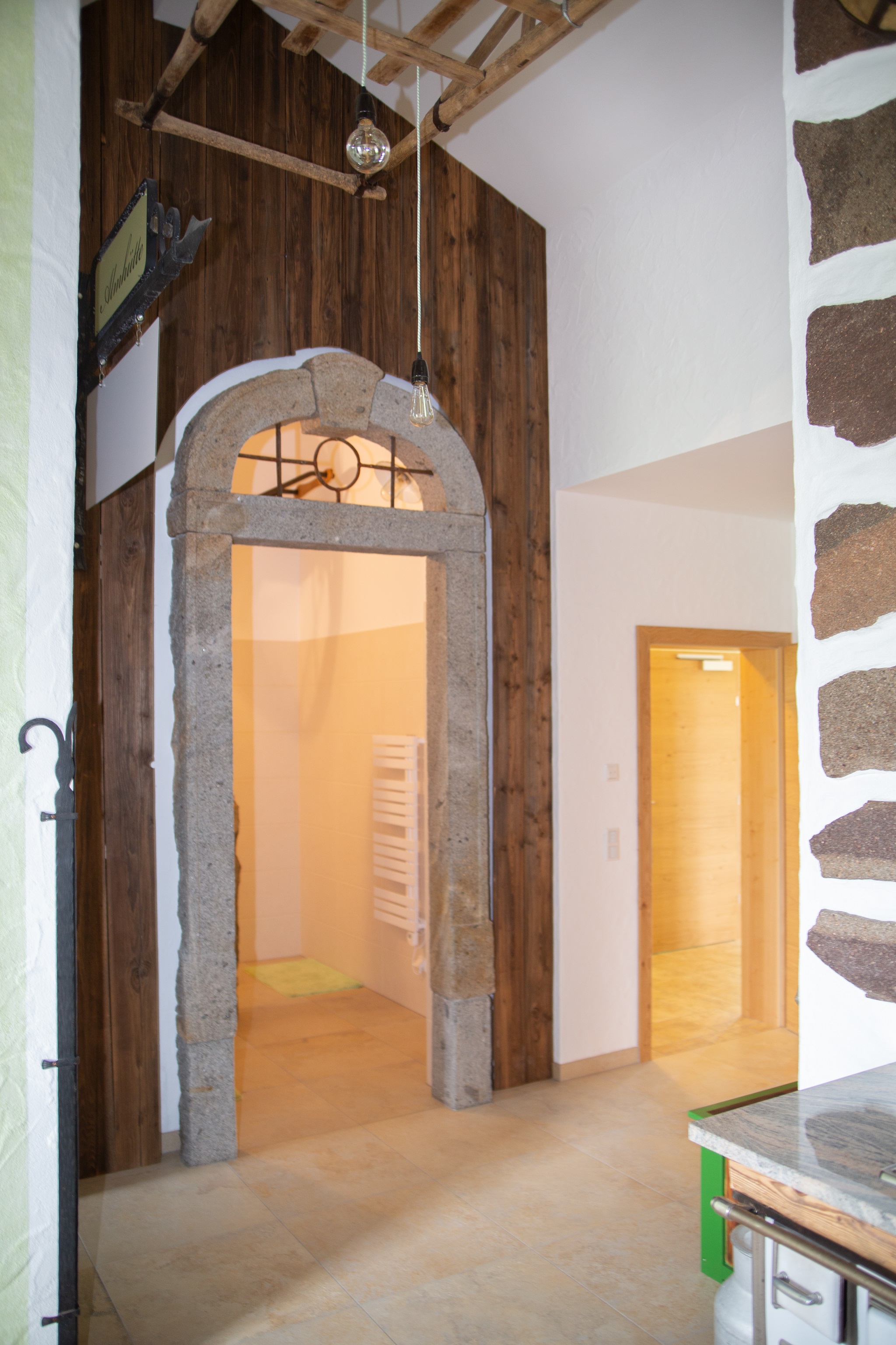 Diese klimatisierte, im Almhüttenstil gestaltete Ferienwohnung (65 m²) ist mit vielen Extras wie Steinbogeneingang in die Duschhalle und selbstgebauten Möbeln ausgestattet.