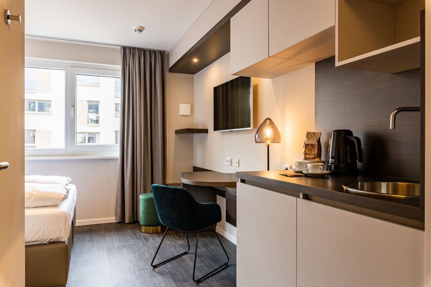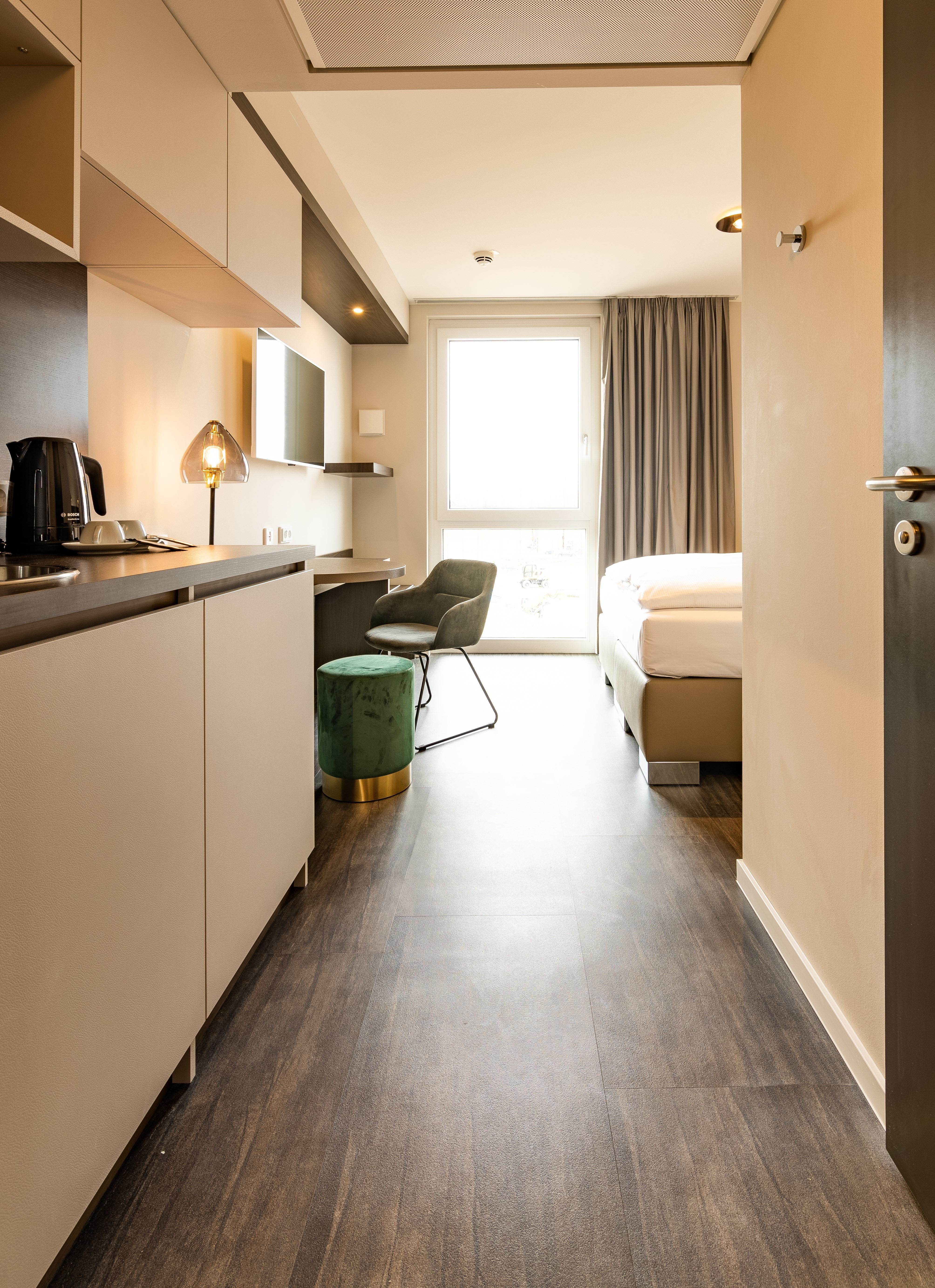 In unseren hochwertigen Serviced Apartments fühlen Sie sich fast wie zuhause. Unser Lobbykonzept mit z.B. Supermarkt, Fitness uvm. lässt keine Wünsche offen. Home is where MASEVEN is.