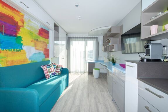 Wer auf der Suche nach den eigenen vier Wänden zum Zurückziehen ist, dabei aber nicht auf spontane Begegnungen mit Gleichgesinnten verzichten möchte, ist in den Apartments von The Brucklyn genau richtig. Hier sind nicht nur sämtliche Zusatzleistungen bereits inklusive – wir bieten auch vielfältige Sport-, Wellness- und Entertainmentangebote: entspannen auf der Roof-Terrasse mit Pool, trainieren im Indoor- und Outdoor-Gym, saunieren im Winter, gamen im Foyer, Pasta kochen in der Cooking Lounge, konzentriert lernen in der Hausbibliothek, Filme genießen im hauseigenen Kino, Billard spielen auf der Galerie oder sportlich aktiv sein beim Basketball oder Fußball. Wichtig : Bei Anreisen nach 17 Uhr unter der Woche sowie generell am Wochenende bitten wir Sie, vorab Kontakt mit dem Hotel aufzunehmen.
