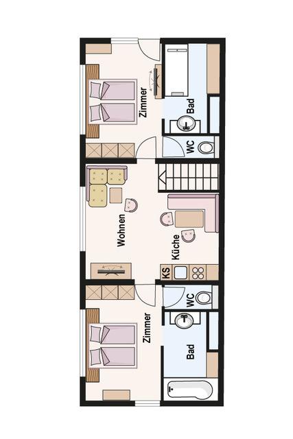 Neue Ferienwohnung mit ca. 50 m² und für 2-4 Personen geeignet. Wie Wohnung liegt im Dachgeschoß und besteht aus zwei Doppelzimmer und zwei Badezimmer mit Dusche/WC bzw. Badewanne/WC, Fön, und Kosmetikspiegel. Separate Wohnküche mit 4-Platten Herd, Mikrowelle, Kühlschrank, Geschirrspüler, Toaster, Kaffeemaschine (Nespresso), Besteck, Küchen- und Essgeschirr. Weitere Ausstattung TV und kostenloses W-Lan.