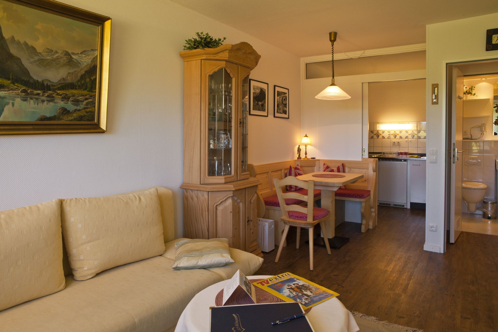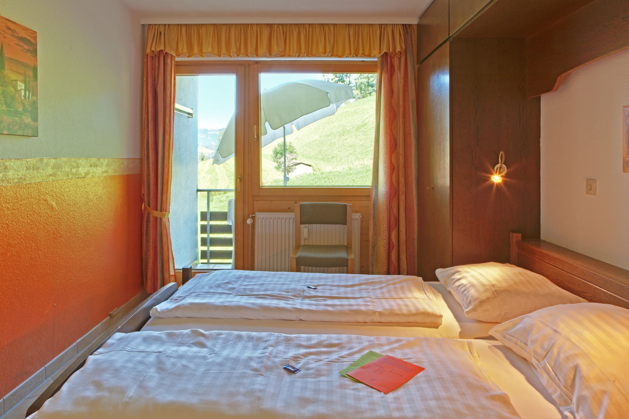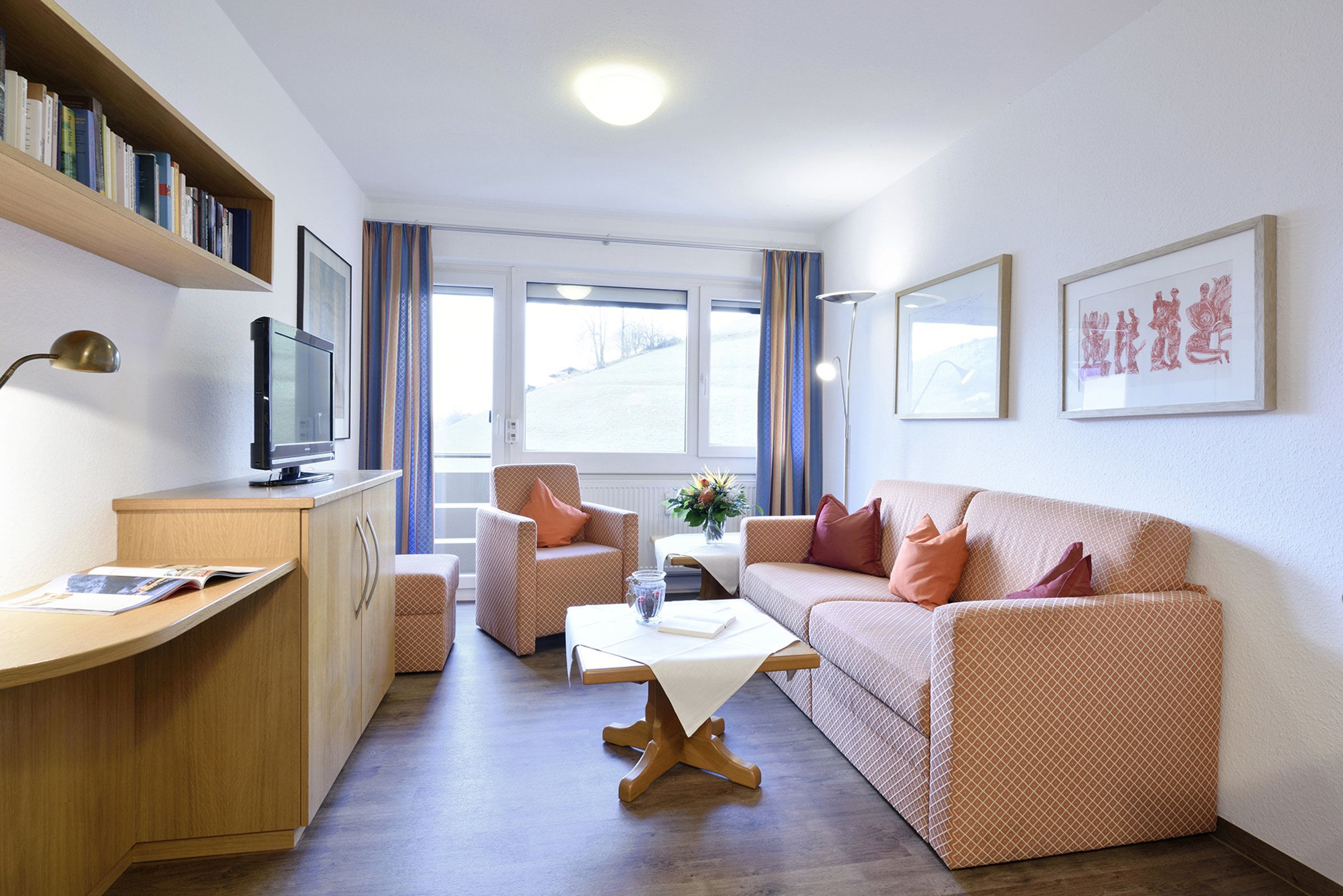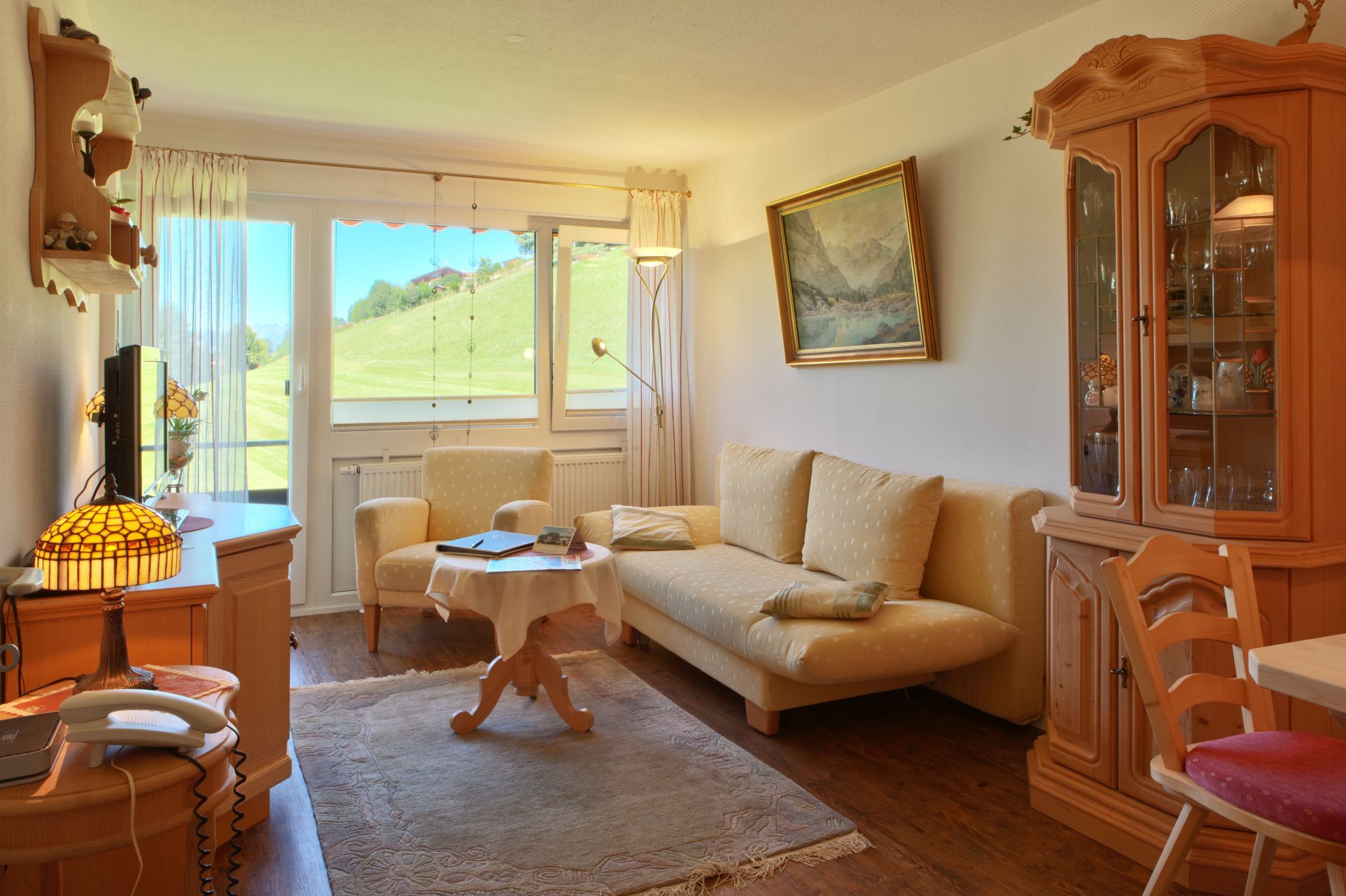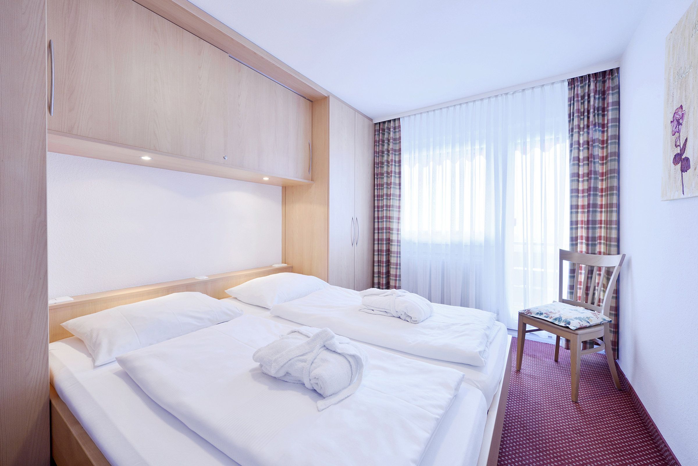 Hotelappartements statt Einzel und Doppelzimmer (45qm, Wohnzimmer mit Schlafcouch, Schlafzimmer, Küche, Bad/WC oder Dusche/WC, Balkon, Sat-TV, Telefon. Kategorien: Komfort (HRS-Standard), Premium (HRS-Komfort). Jeder Gast (außer Geschäftsreisende) erhält die Bad Hindelang Plus Card mit kostenlosen Angeboten: Bergbahnen, Busse, Erlebnisbäder, Skipass im Winter Halbpension (abends) vor Ort buchbar