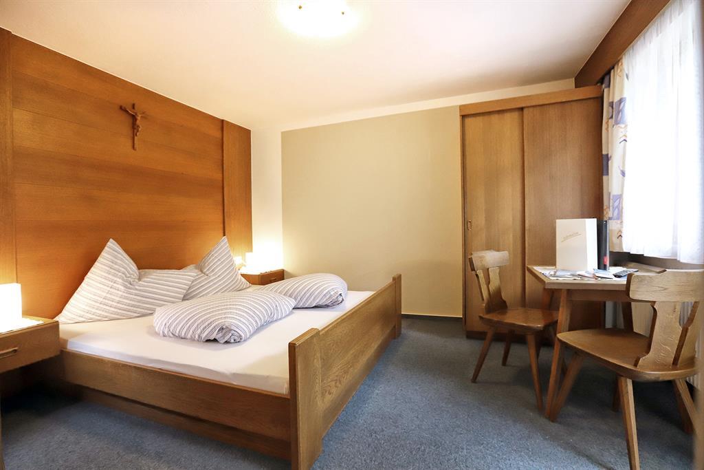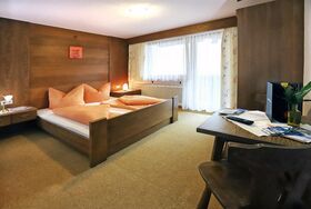 Komfortables Doppelzimmer mit viel Holz im typischen Tiroler Stil eingerichtet, Badezimmer mit Dusche/WC, Flat-TV und Balkon mit Sitzmöglichkeit.