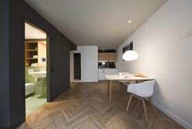 Ihr Zuhause auf Zeit - Perfekt eingerichtet - Vollständig ausgestattet - Unterwegs Zuhause fühlen! Besonders für längere Aufenthalte sind die Apartments eine wohnliche Alternative zum Hotelzimmer. Hier kommen Sie in den Genuss einer durchdachten, hochwertigen und warmen Ausstattung. Dank einer vollständig ausgestatteten Kitchenette (inkl. Ceranfeld, Spüle, Spülmaschine, Nespresso Maschine, Mikrowelle, Wasserkocher, Geschirrset und Besteck, Toaster, uvm.) können Sie eine unbeschwerte Zeit in unseren Apartments genießen. Wer sich lieber bekochen lässt, besucht das Restaurant Dean & David im Ergeschoss.