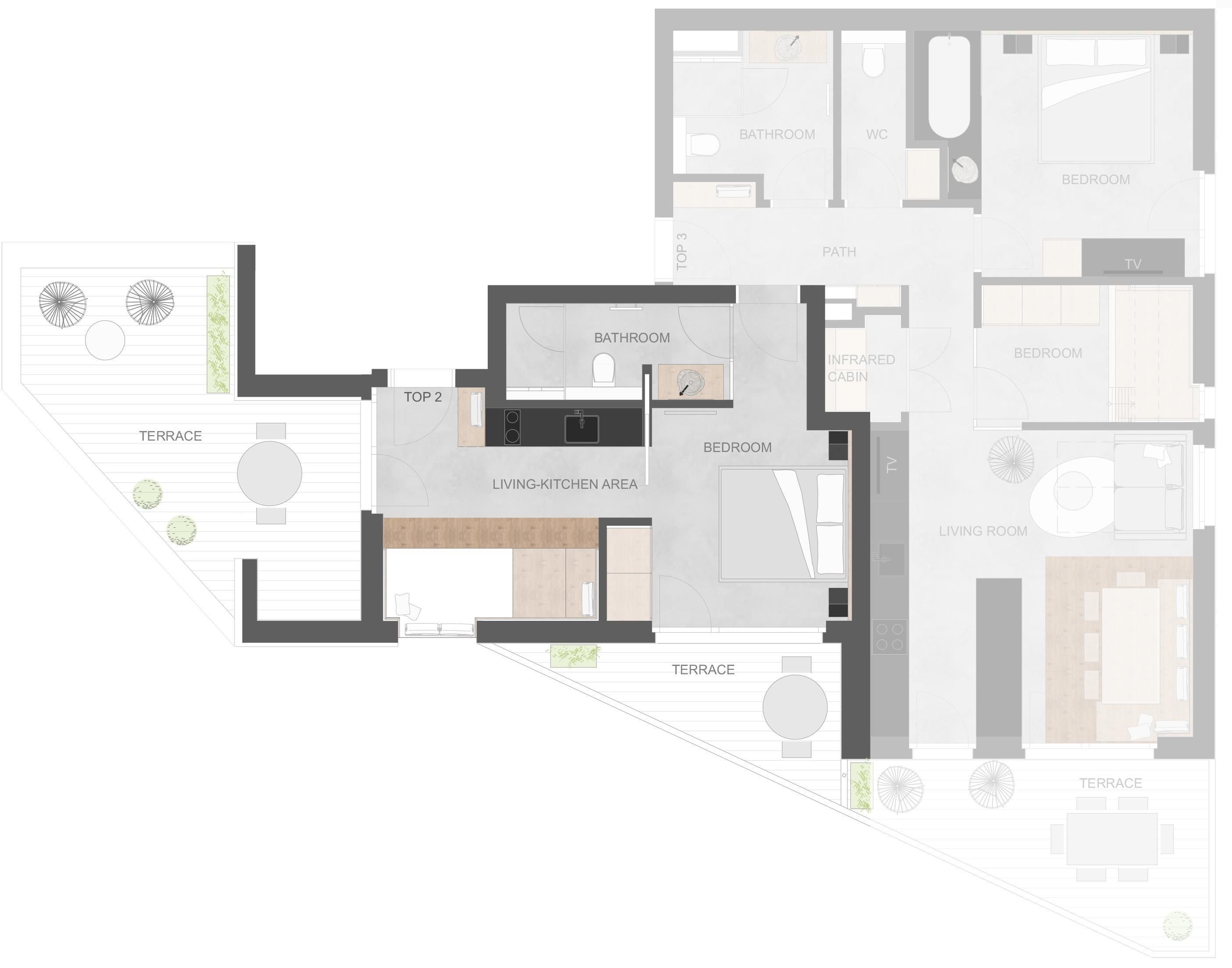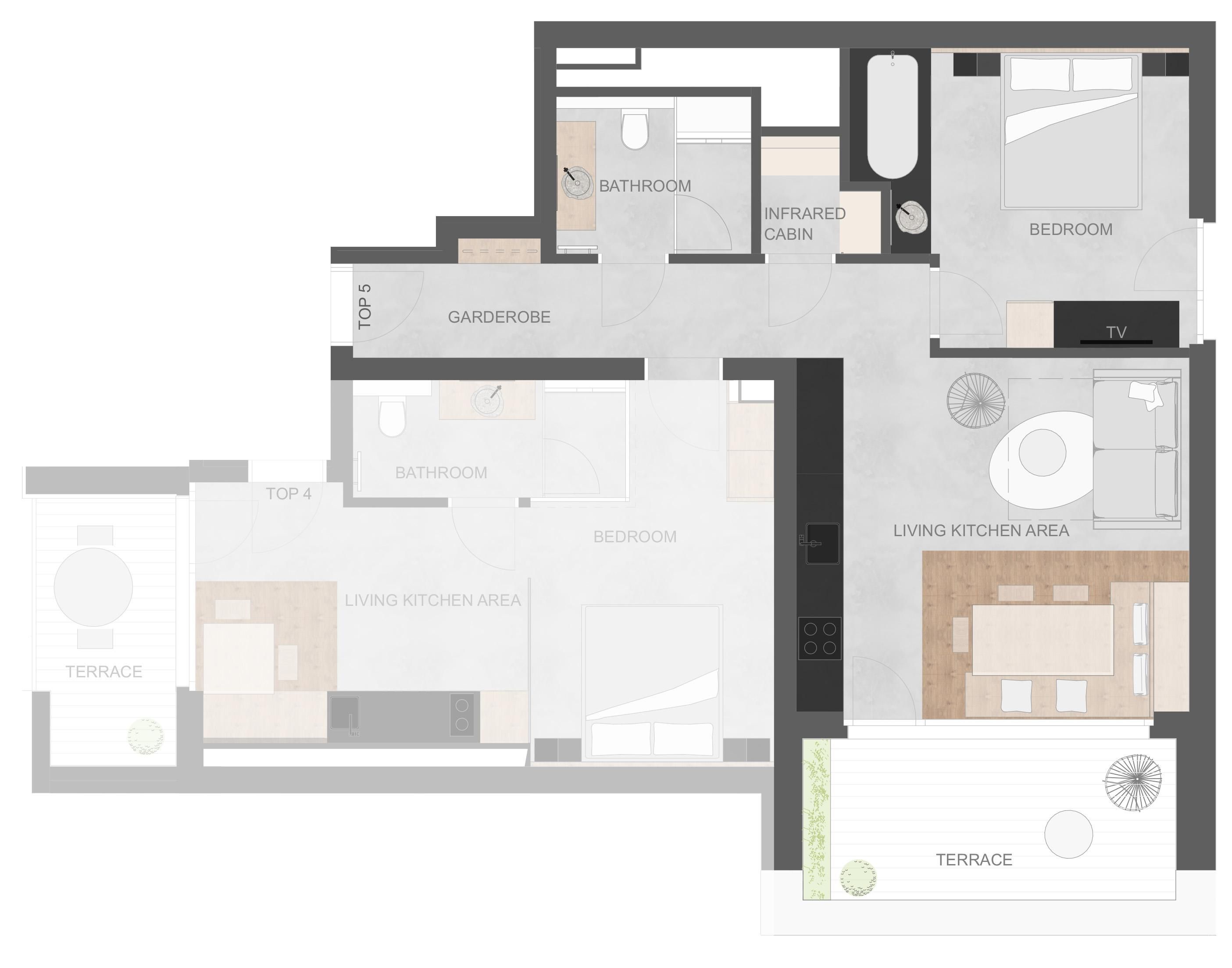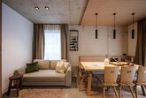 Das Ferienapartment mit seinen großzügigen 64,28 m² bietet Familien ausreichend Platz zum Wohlfühlen. Eine Infrarotkabine, eine Badewanne im Schlafzimmer, und eine nach Süden ausgerichtete Terrasse mit HotPot laden zum Nichtstun und Sonne tanken ein. Das Apartment kann mit bis zu 6 Personen belegt werden, da sich neben dem King Size Boxspringbett im Schlafzimmer und dem Stockbett im separaten Schlafzimmer ein gemütliches Schlafsofa im Wohnbereich befindet. Des Weiteren wartet im Wohn-Essbereich eine vollausgestattete Küche mit Kochinsel und einladender Sitzecke mit Stubenoptik. Für Wellness-Faktor sorgen die Infrarotkabine, sowie die Badewanne im Schlafzimmer.