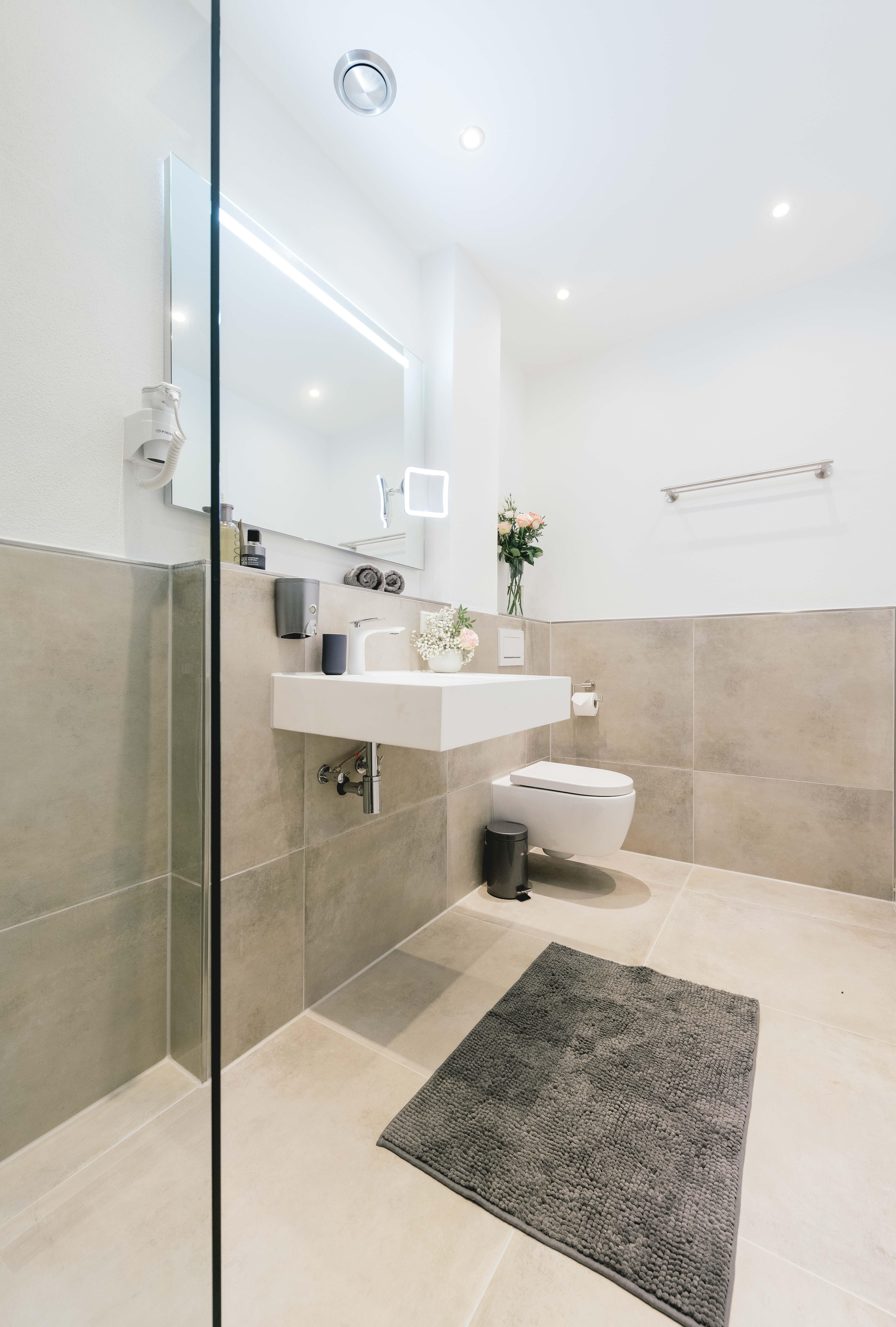 Die ebenerdigen Duschen mit Glasabtrennungen und zusätzlicher Regendusche sorgen für absolute Behaglichkeit nach einem angespannten Tag und geben Raum zur Regeneration. Sie werden sich in unseren großzügigen, hellen und modernen Zimmern wie zu Hause fühlen. Unsere Boxspringbetten laden zum Träumen auf Wolke sieben ein.
