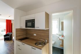 Alle Zimmer sind mit Dusche/WC, Haarfön, Kabel-TV, kostenfreies WLAN, kleiner Küchenzeile mit großem Kühlschrank und einem Ess- oder Arbeitstisch ausgestattet.