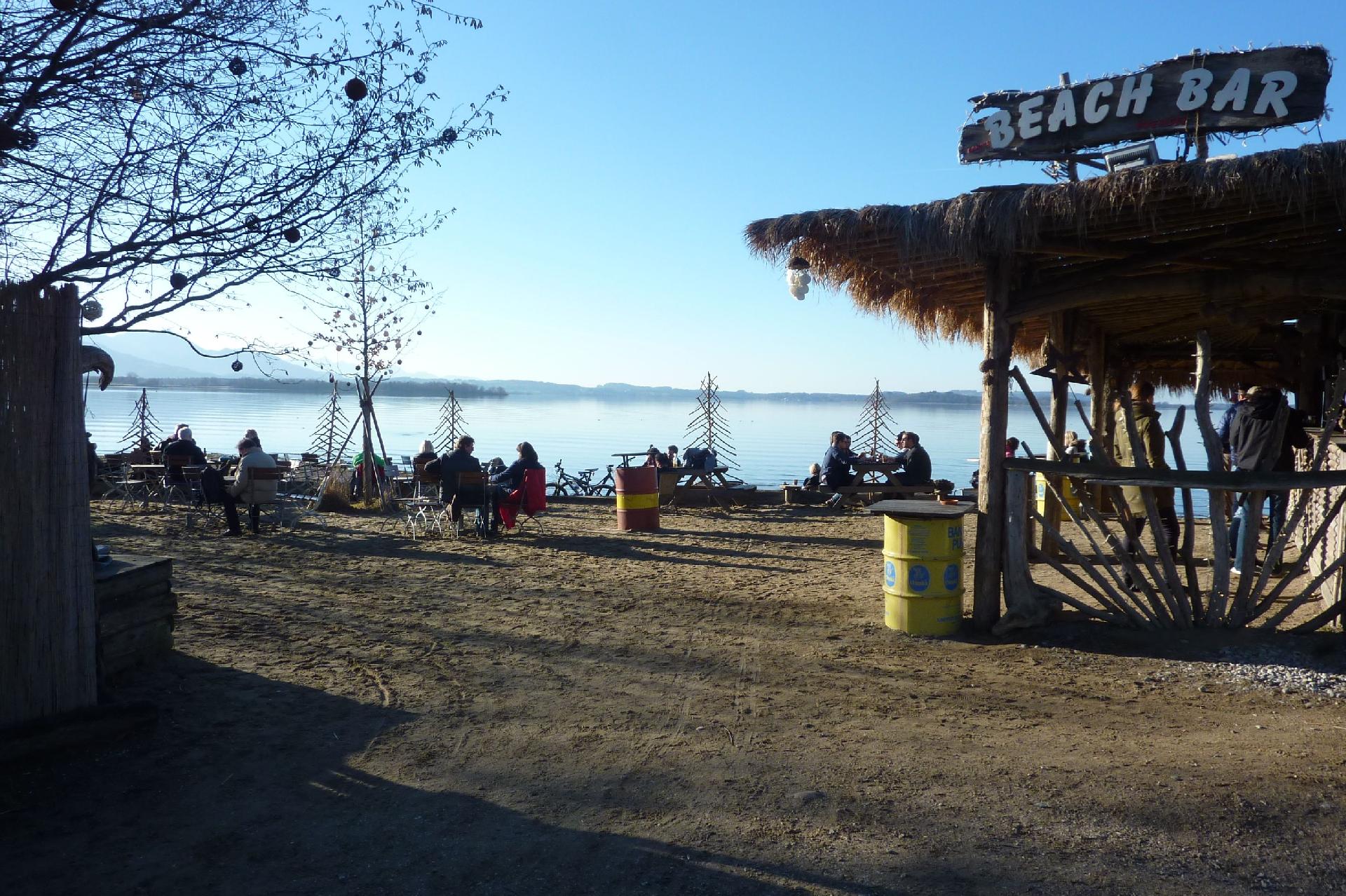 Wer abends etwas erleben möchte, spaziert in die Feldwieser Bucht (13 Minuten) – dort erwarten Sie mehrere Strandbars mit Musik, Liegestühlen, Hängematten und karibischem Flair. Tagsüber ist die Bucht eines der schönsten Strandbäder am Chiemsee.