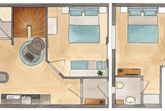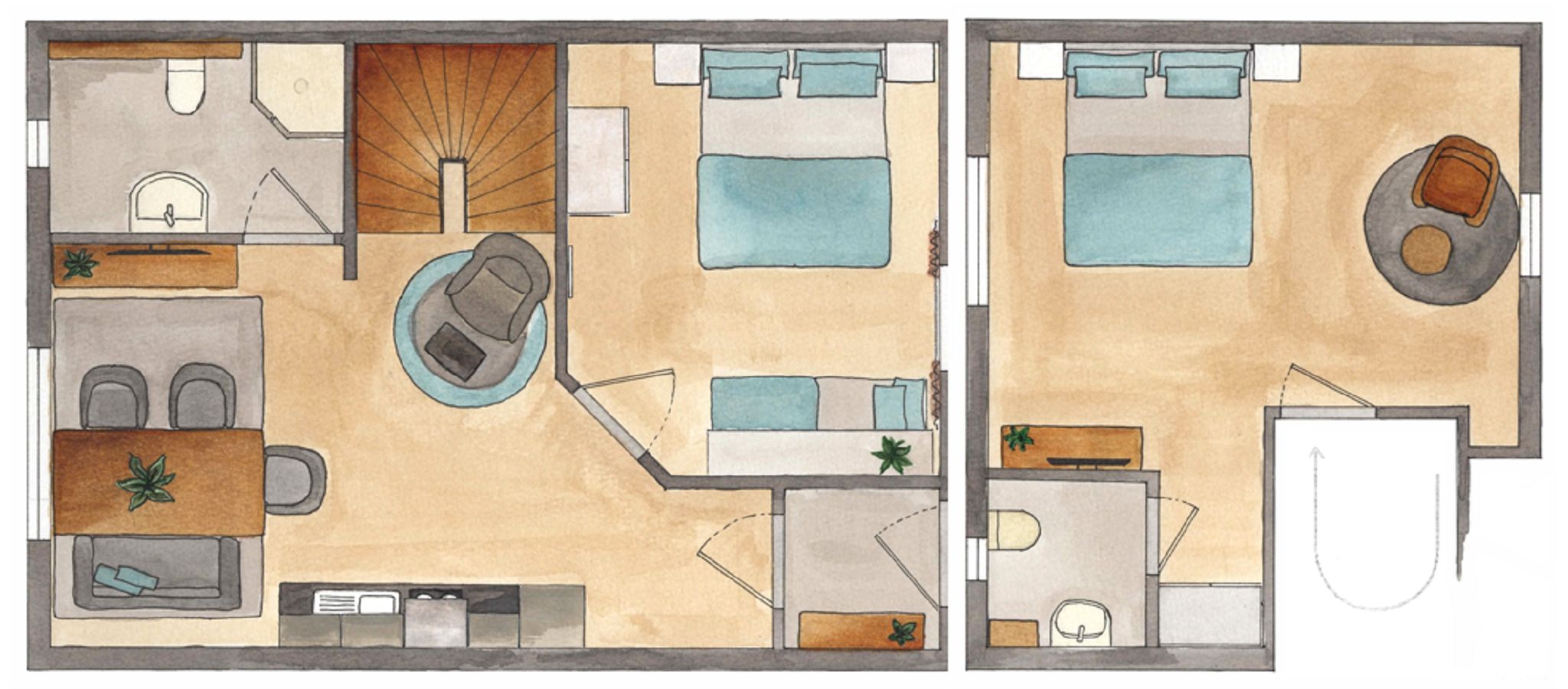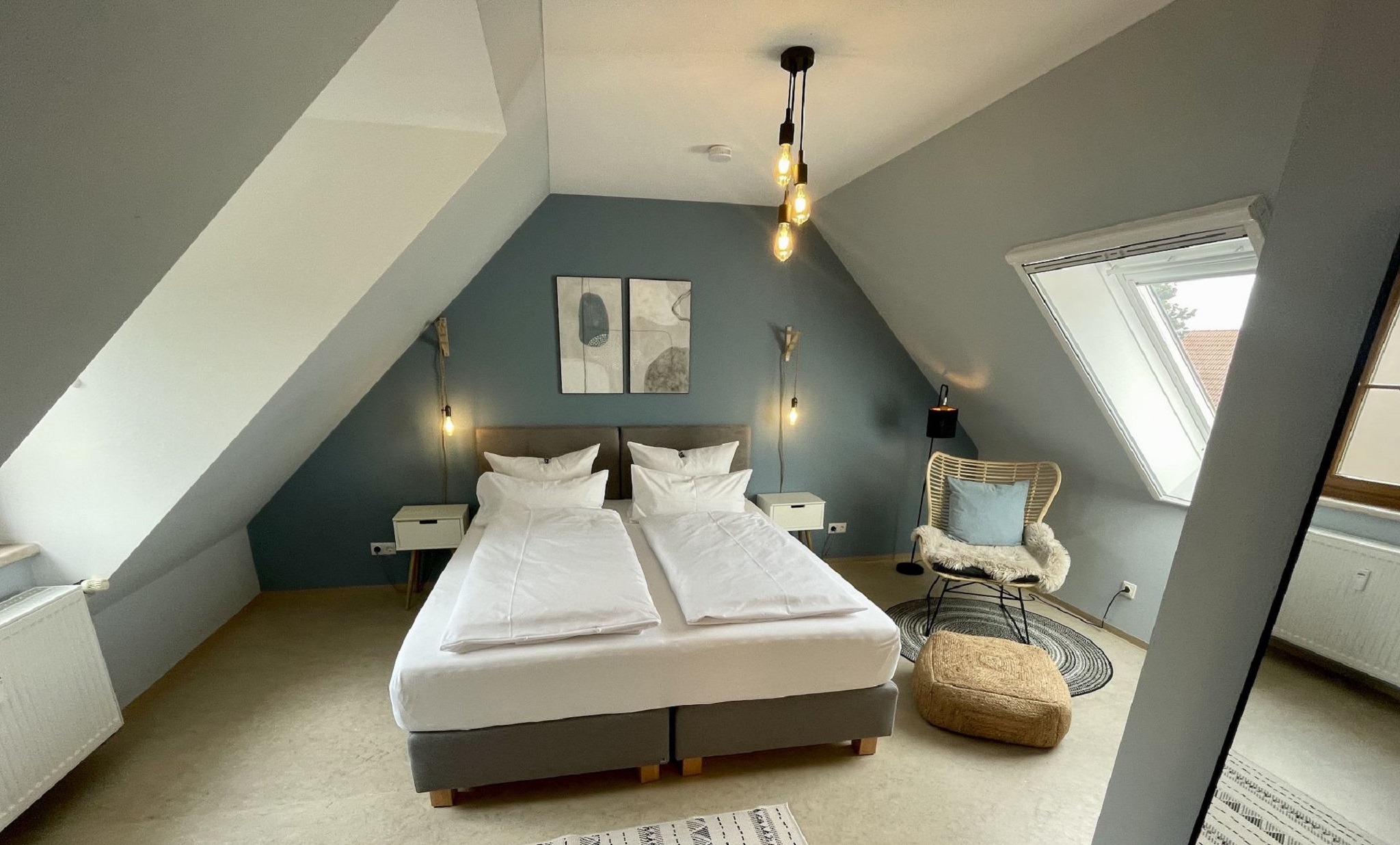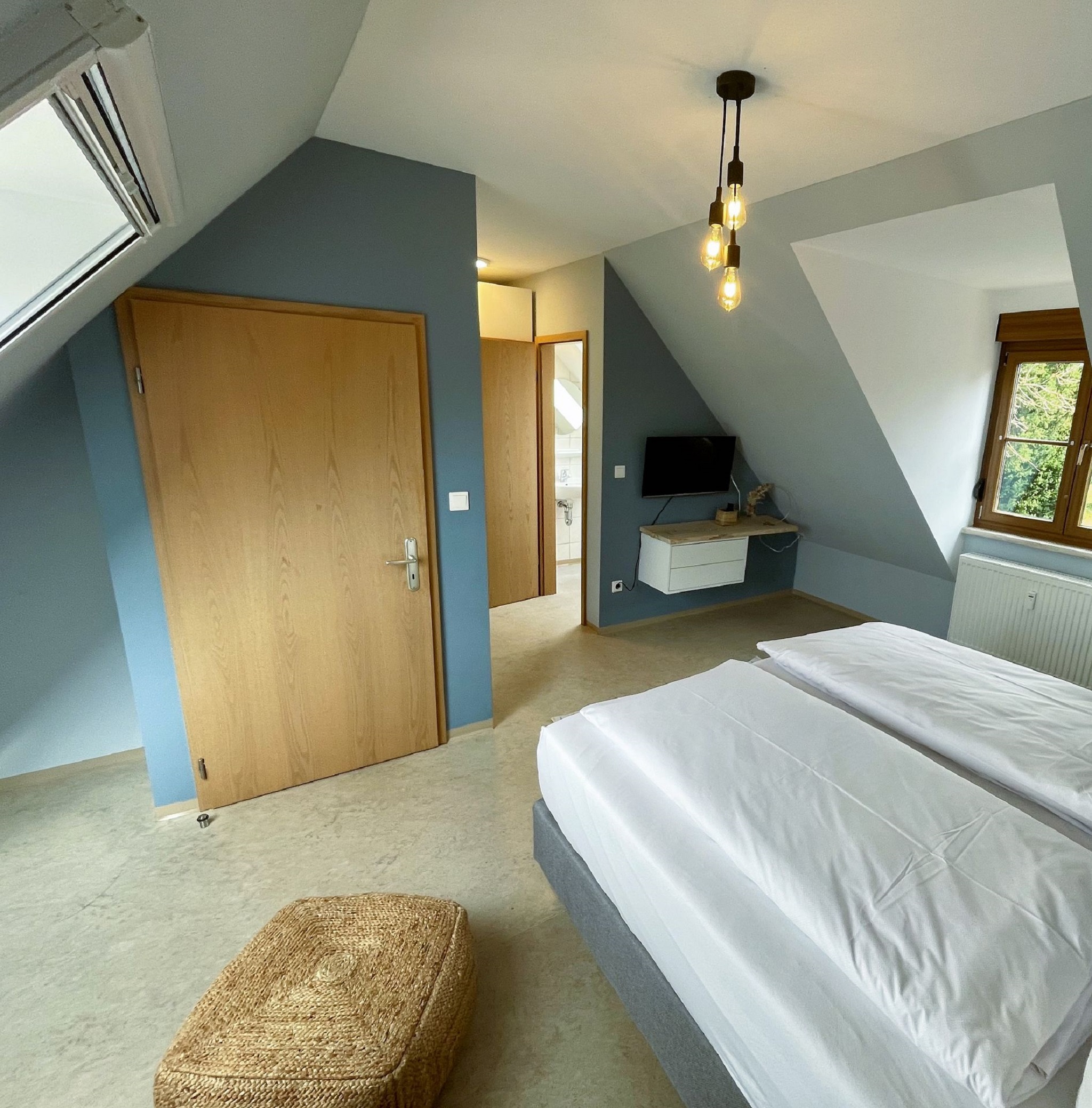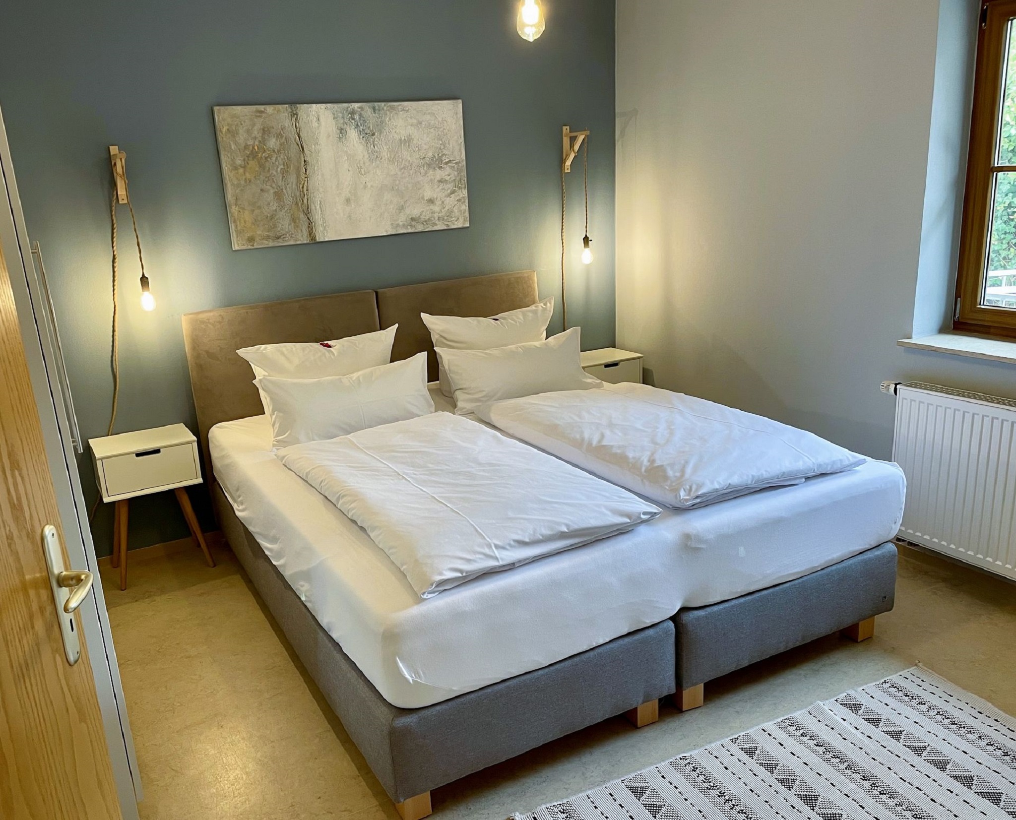 Im Schlafzimmer im Erdgeschoss findet ihr ein gemütliches Boxspringbett und ein modernes Schrankbett. Das Schlafzimmer im Obergeschoss verfügt neben einem weiteren Boxspringbett auch über ein eigenes angrenzendes WC.