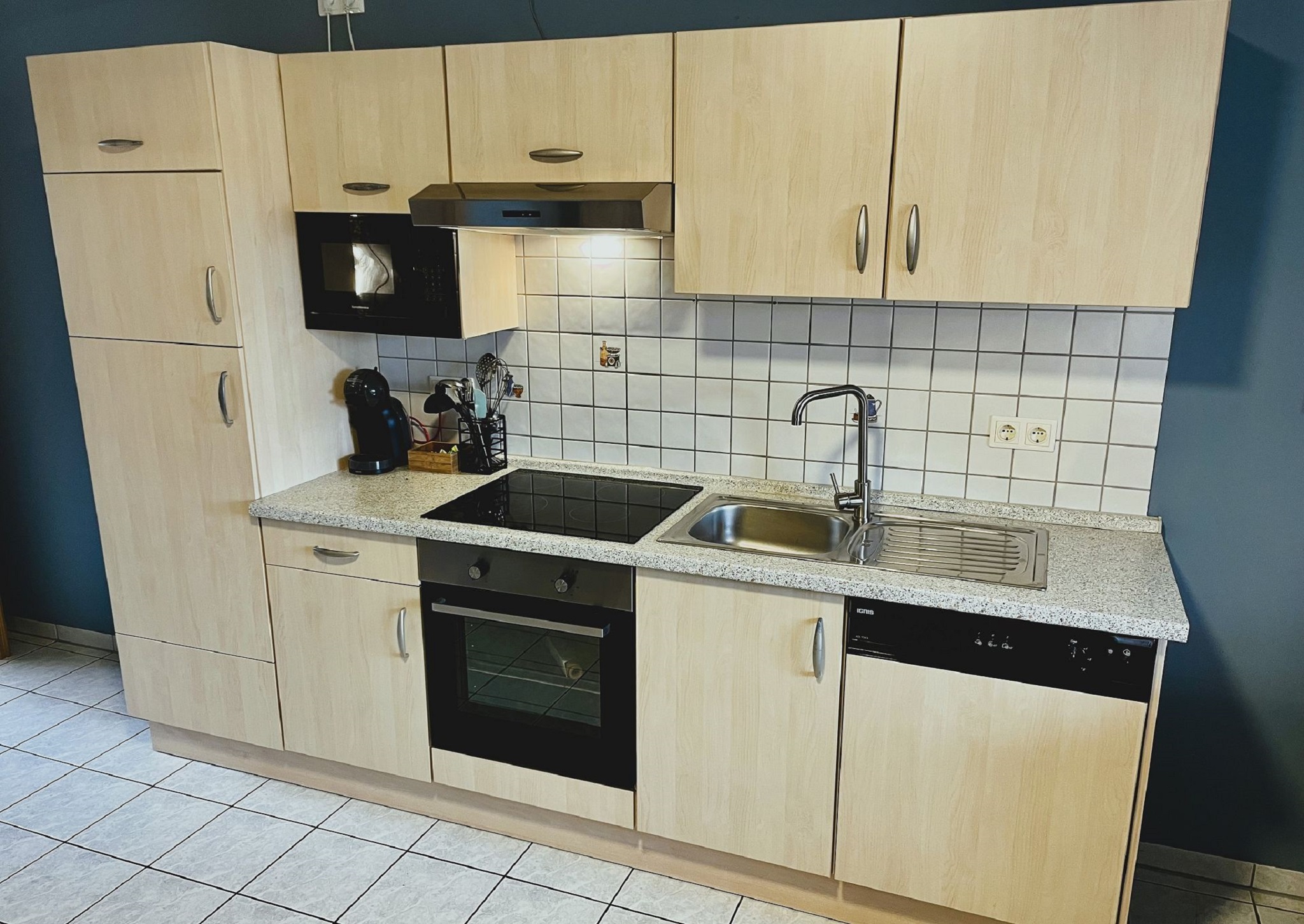 - Eine vollausgestattete Küche mit Backofen, Herd und Spülmaschine