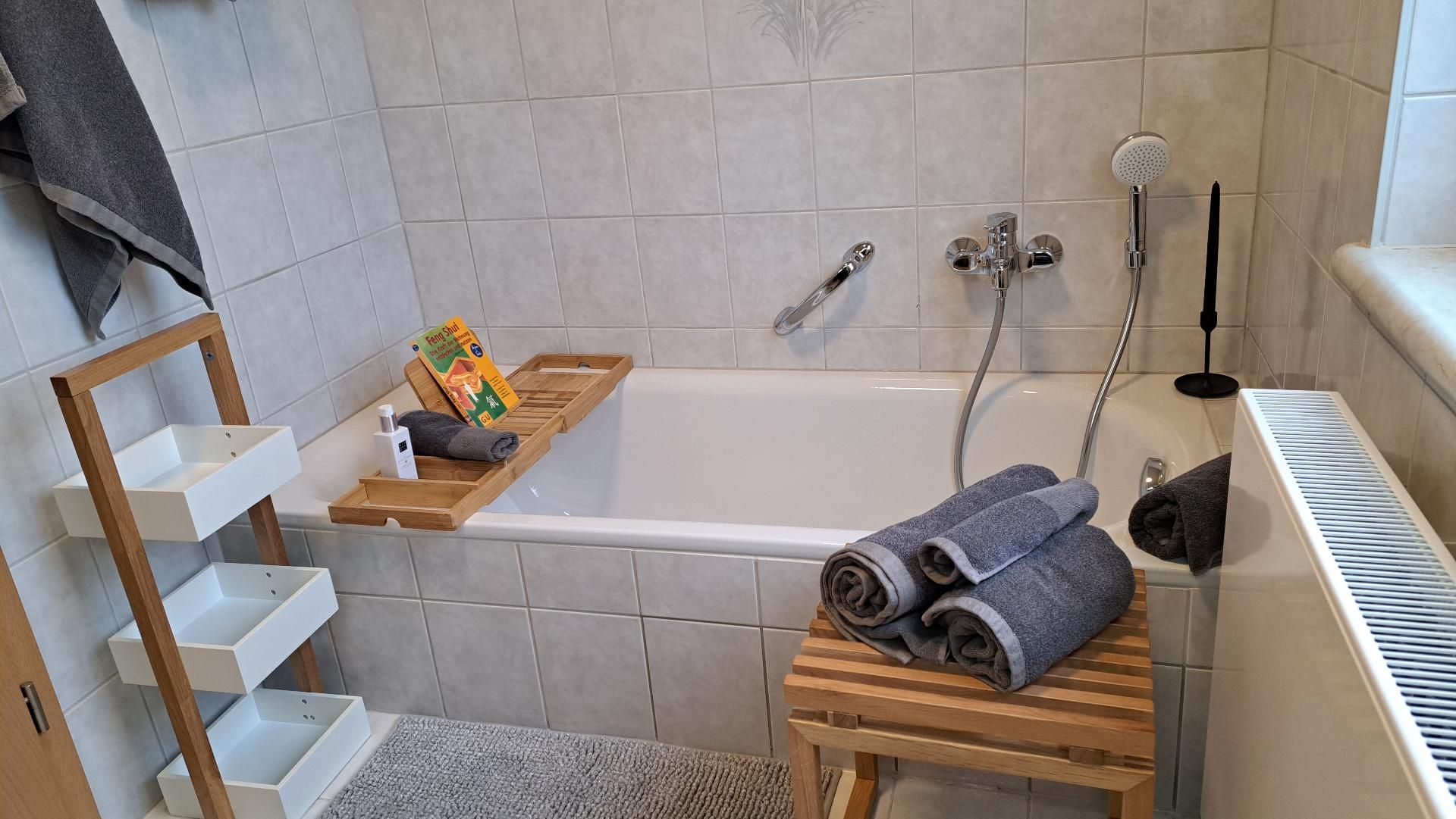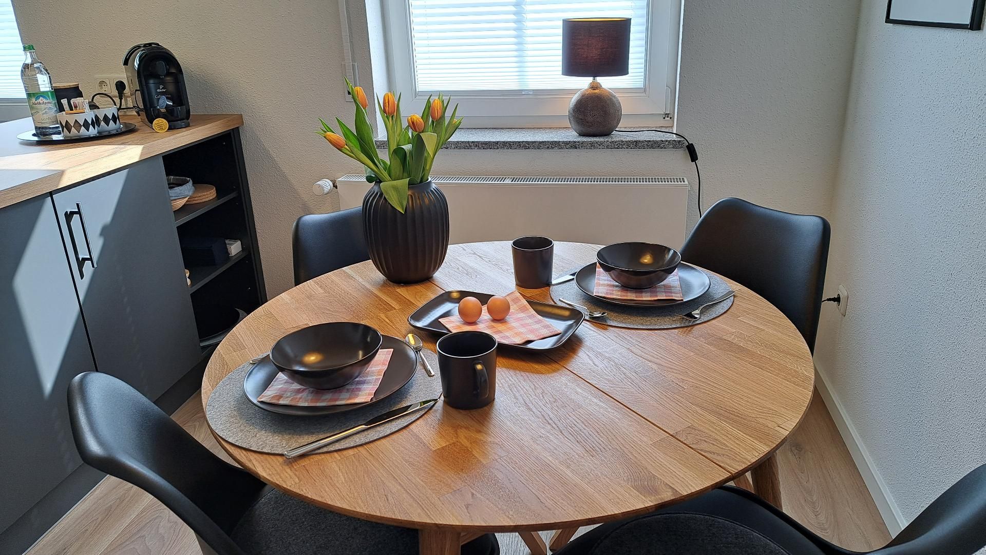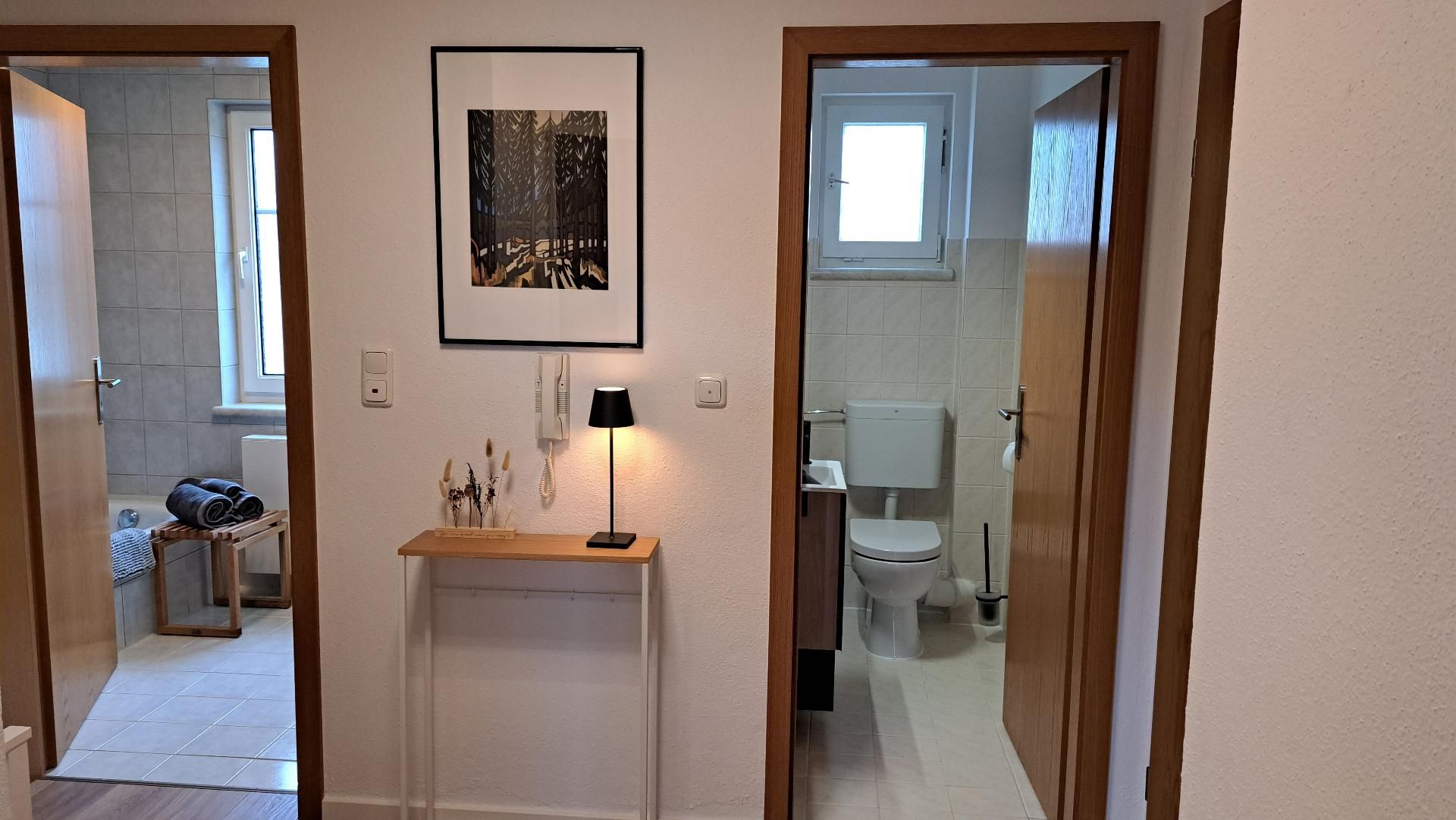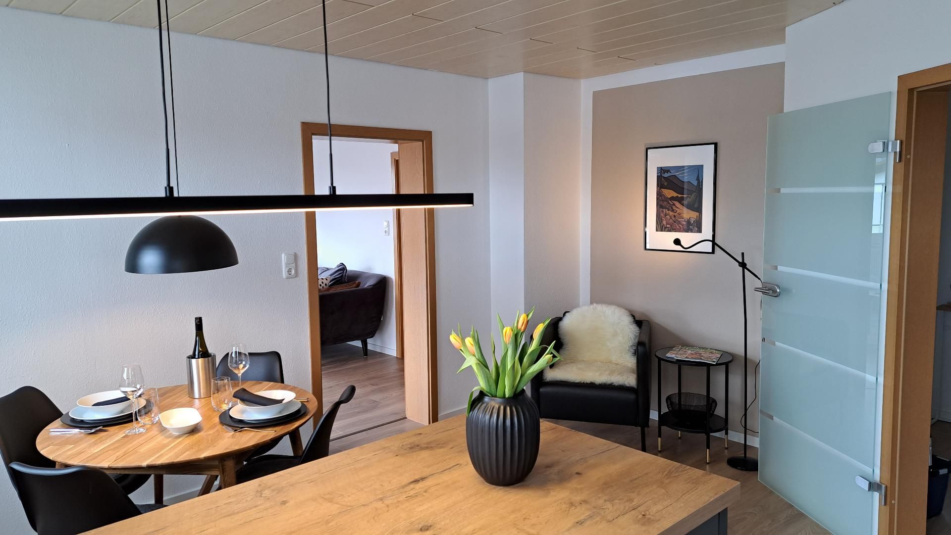Die neurenovierte und komplett hochwertig neu ausgestattete 5 Sterne FEWO 2 im Erdgeschoss hat eine Wohnfläche von ca. 85m² mit einer zusätzlichen Terrasse von 14m² . Die Wohnung besteht aus Diele mit Garderobe und Ganzkörperspiegel. Die Küche mit Mittelinsel ist in gehobener Ausstattung sehr umfangreich: Wasserkocher, Kapsel-Kaffeemaschine, Toaster, Kühlschrank mit Gefrierfach, großes Ceran-Kochfeld mit Backofen, Mikrowelle, Geschirrspülmaschine, hochwertiges Geschirr für sechs Personen. Ein gemütlicher Essplatz für vier Personen. Ein Wohnzimmer mit 55 Fernseher, kostenloses WLAN, moderne Eck-Couch, ein Schreibtisch mit Leselampe ergänzt die Einrichtung. Das Schlafzimmer 1 ist mit einem großen Boxspringbett, Kleiderschrank mit Spiegeltür, Fernseher 43, und Frisiertisch ausgestattet.Das Schlafzimmer 2 ist mit einem Boxspringbett, Kleiderschrank und Schreibtisch eingerichtet. In der Wohnung befindet sich ein Bad mit Badewanne und extra Dusche, Waschtisch mit großem Spiegelschrank und Föhn. Das WC mit Handwaschbecken ist separat. Auf der großen Terrasse mit Zugang vom Wohnzimmer stehen Ihnen Gartenmöbel zur Verfügung.