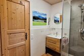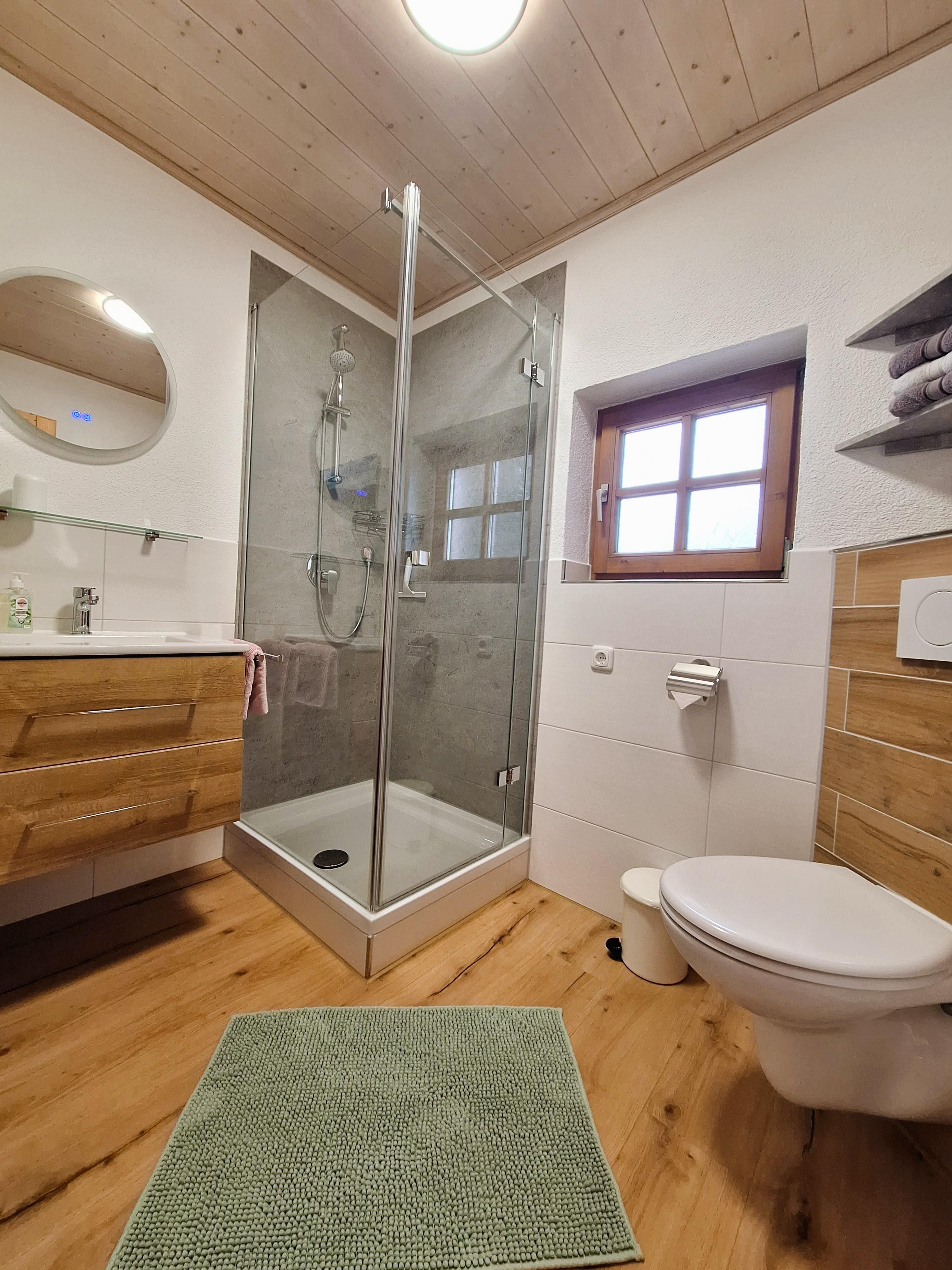 Badezimmer mit Toilette, Waschbecken und Dusche. Hand- und Duschtücher sind in gebuchter Personenzahl in der Wohnung.