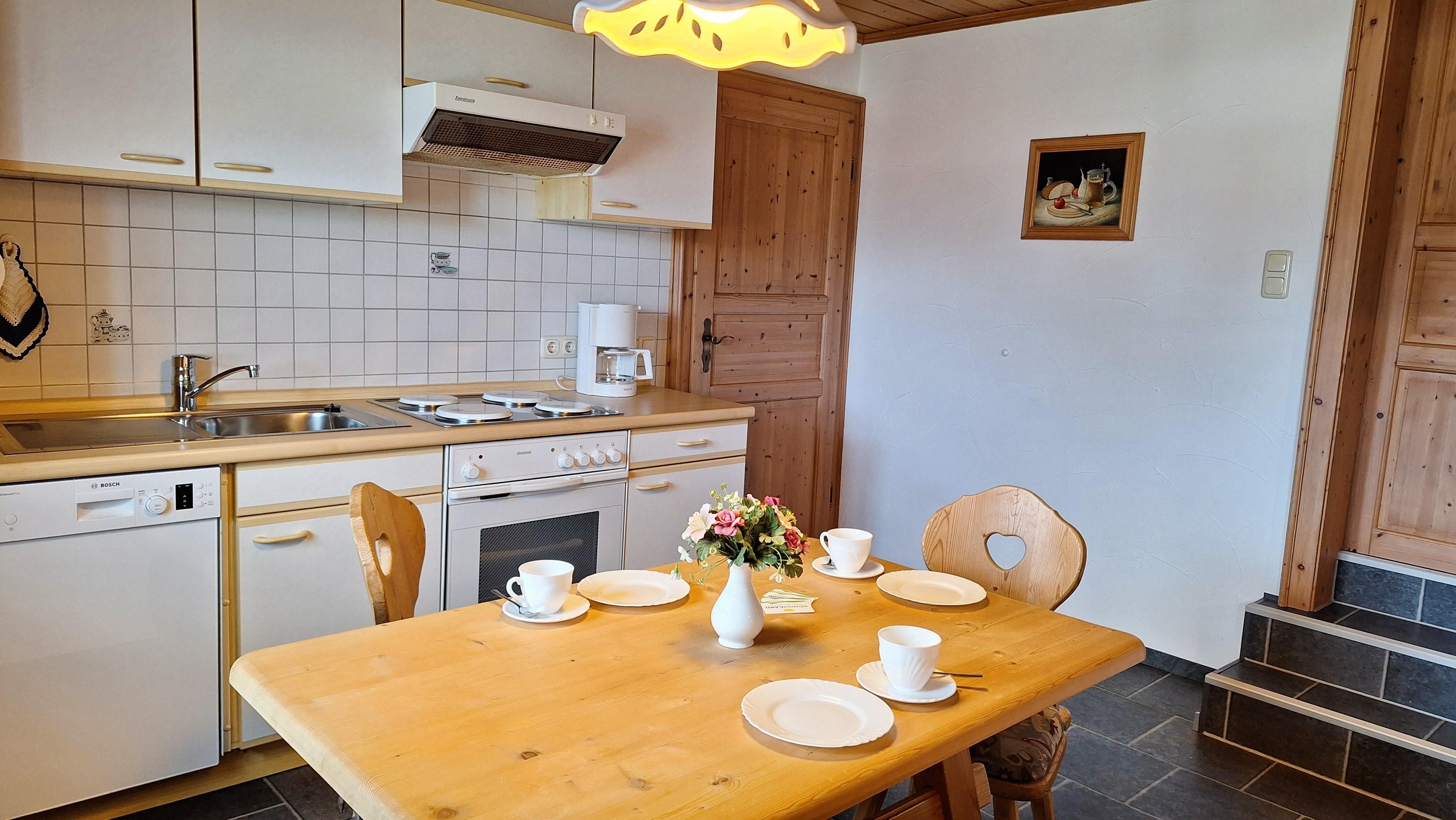 Komplett ausgestattete Küche mit Spülmaschine, Backofen, Kühlschrank mit Gefrierfach (3*), Wasserkocher, Filter-Kaffeemaschine, Toaster, Töpfe, Pfannen, Geschirr und Besteck.