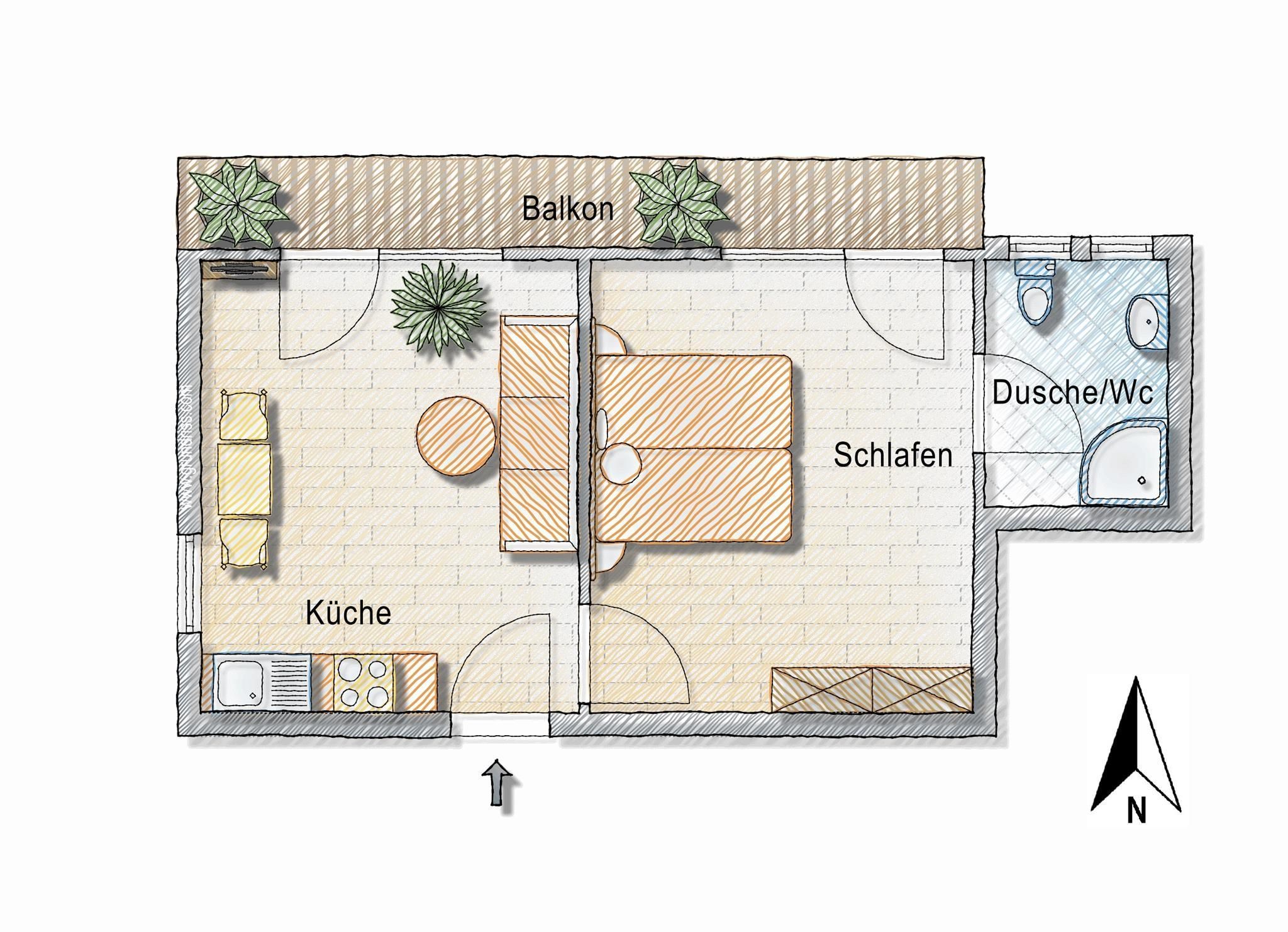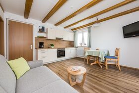 Die Ferienwohnung Haselnuss liegt im 1. OG. Sie ist ausgestattet mit einem Schlafzimmer, Küche mit Wohnraum, TV, Bad mit Dusche und WC sowie großem Nord-West-Balkon.