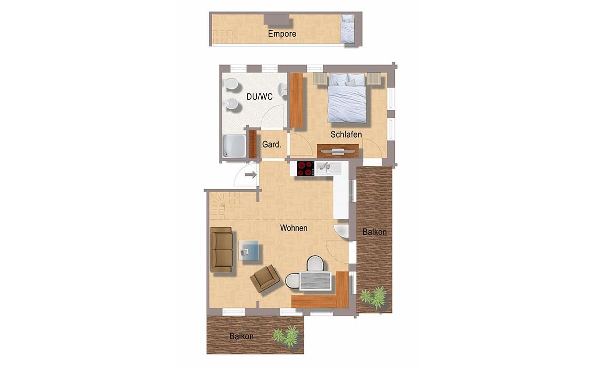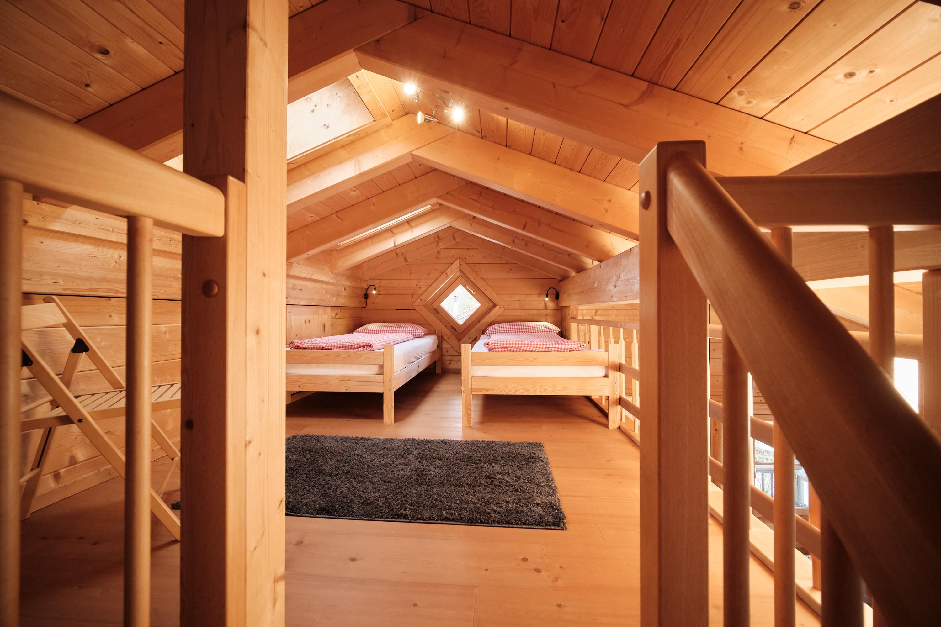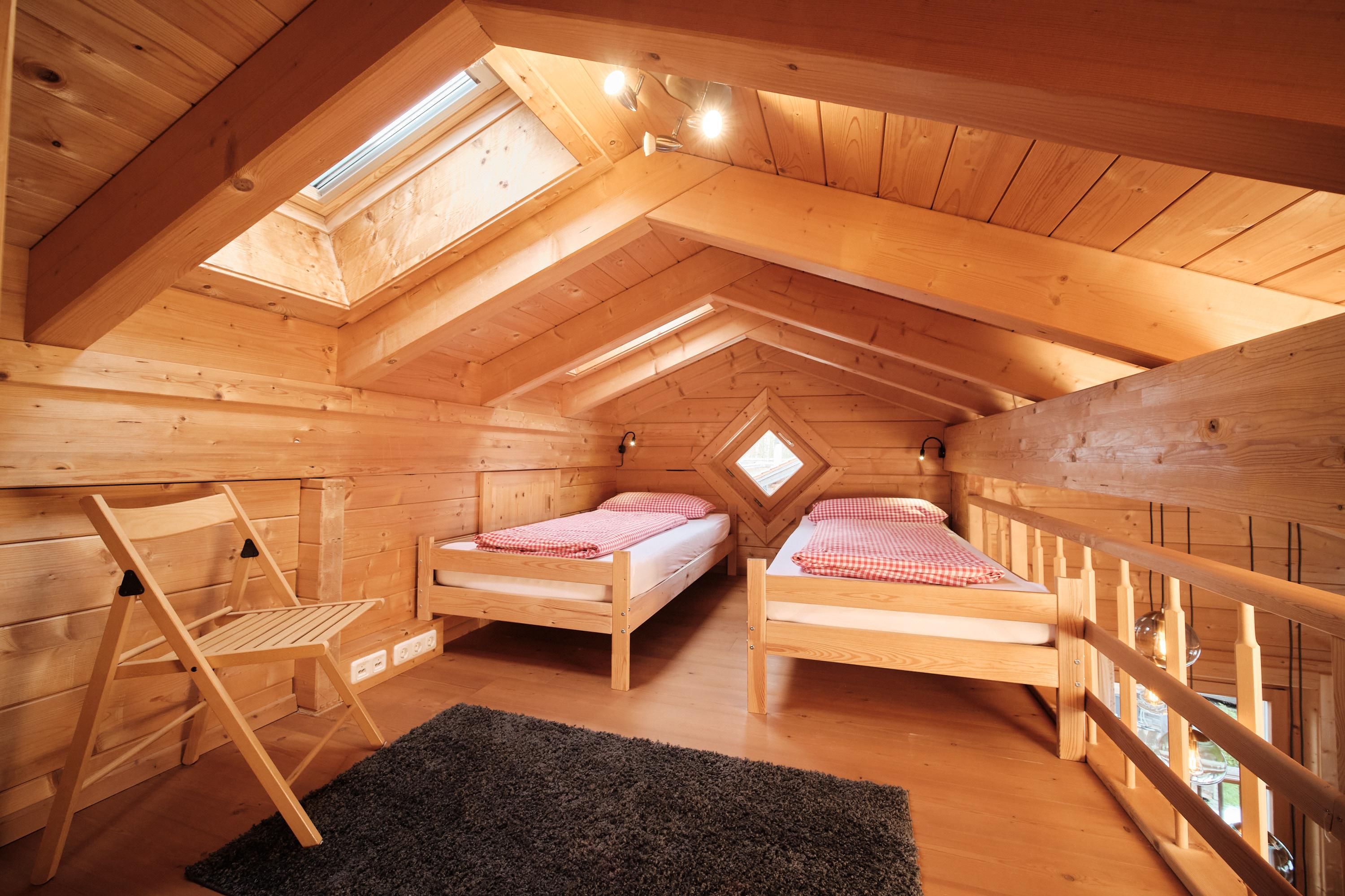 Sie hat ein Doppelzimmer, einen großen Wohn-/Hauptraum mit einer top ausgestatteten Küche und einer Schlafgalerie mit 2 weiteren Einzelbetten.