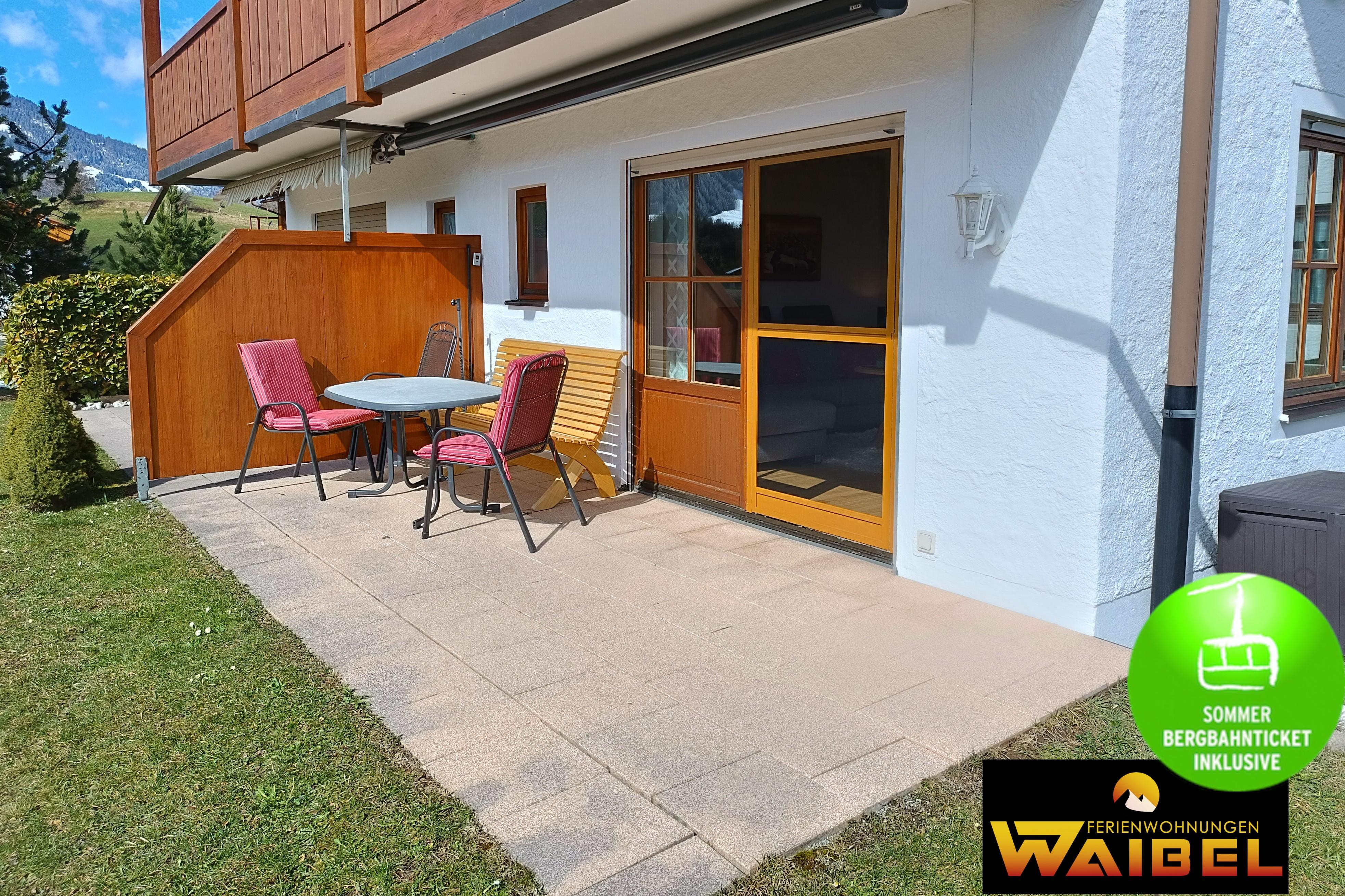 Moderne und sonnige 2-Raum Ferienwohnung, 50qm für 2-4 Personen, Küche, Bad mit ebenerdiger Dusche, Terrasse mit malerischem Bergblick, kostenloser PKW-Stellplatz am Haus, Waschkeller, WLAN, Oberstdorfer Bergbahnen von Mai-Oktober GRATIS