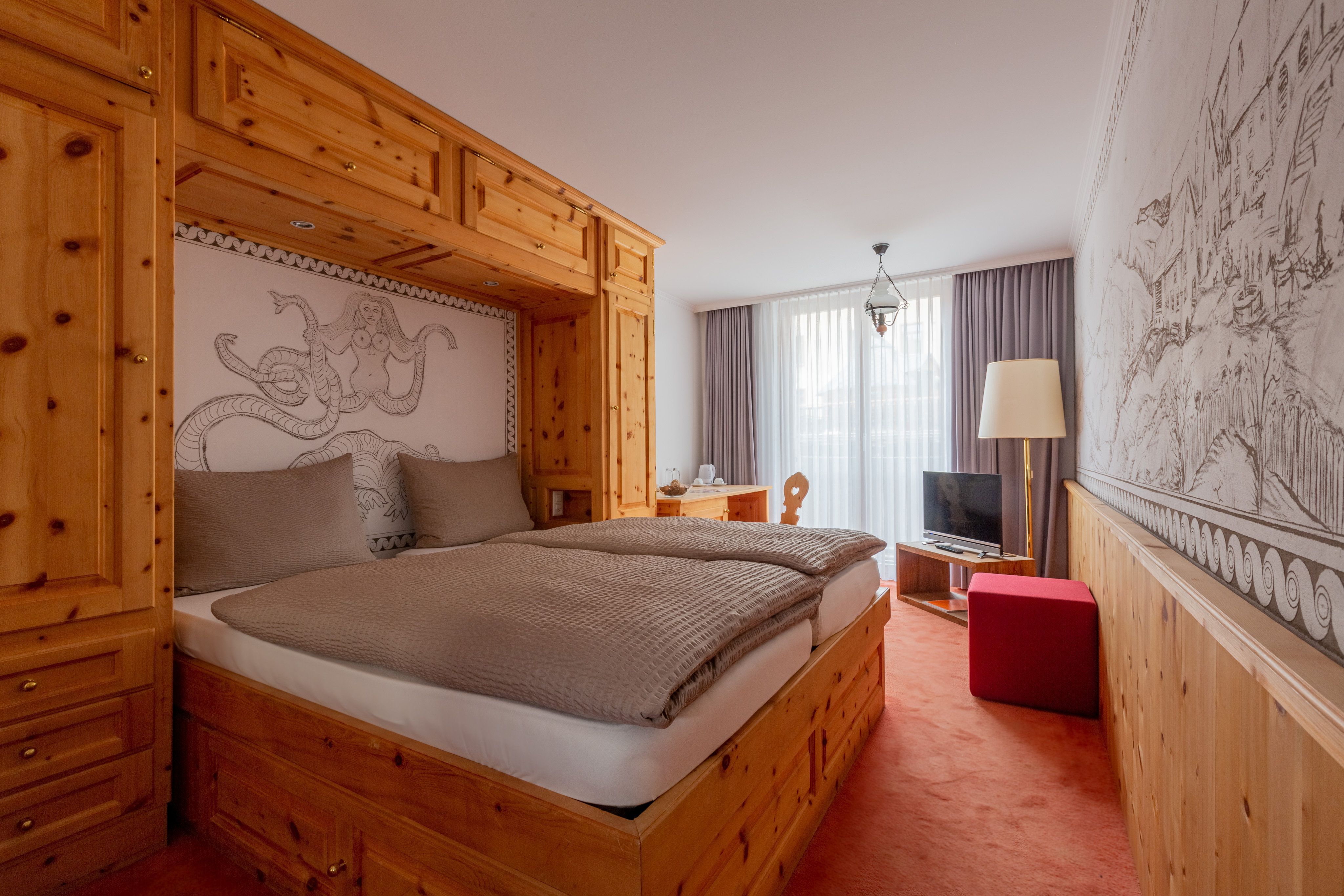 Neun Zimmer, neun Länder und Kontinente. Alle Zimmer sind individuell eingerichtet und erzählen ihre eigene Geschichte. Was aber allen Räumen gemein ist, ist die hochwertige Ausstattung mit modernen und komfortablen Bädern mit Badewanne oder Wellnessdusche. Alle Zimmer verfügen über eine Minibar, TV mit Flachbildschirm sowie Safe. Kostenloser W-Lan-Zugang zum Internet steht Ihnen in den öffentlichen Hotelbereichen und der Pizzeria Arte zur Verfügung. Auch sind die Räume hell und freundlich, teils mit Blick auf das Sir Norman Foster Ufo, teils sind die Pisten des Corviglia zu sehen.