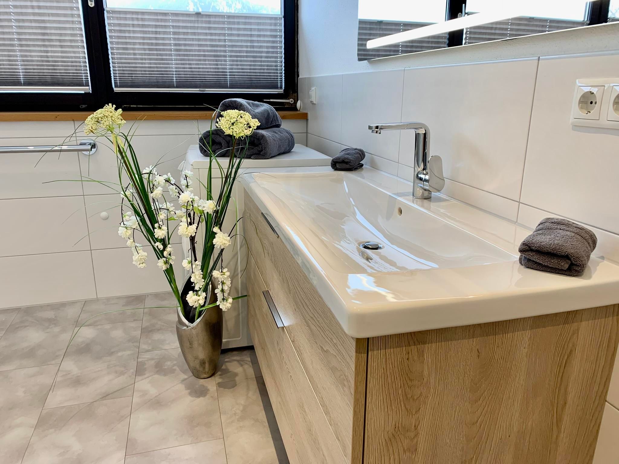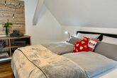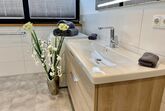 Im Obergeschoss befinden sich 2 Schlafräume mit Doppelbett und 1 Schlafraum mit einem gemütlichen Etagenbett. Das geräumige Bad besitzt eine große Dusche, WC, Waschbecken mit Unterschrank und eine Waschmaschine.