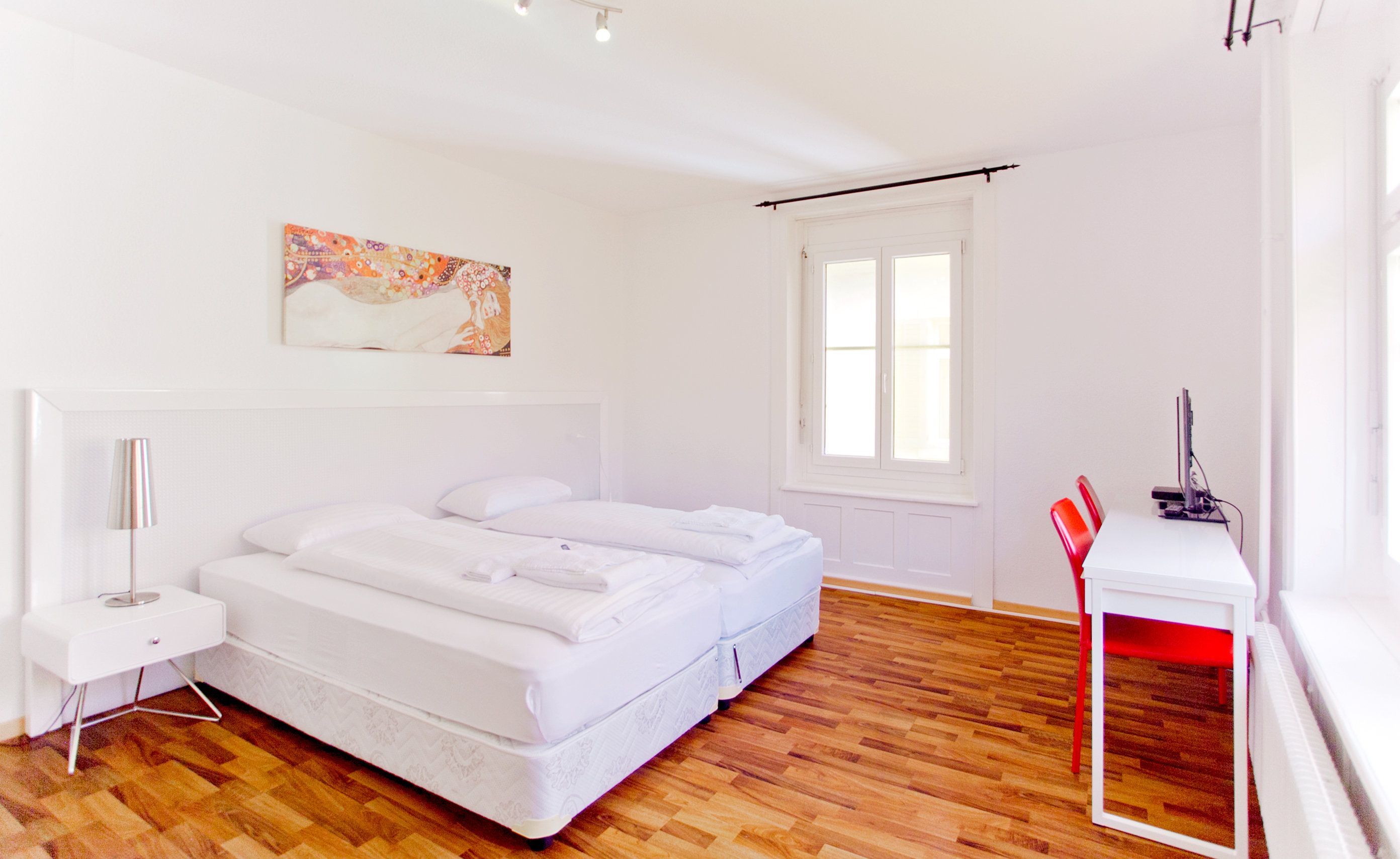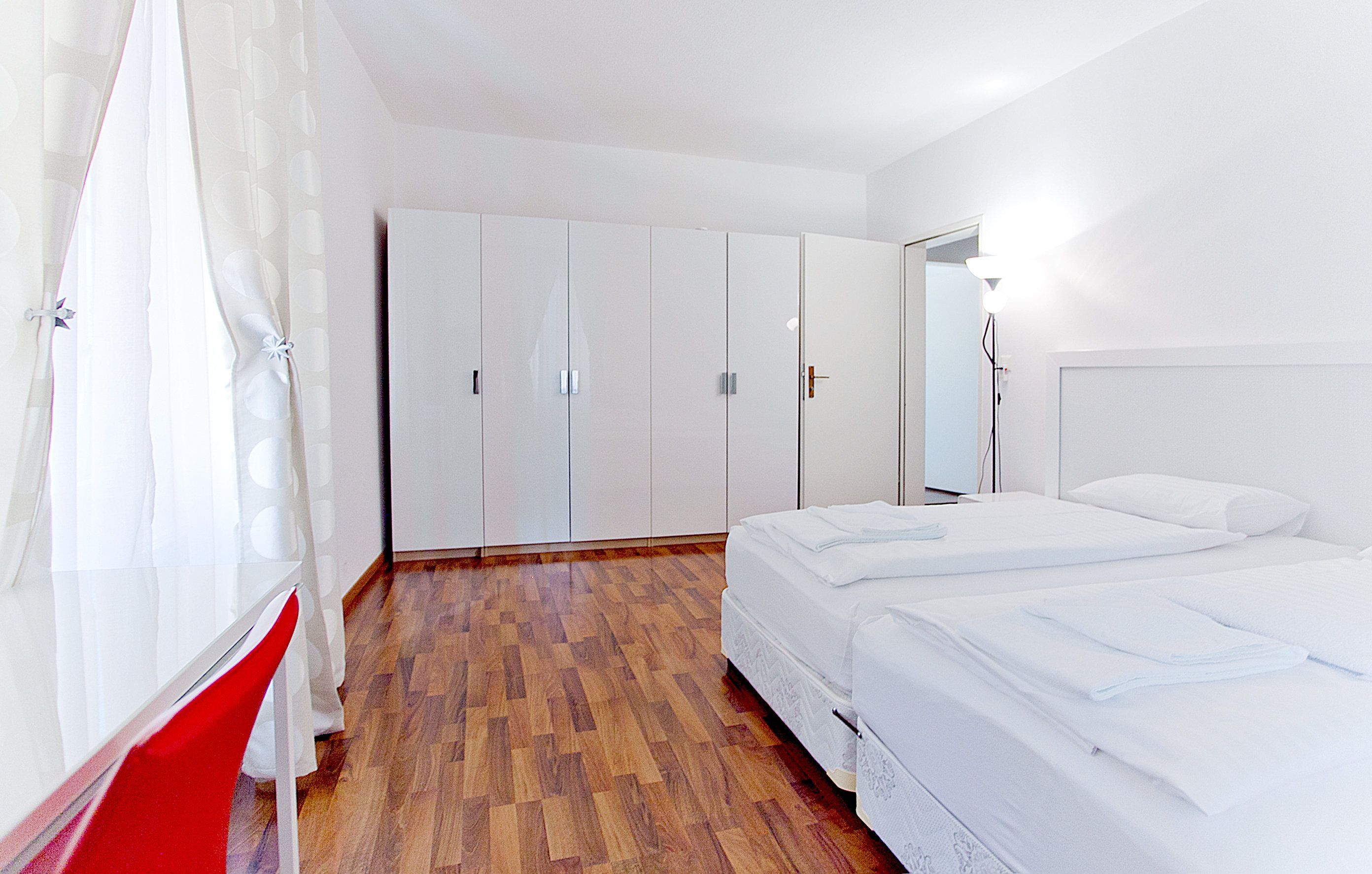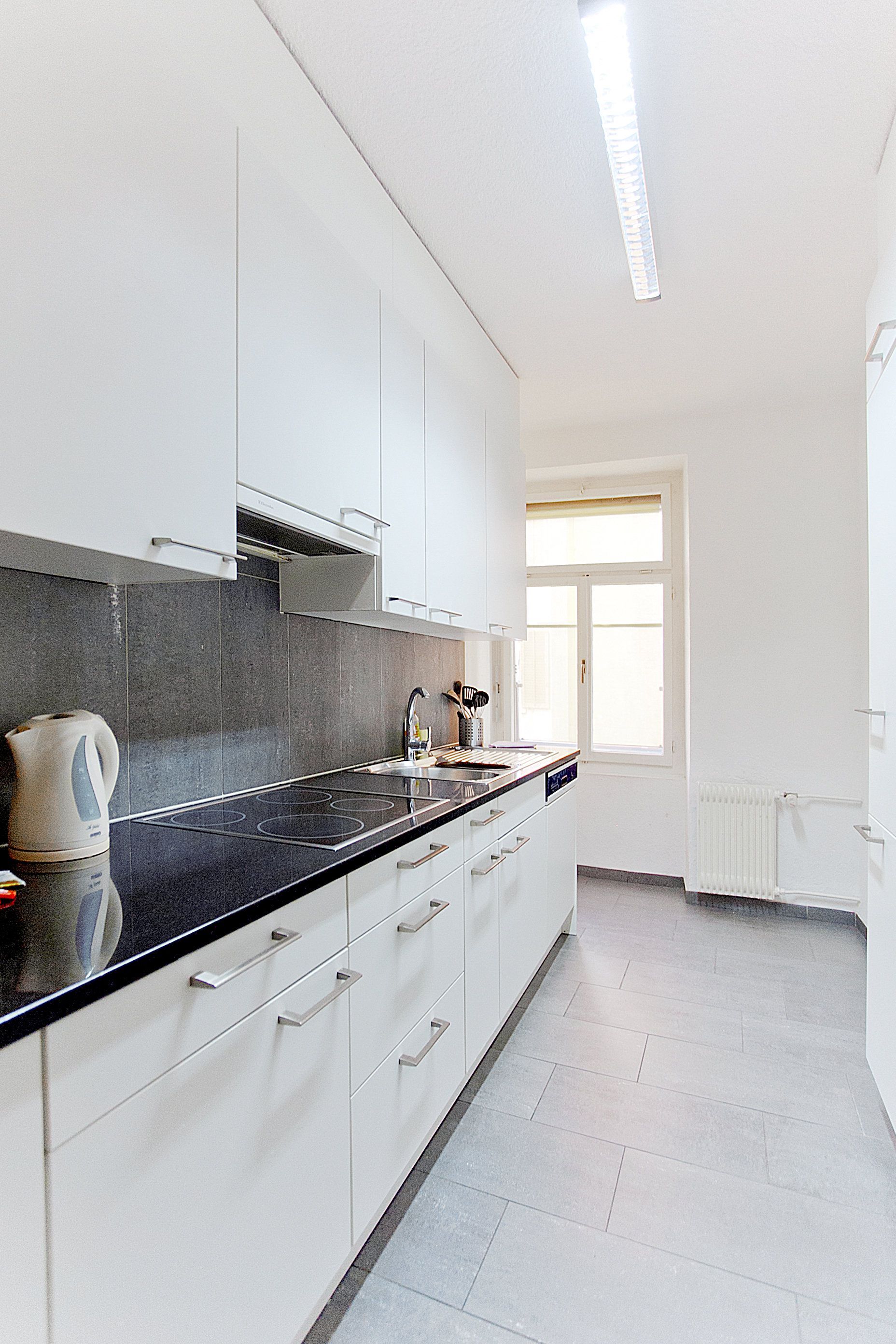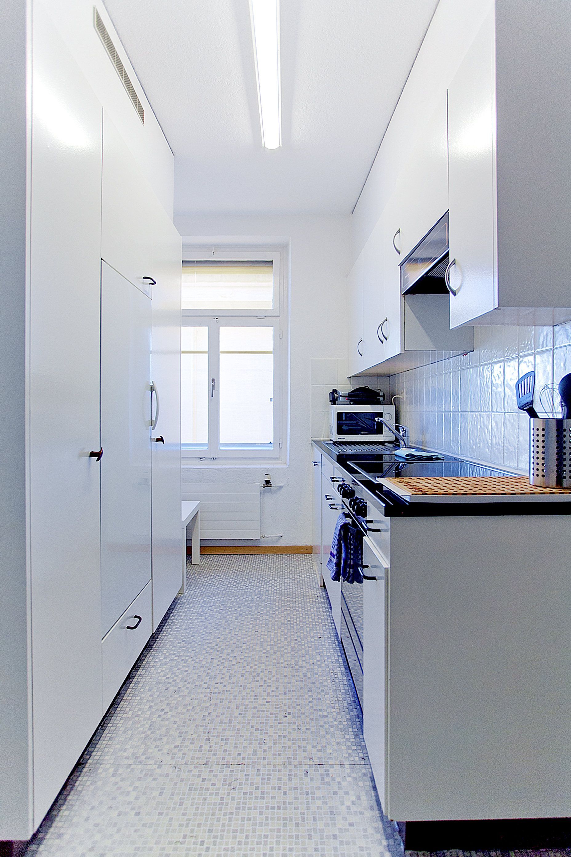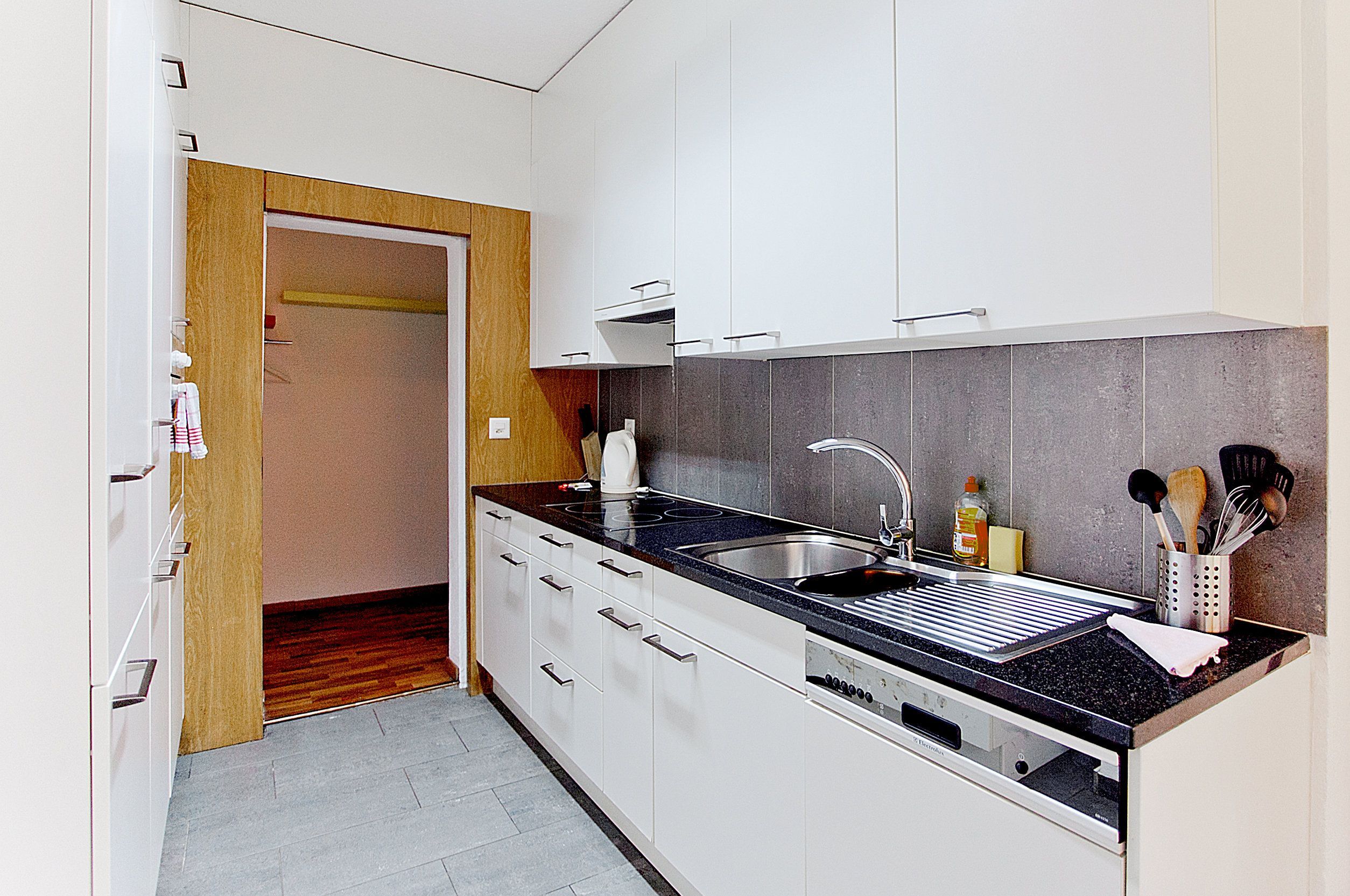 Die Küche ist ausgestattet mit einem Backofen, Herd, Kühlschrank, Kaffemaschine und teilweise mit Geschirrspülmaschine.Im Preis enthalten ist gratis WLAN, Festnetzanschluss mit unlimittierten Anrufen im Schweizer Festnetz sowie wöchentlicher Reinigungsservice mit Wäschwechsel. Ein Waschraum mit Gemeinschaftswaschmaschine und Tumbler steht gratis zur Verfügung.Grösse: ca. 45 Quadratmeter