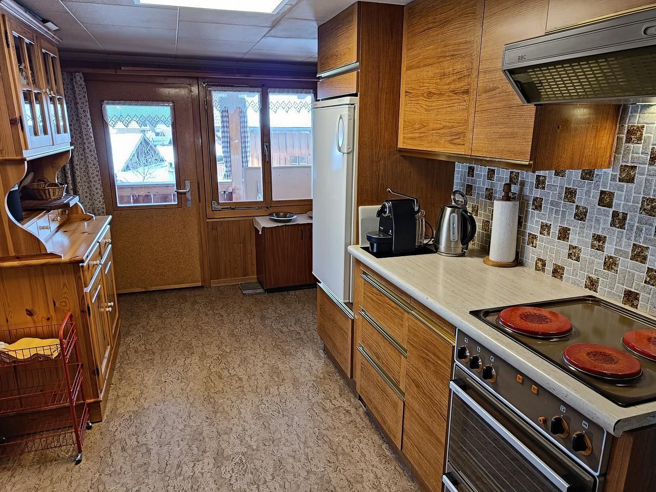 Die Küche ist mit einem Elektroherd, Backofen sowie einer Spülmaschine und einer Kaffeemaschine (Kapseln) ausgestattet. Es stehen den Gästen eine komplette und hochwertige Küchenausstattung (Pfannen, Geschirr, Schalen, Messer und sonstige Utensilien) zum Kochen und Backen zur freien Verfügung. Ausserdem können ein Fondue-Set und ein Raclette-Ofen benutzt werden.