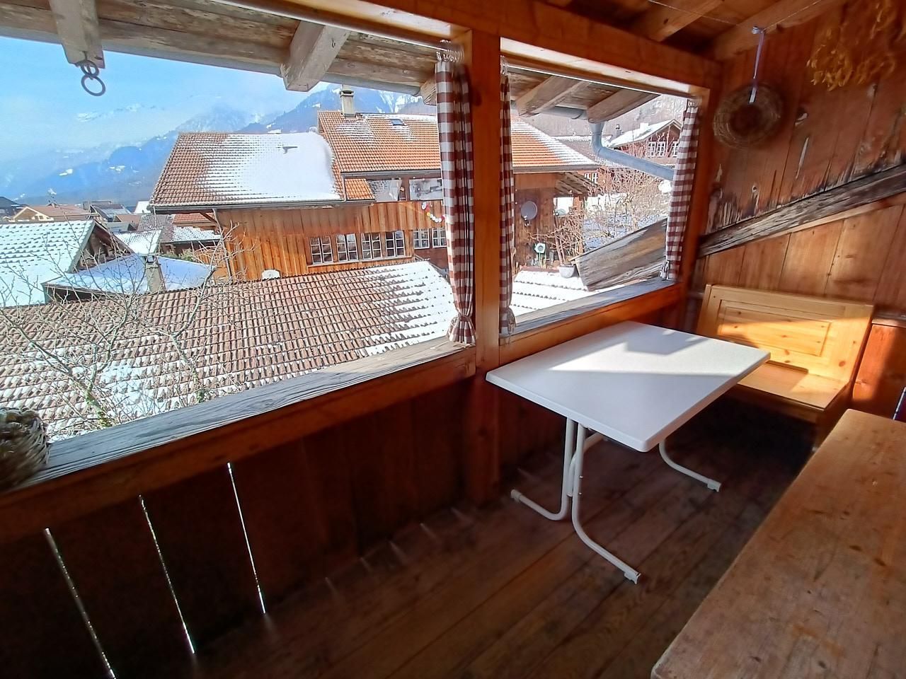 Auf dem kleinen Balkon ergänzt ein großartiges Bergpanorama eine Mahlzeit oder ein Apéro.