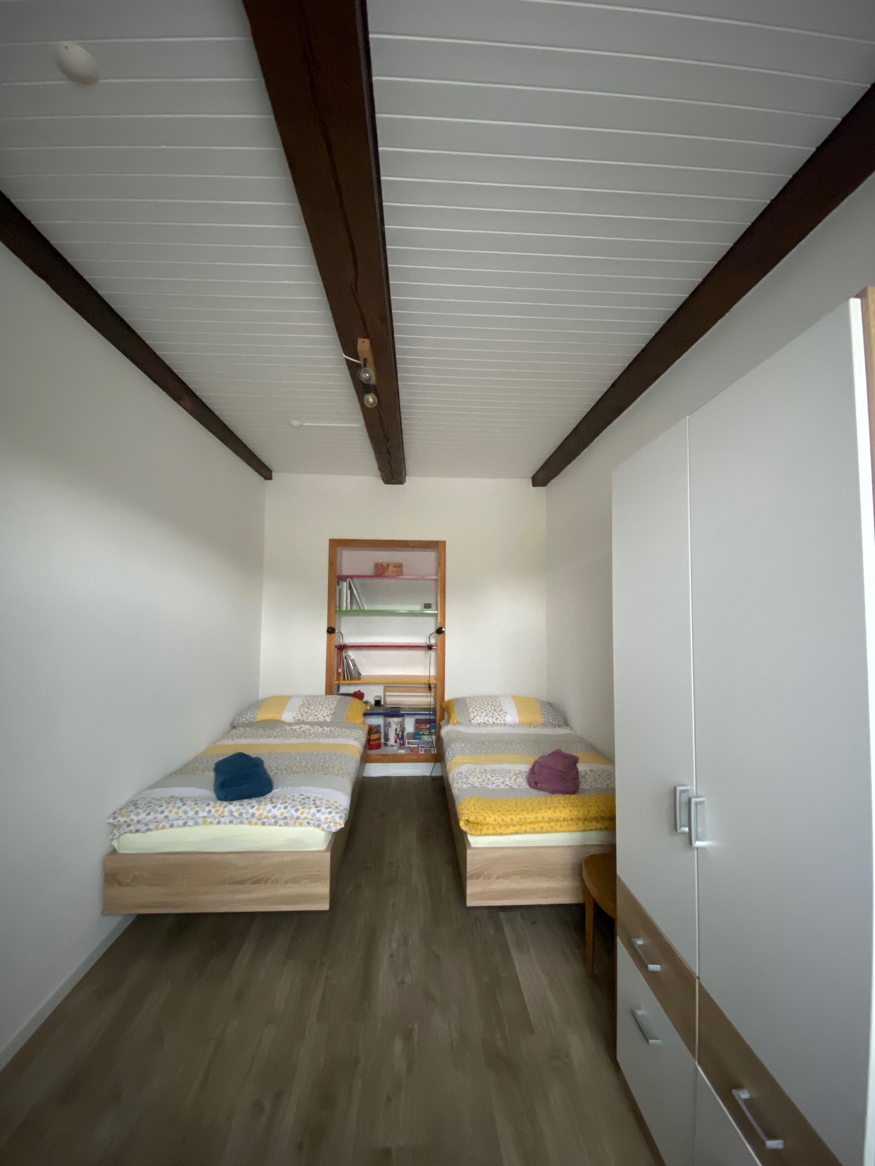Ein Schlafzimmer mit 2 Einzelbetten, Kleiderschrank, Bücher, Spiele.