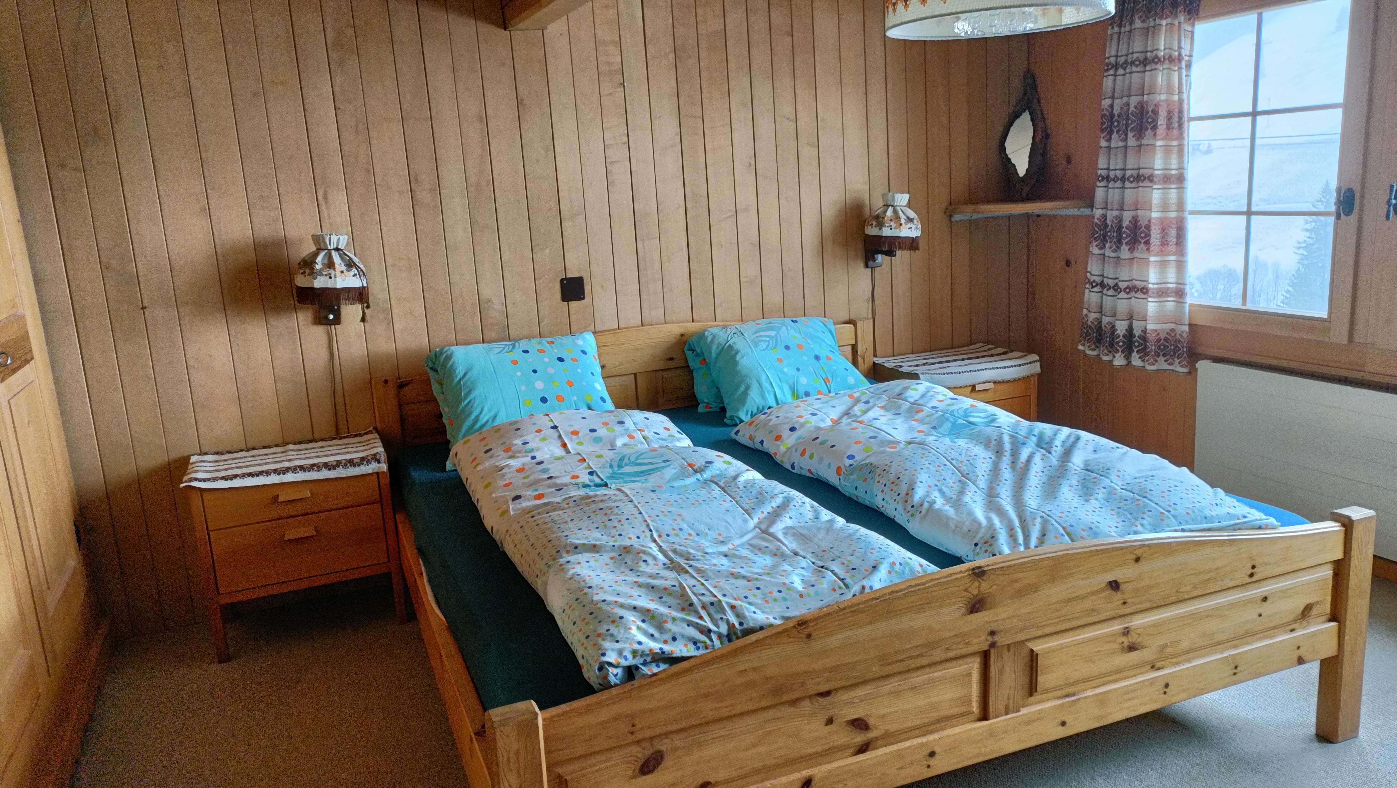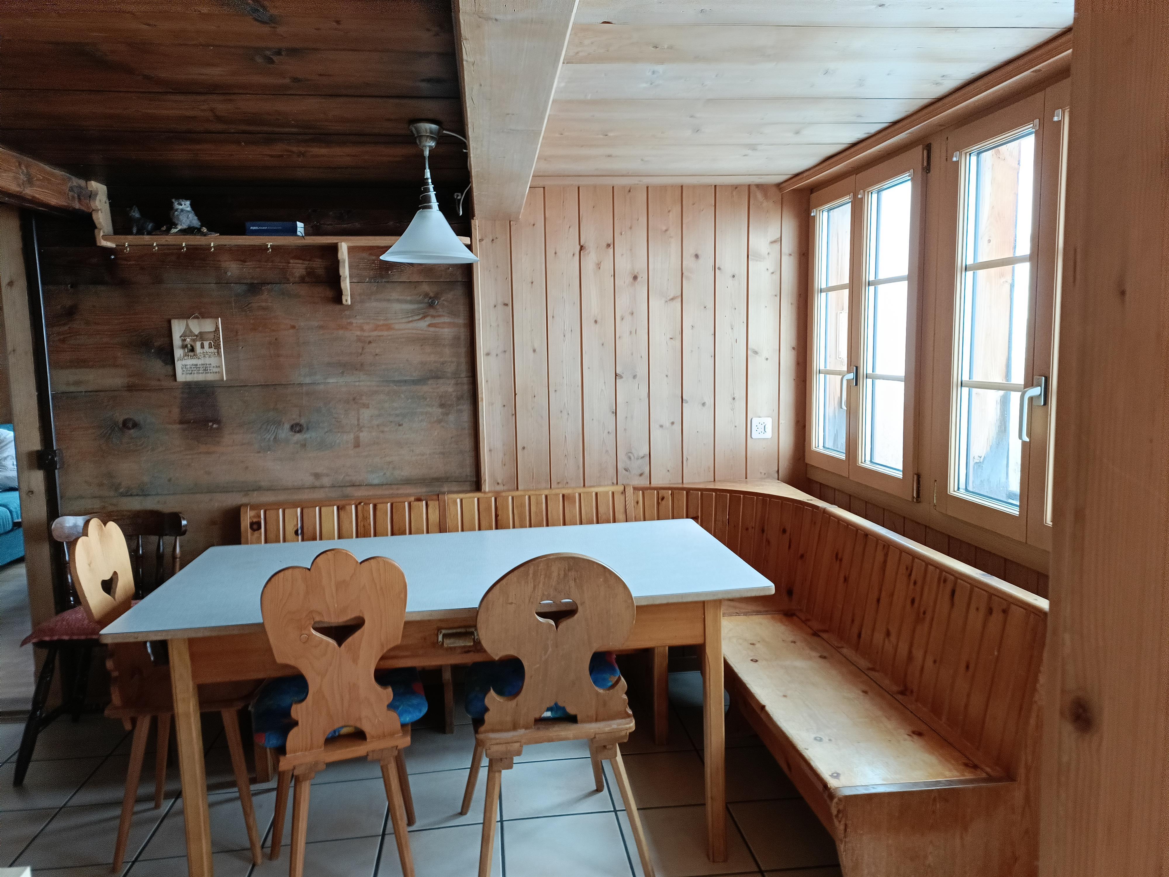 Gemütliche, einfache, alte Wohnung in einem freistehenden 2-Familien-Bauernhaus. Grosse Küche mit Eckbank, Geschirrspüler, Kühlschrank sowie Backofen. Wohnzimmer mit Ecksofa und 2 Schlafmöglichkeiten. 1 Schlafzimmer mit einem Doppelbett. 1 Schlafzimmer mit 2 Einzelbetten. Separate Laube mit einem Einzelbett. Terrasse mit schöner Bergsicht. WLAN. Skiraum. Nichtraucherhaus. Haustiere auf Anfrage.