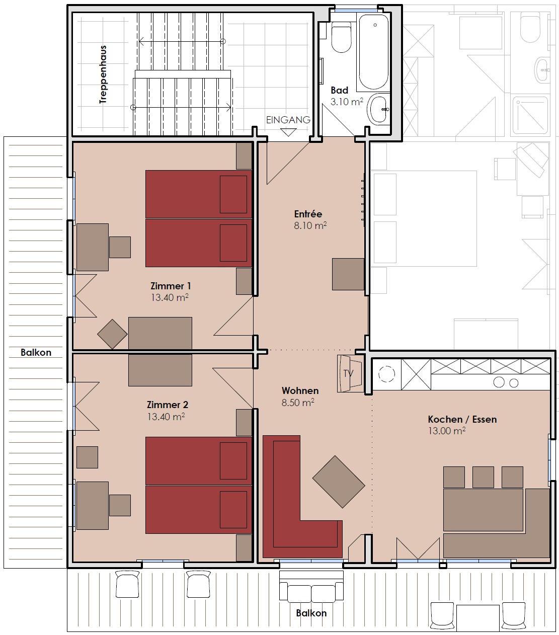 • Zwei Schlafzimmer mit je 2 separaten Betten und nordischem Bettinhalt plus zwei Zusatzbetten, Kleiderschrank,