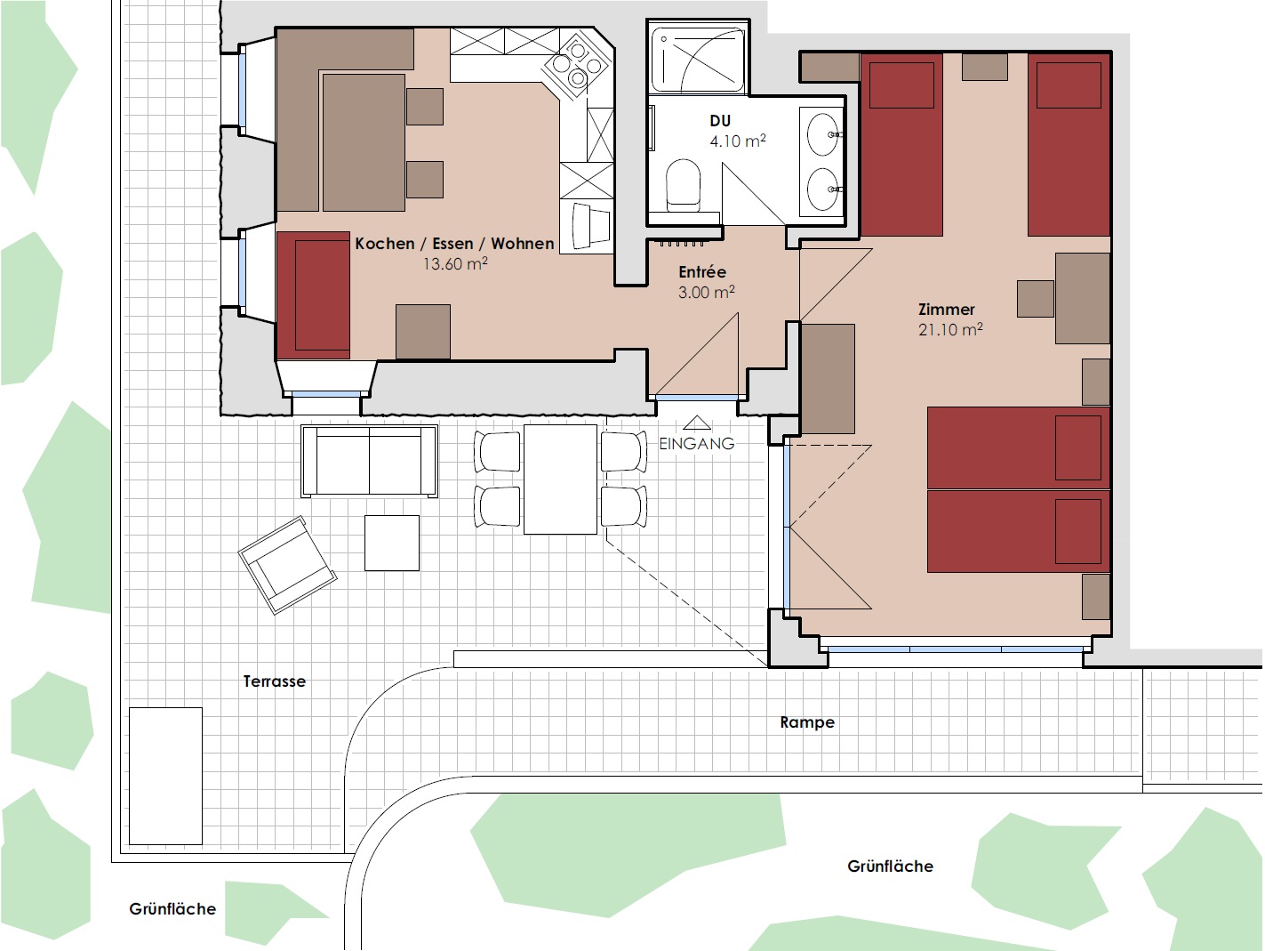 • Direkter Zugang ohne Stufen zum Rasensitzplatz/Liegewiese zur Allgemeinnutzung mit Gartenmöbeln und Grillstelle