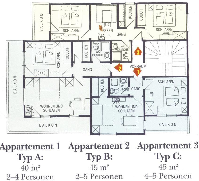 Gemütliches Appartement im 2. Stock mit einer Wohnküche, 2 getrennten Schlafzimmer (1 x mit Einzelcouch), Telefon, Radio, 3x Kabel-TV, kabelloser Internetanschluß (W-LAN), 2 x Dusche/WC, Haarföhn, Balkon, Safe. Brötchen-Service ist möglich. Größe: ca. 45 m².
