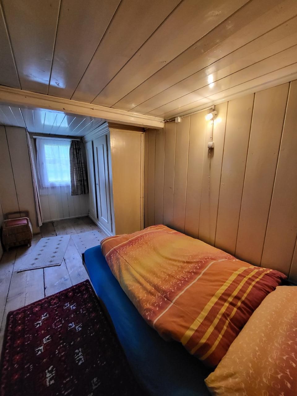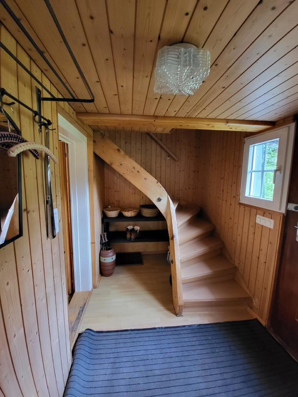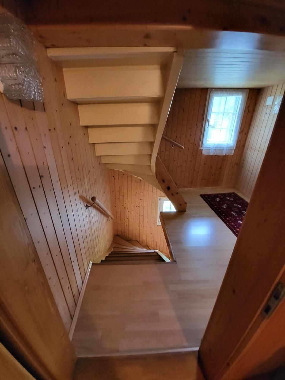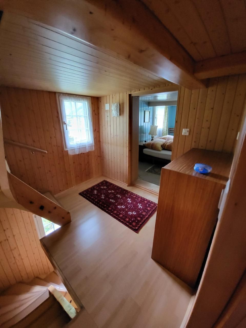 Unten: Flur, einfache Küche mit Eckbank (6 P.), Kühlschrank mit Gefrierfach, Elektro-Herd und Holz-Feuerherd, Waschmaschine und Holzofen. Wohnzimmer mit Essecke und Nebenraum. Sie sind miteinander verbunden. Im Nebenraum: ein Sofa, dass man zu einem zusätzlichen Bett ausziehen kann. Im vorderen Teil: Gemütliches Wohnzimmer mit Sofa, Fernseher und Kachelofen. Ein Esstisch mit Platz für 6 Personen steht ebenfalls bereit. Wichtig zu sagen ist, dass das Wohnzimmer schräg ist und grosse Personen nicht überall gut stehen können. Dies betrifft aber nur diesen einen Raum!