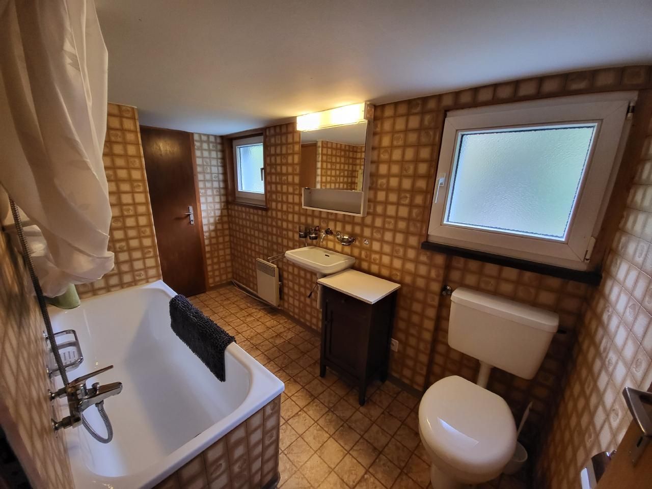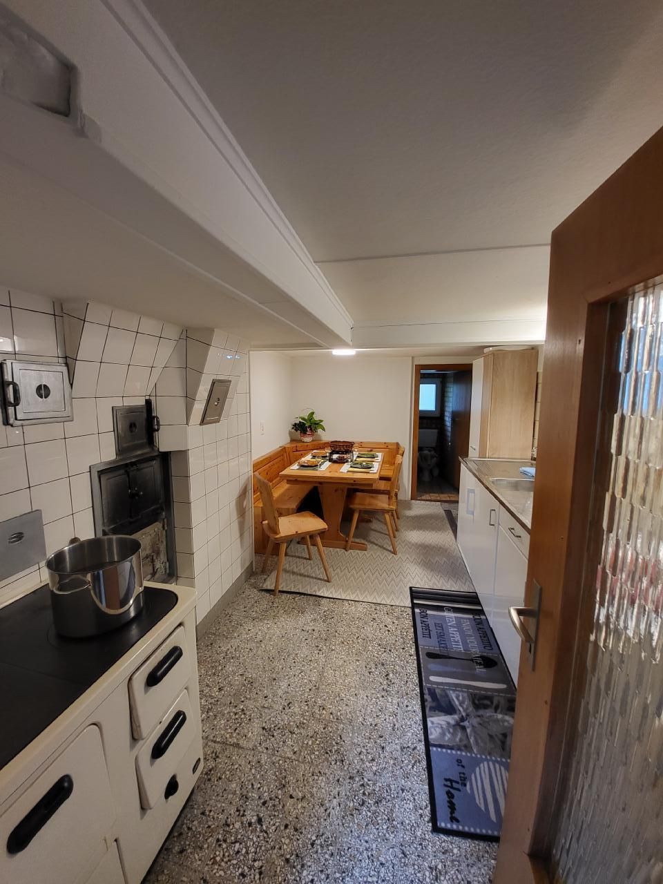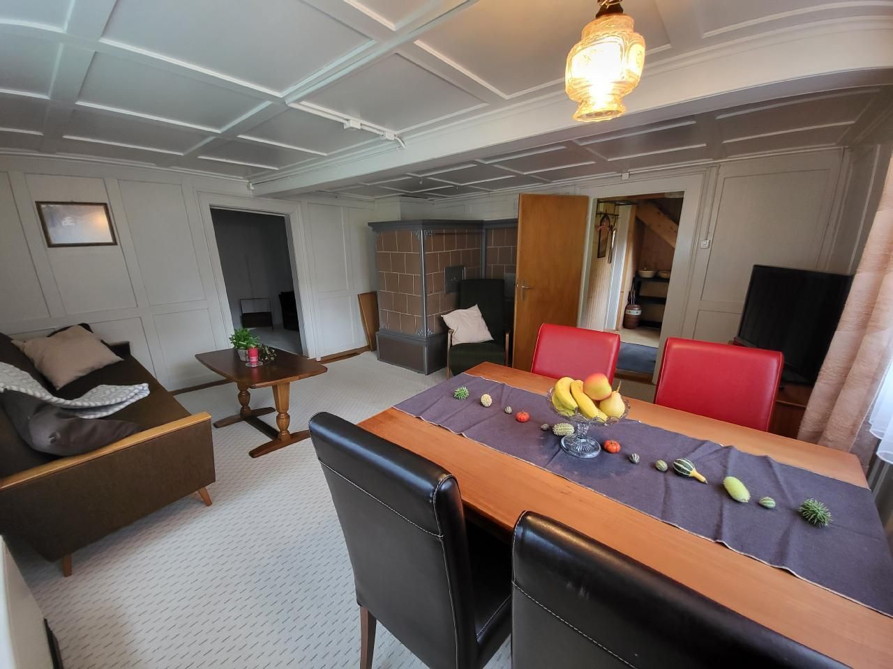Unten: Flur, einfache Küche mit Eckbank (6 P.), Kühlschrank mit Gefrierfach, Elektro-Herd und Holz-Feuerherd, Waschmaschine und Holzofen. Wohnzimmer mit Essecke und Nebenraum. Sie sind miteinander verbunden. Im Nebenraum: ein Sofa, dass man zu einem zusätzlichen Bett ausziehen kann. Im vorderen Teil: Gemütliches Wohnzimmer mit Sofa, Fernseher und Kachelofen. Ein Esstisch mit Platz für 6 Personen steht ebenfalls bereit. Wichtig zu sagen ist, dass das Wohnzimmer schräg ist und grosse Personen nicht überall gut stehen können. Dies betrifft aber nur diesen einen Raum!