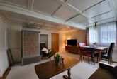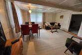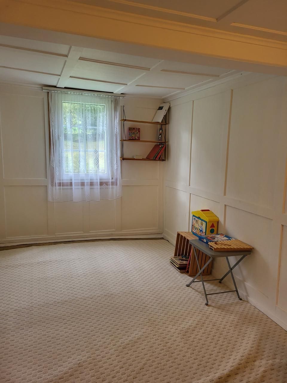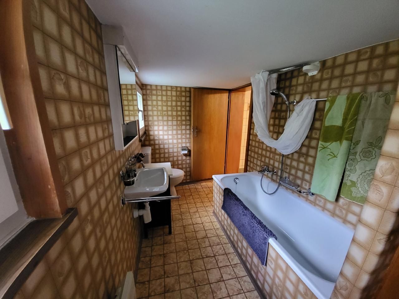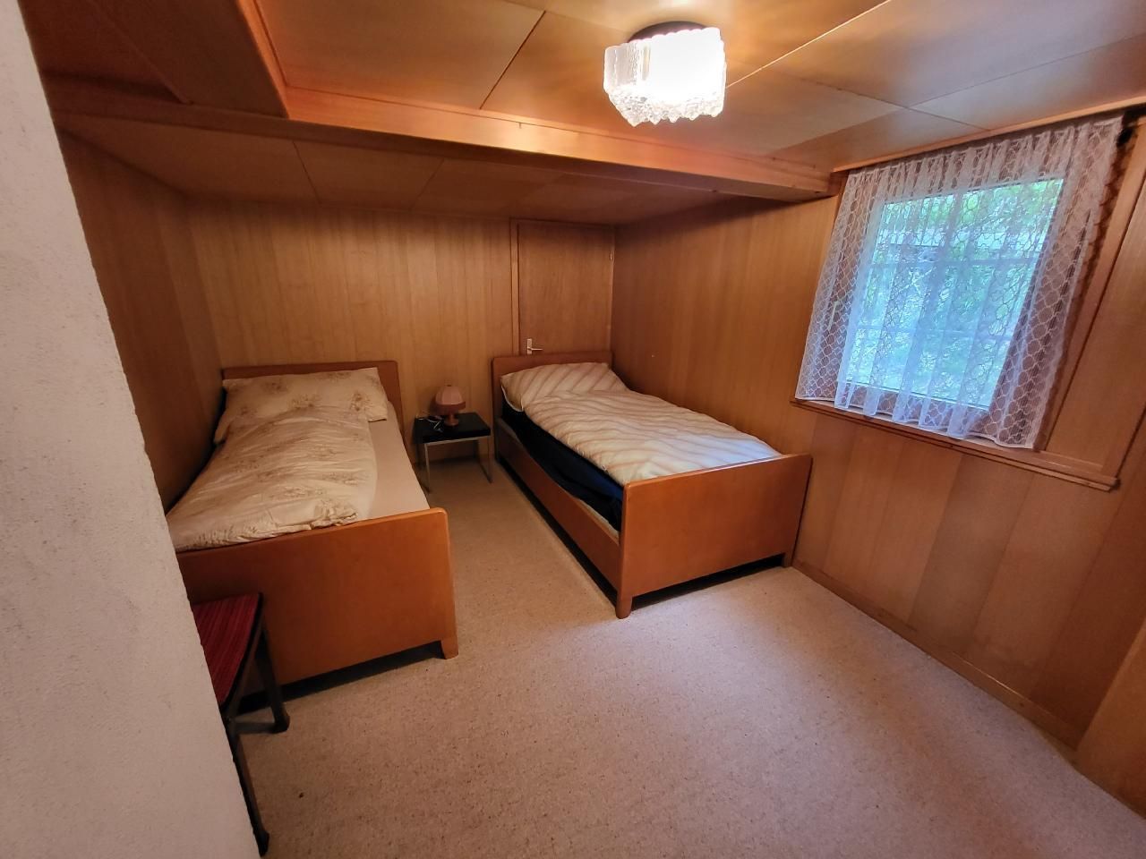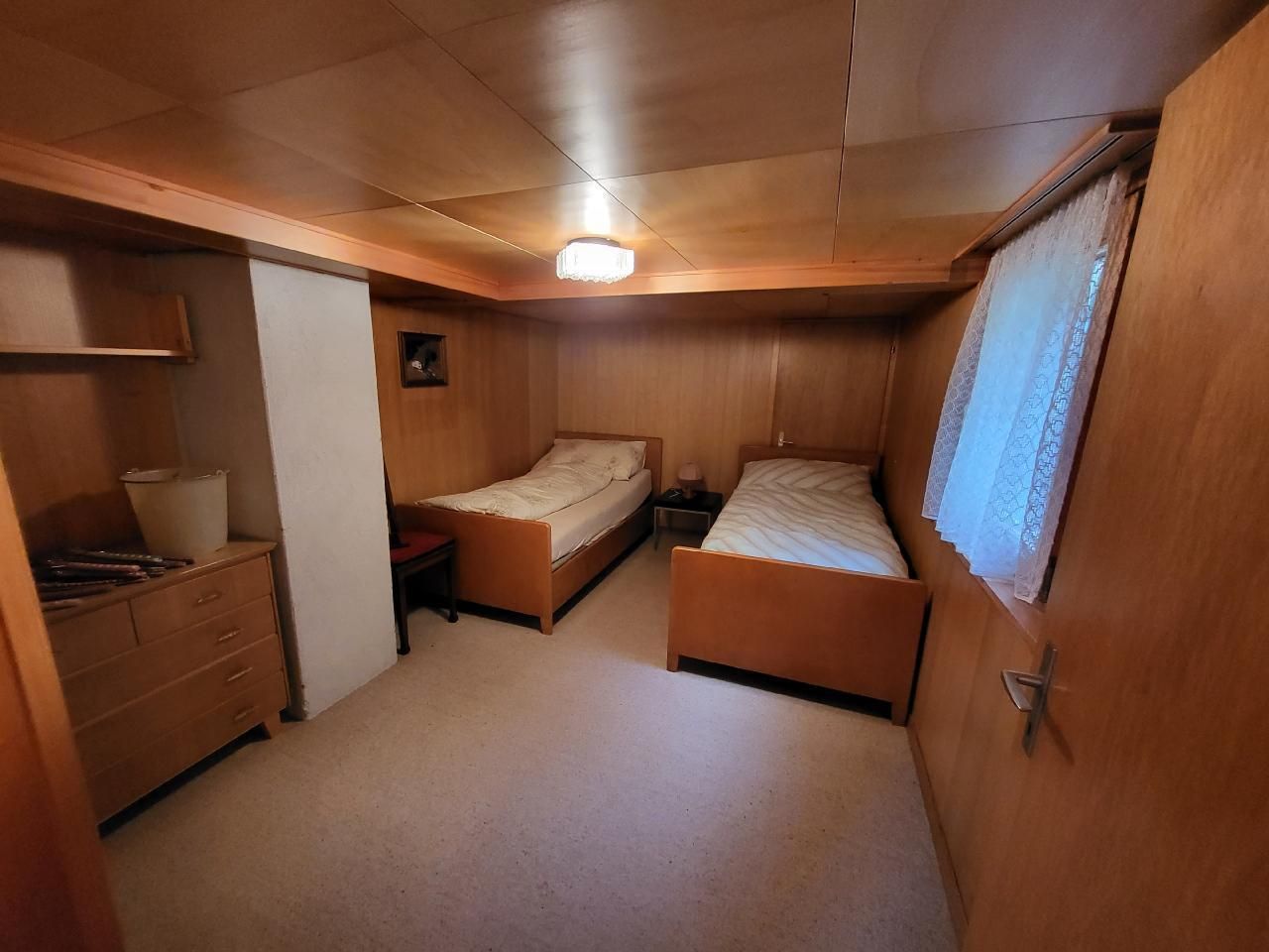 Unten: Flur, einfache Küche mit Eckbank (6 P.), Kühlschrank mit Gefrierfach, Elektro-Herd und Holz-Feuerherd, Waschmaschine und Holzofen. Wohnzimmer mit Essecke und Nebenraum. Sie sind miteinander verbunden. Im Nebenraum: ein Sofa, dass man zu einem zusätzlichen Bett ausziehen kann. Im vorderen Teil: Gemütliches Wohnzimmer mit Sofa, Fernseher und Kachelofen. Ein Esstisch mit Platz für 6 Personen steht ebenfalls bereit. Wichtig zu sagen ist, dass das Wohnzimmer schräg ist und grosse Personen nicht überall gut stehen können. Dies betrifft aber nur diesen einen Raum!