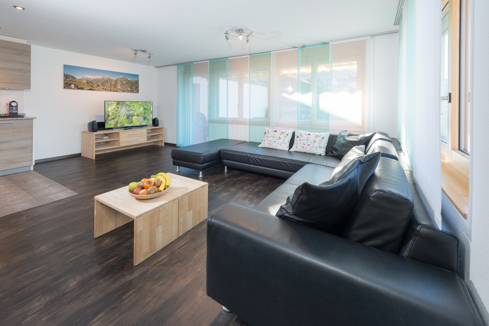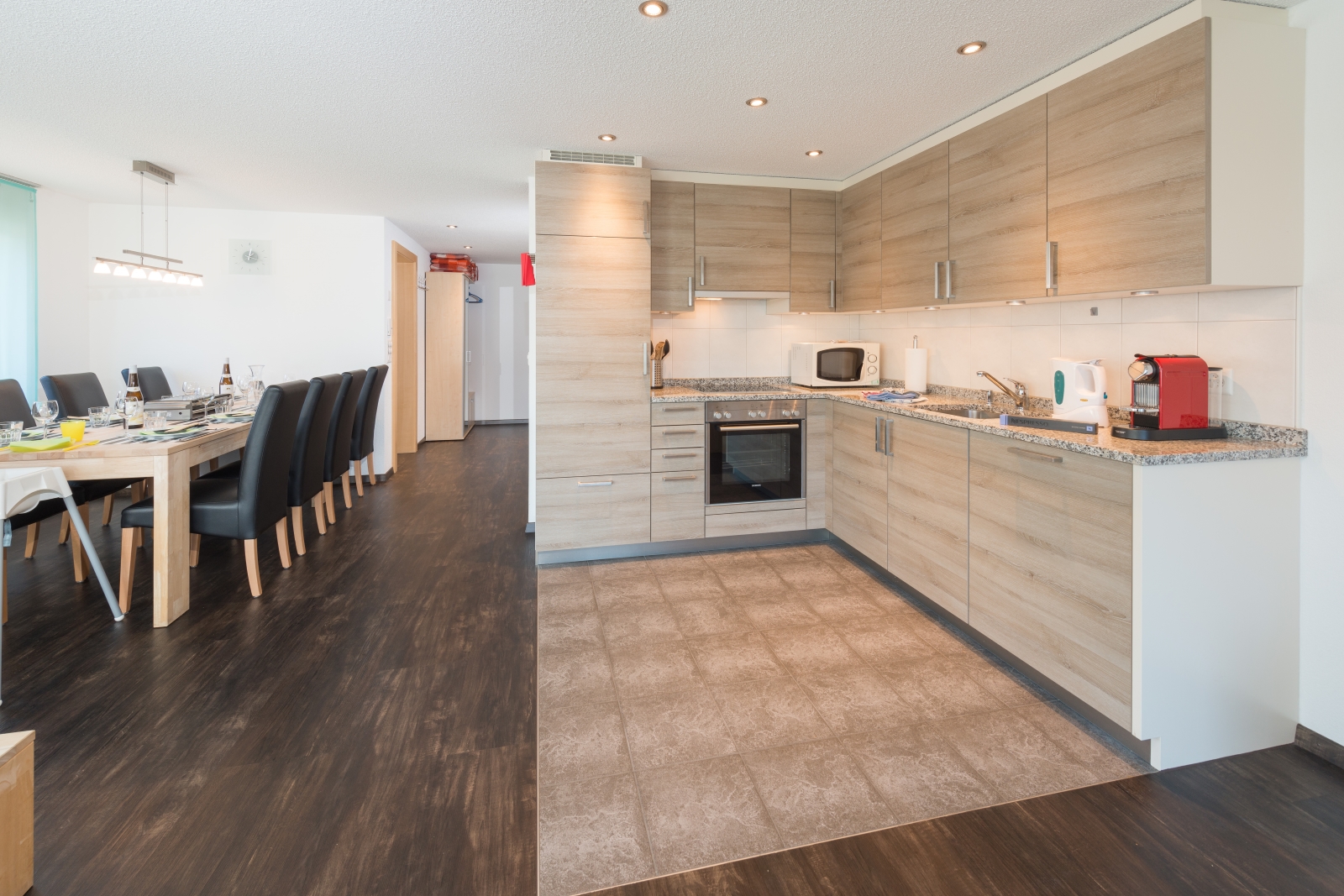 Neue ruhig gelegene Ferienwohnung für 2-8 Personen. Grosser Wohnraum mit offener moderner Küche, eigene Gartenterrasse, gratis WLAN und Privatparkplätze.