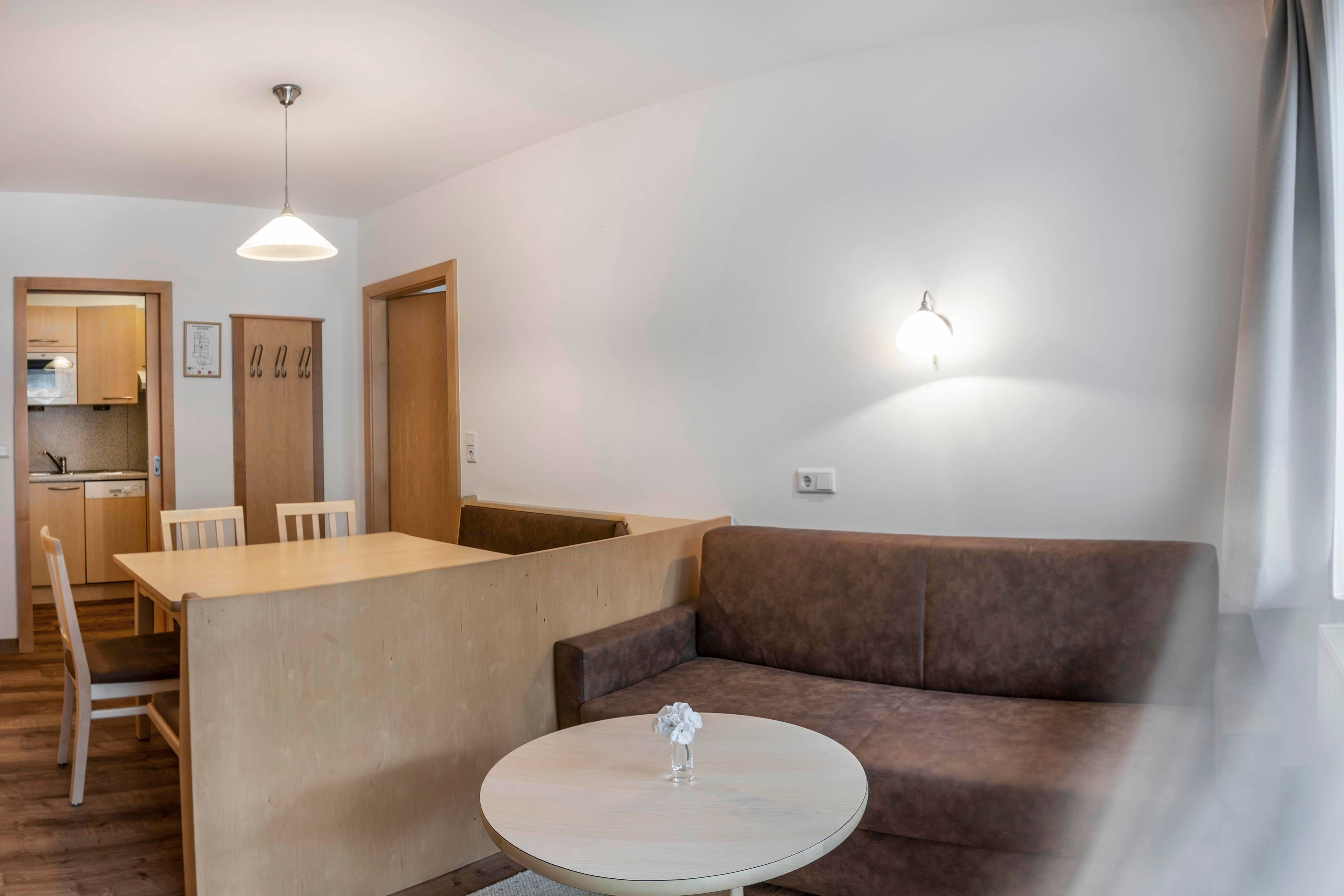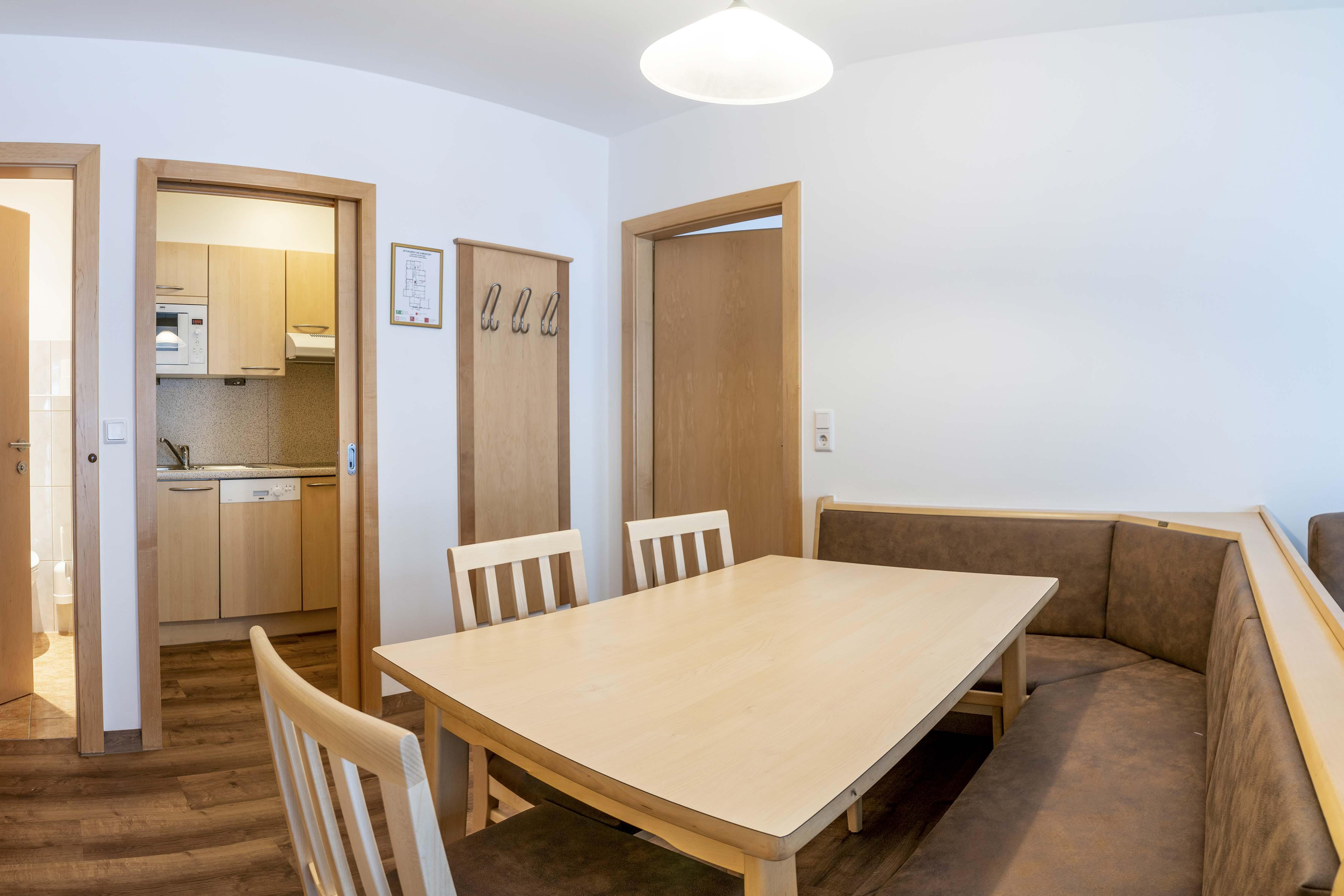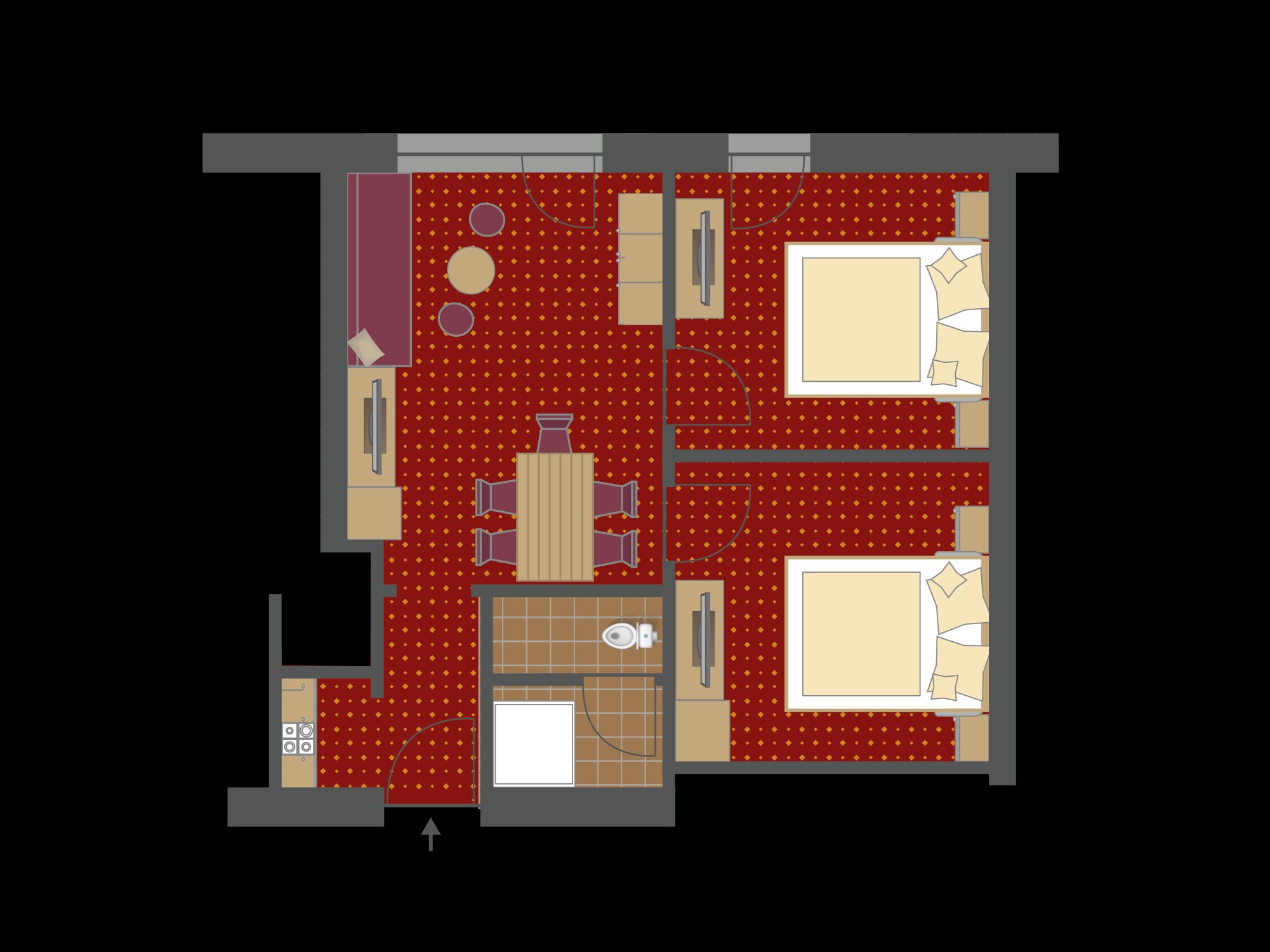 Appartement mit 2 getrennten Schlafzimmern, 1 Badezimmer mit Dusche, separates WC, 1 Wohn-Schlafraum mit Doppelcouch (Schlafmöglichkeit 5./6. Person), Essplatz, Kabel Flat-TV und Süd- od. Nordbalkon. Kochnische mit 2 Herdplatten, Kaffeemachine, Wasserkocher, Toaster, Kühlschrank, Mikrowelle und kleiner Spülmaschine. Größe: ca. 56 m².