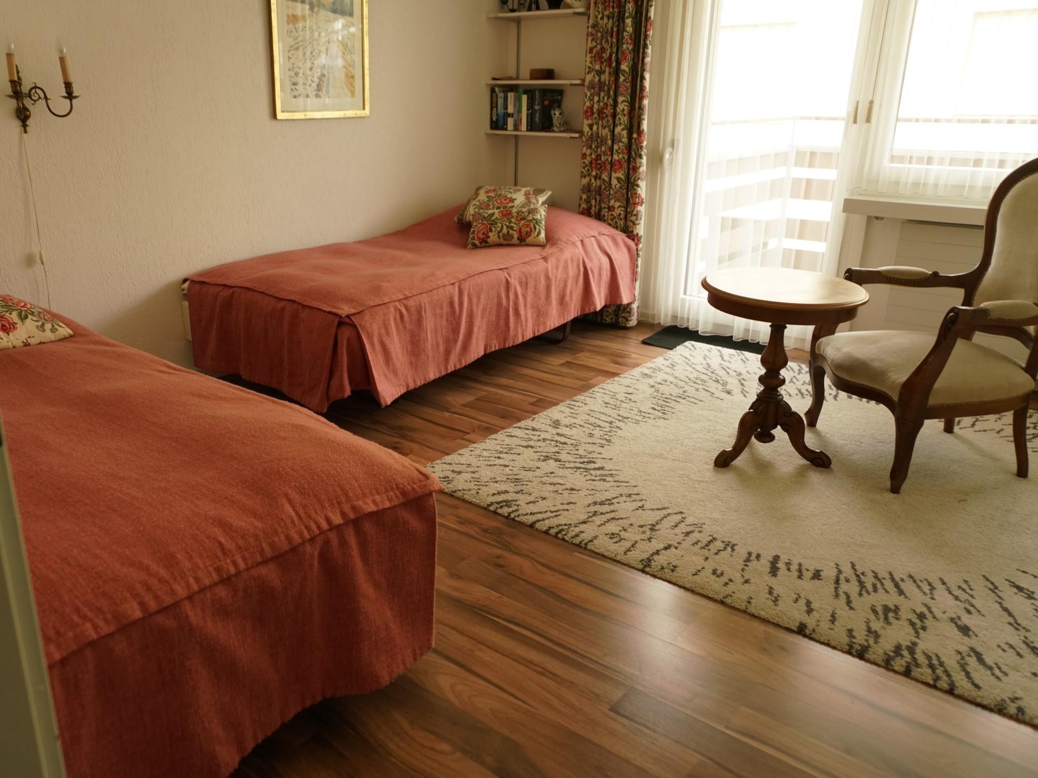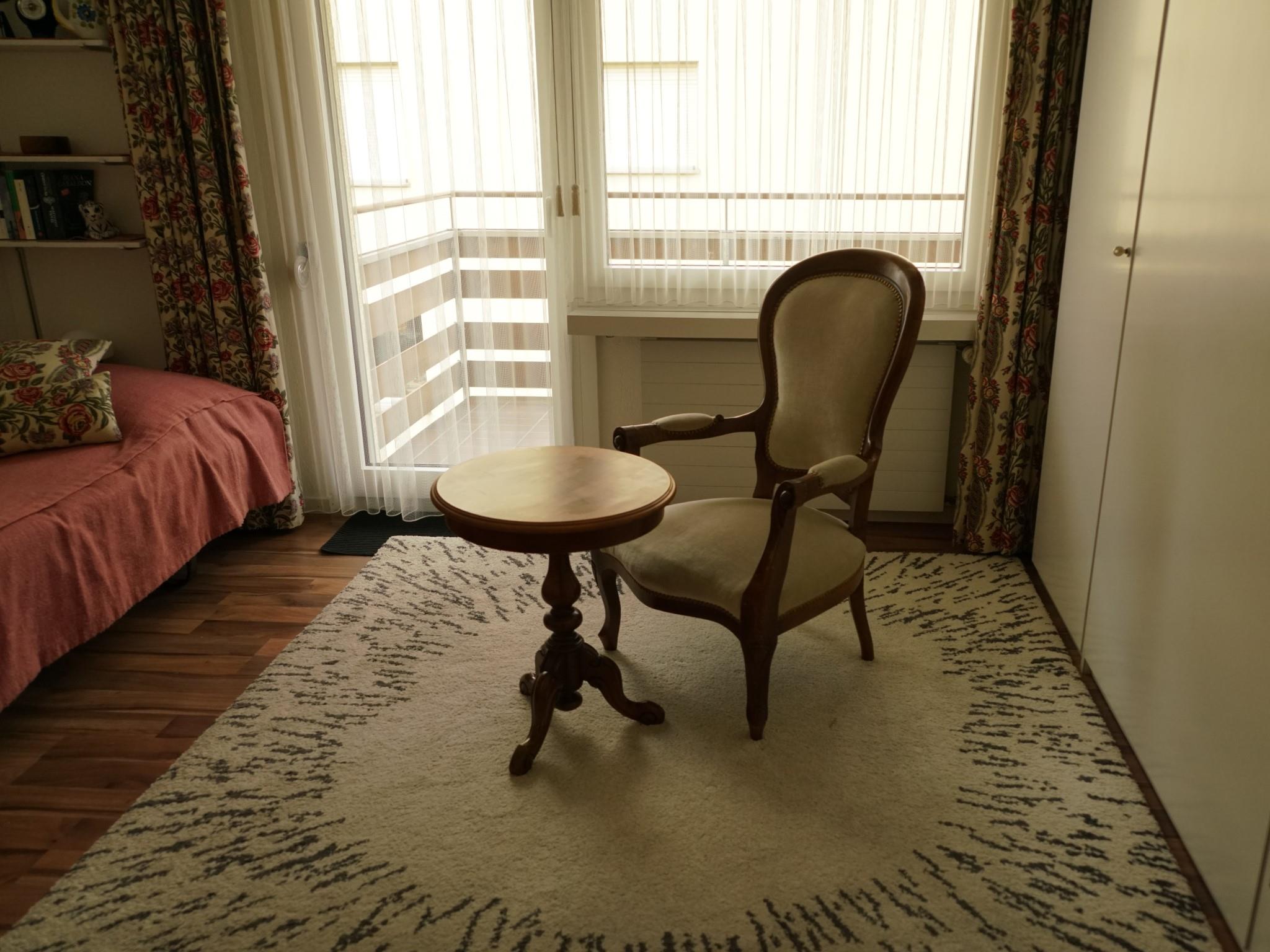 2 1/2 Zimmer-Wohnung (ca. 66m2) im 3. Stock in Mehrfamilienhaus mit Lift; Garage (Fahrzeughöhe max. 182cm); Wohnung mit zwei Südbalkonen; zur Mitbenützung: Skiraum, Garten, Waschmaschine (nach Absprache), Kinderspielplatz, Hallenbad und Sauna (gegen Gebühr); separate Küche mit Backofen, Kühlschrank, Geschirrspülmaschine, Toaster und Kaffeemaschine; Wohnzimmer mit Sitzgruppe; 1 Schlafzimmer mit 2 Betten und einem Schrankbett; separater Ess-Bereich mit Tisch und 6 Stühlen; Bad/WC und separates WC; Bettwäsche, Küchentücher, Frottéewäsche, Duvet Nordisch, Telefon, Radio, CD, Video, DVD, Fernseher, Computer, Internetzugang, Drucker, Fax, 1 Abfallsack (blau), WC-Papier. Haustiere sind nicht erlaubt. Die Wohnung ist mit vielen Bildern und antiken Möbeln ausgestattet und für kleinere Kinder ungeeignet. Deshalb vermieten wir die Wohnung nicht an Familien mit Kinder unter 10 Jahren. (Weitere Details und Bilder unter www.homepage.swissonline.ch/rast/davos)