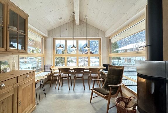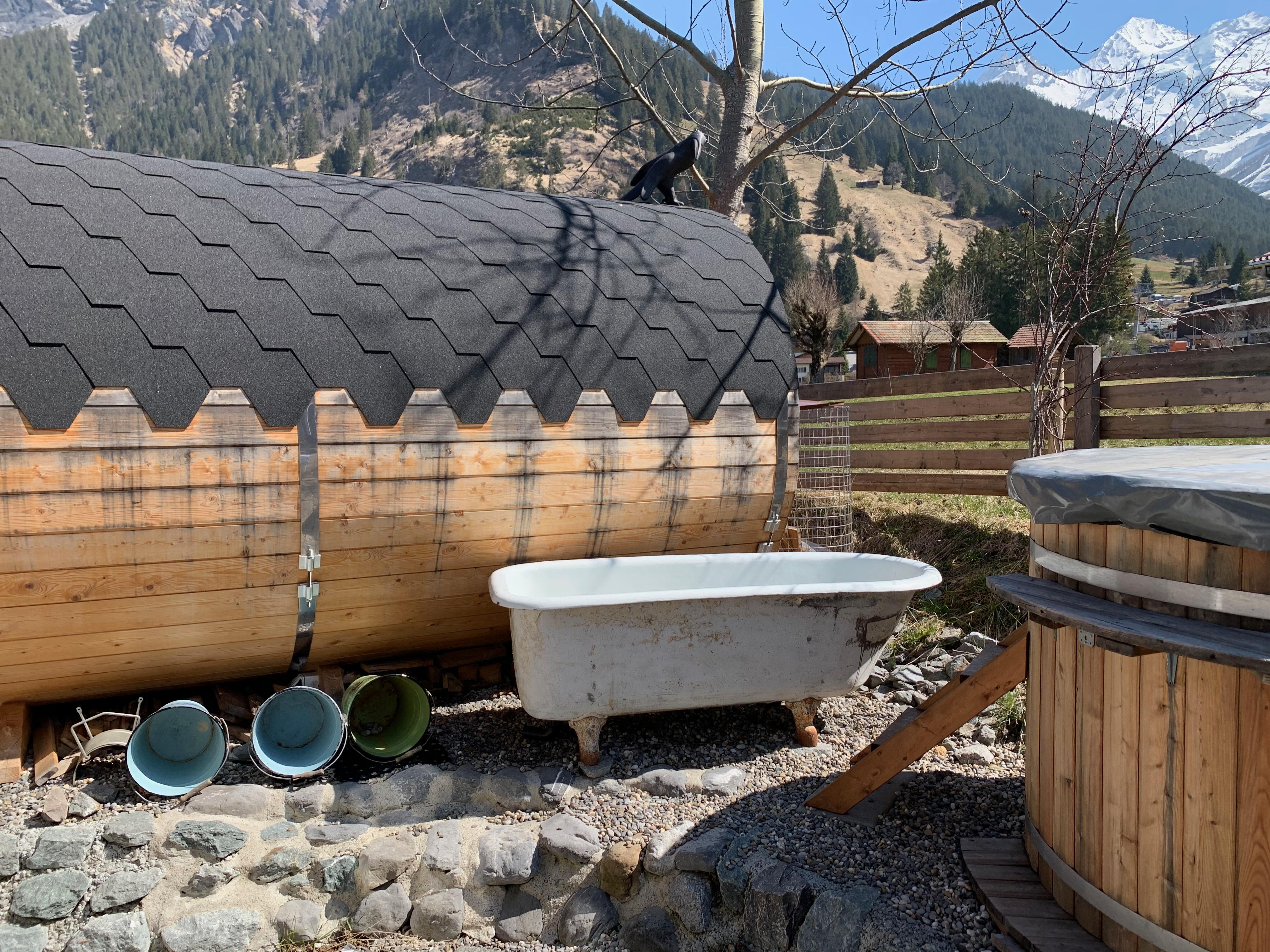 Terrasse mit schöner Bergsicht und Esstisch mit 6 Sitzplätzen, Liegestühle, Elektrogrill, Pizzaofen mit Holzpellets; 4 Gratis-Parkplätze, Schlitten und Velos zur freien Benutzung. Zudem haben wir neben dem Haus einen Wellnessbereich mit einer Sauna und einem Hot Pot angeordnet. Die Sauna steht jederzeit für CHF 10.- zur Verfügung (Vorheizzeit ca. 45 Min). Der Hot Pot kann nur gegen Voranmeldung benutzt werden.