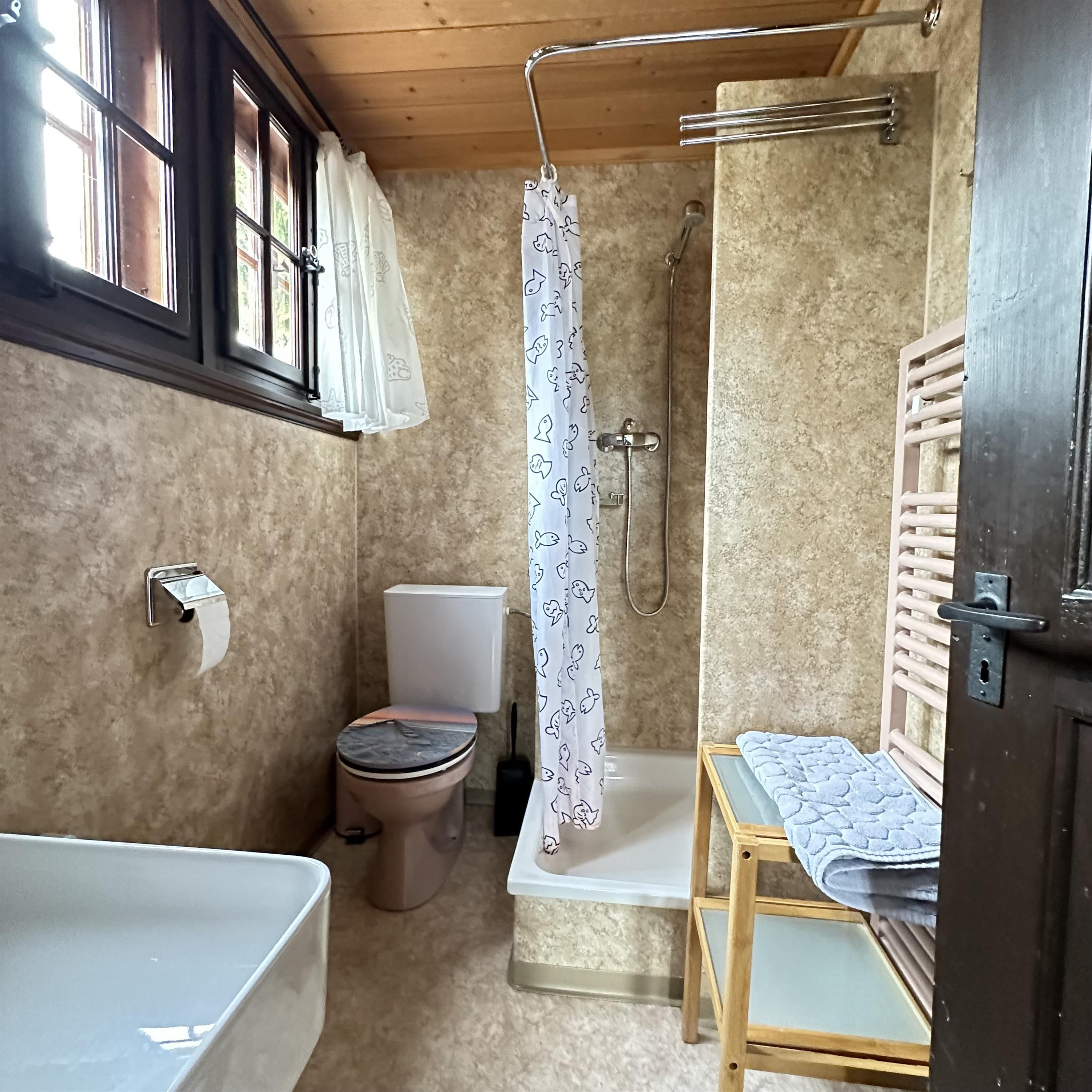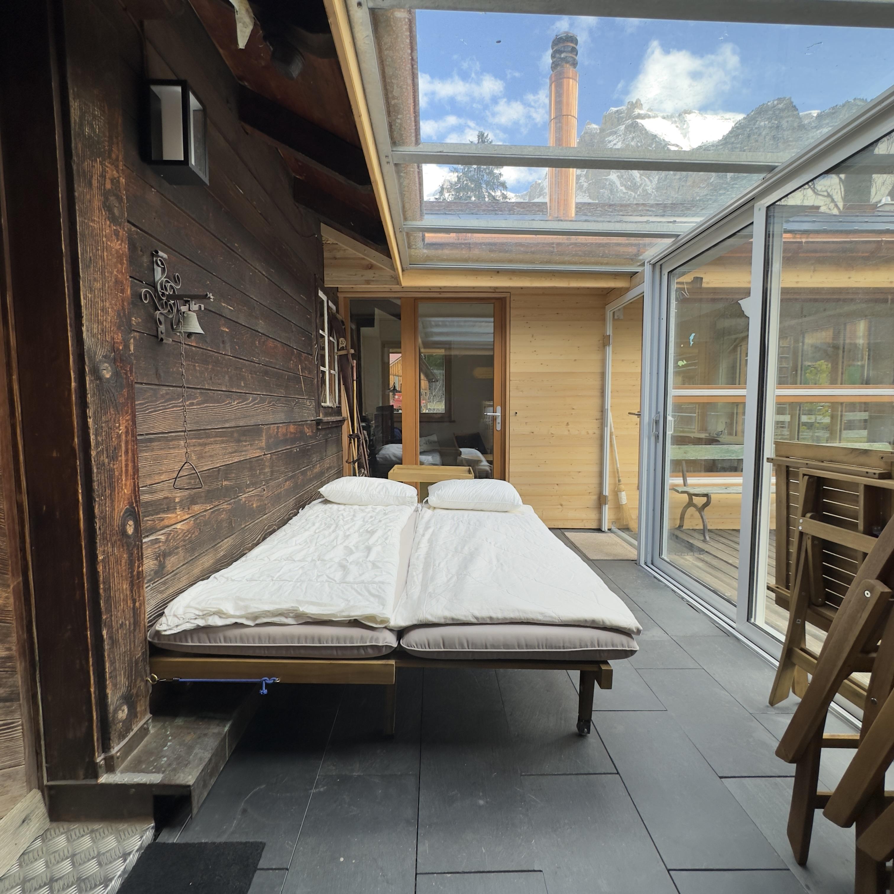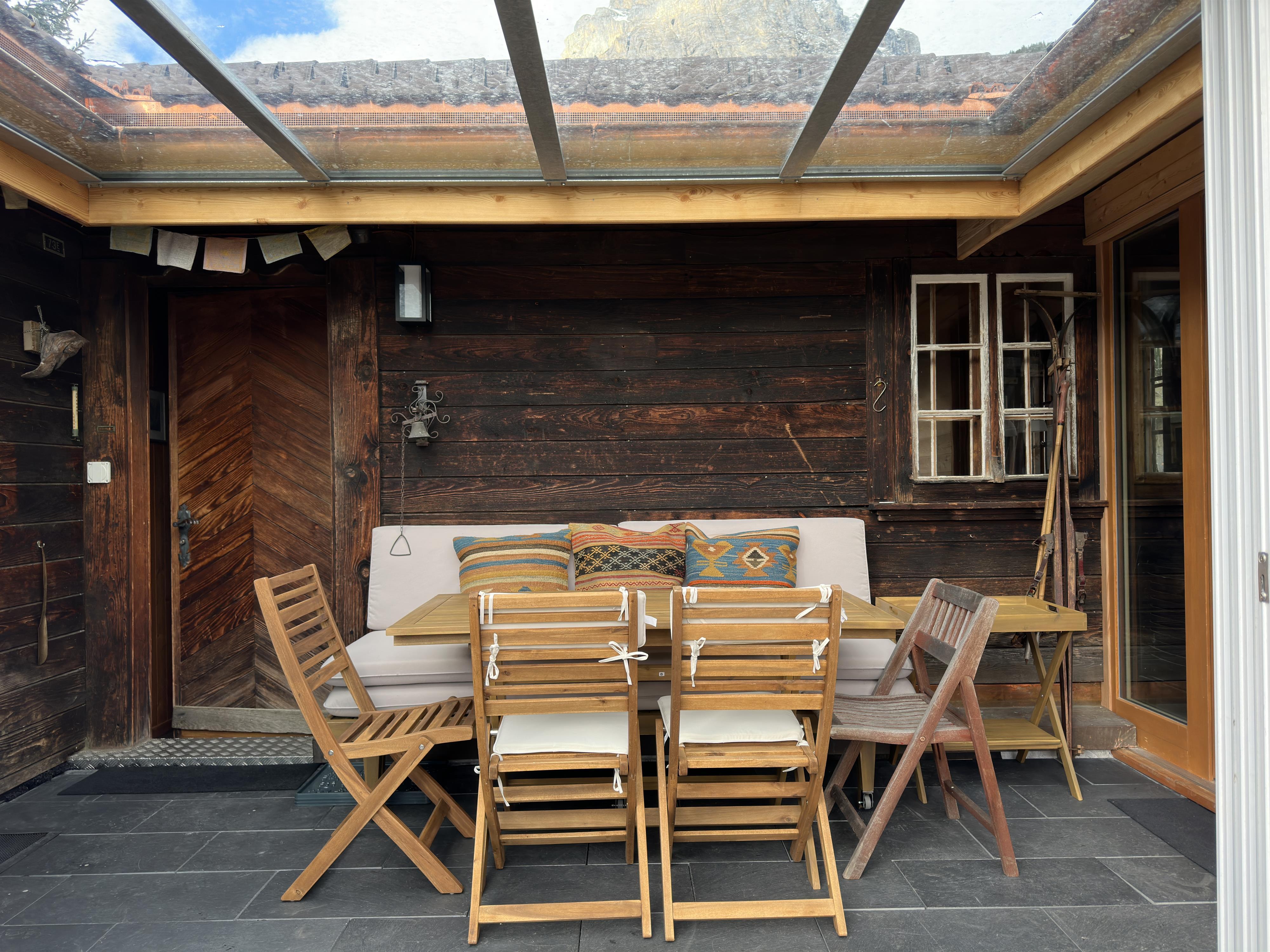 Terrasse mit schöner Bergsicht und Esstisch mit 6 Sitzplätzen, Liegestühle; 4 Gratis-Parkplätze, Schlitten und Velos zur freien Benutzung. Zudem haben wir neben dem Haus einen Wellnessbereich mit einer Sauna und einem Hot Pot angeordnet. Die Sauna steht jederzeit für CHF 10.- zur Verfügung (Vorheizzeit ca. 45 Min). Der Hot Pot kann nur gegen Voranmeldung benutzt werden.
