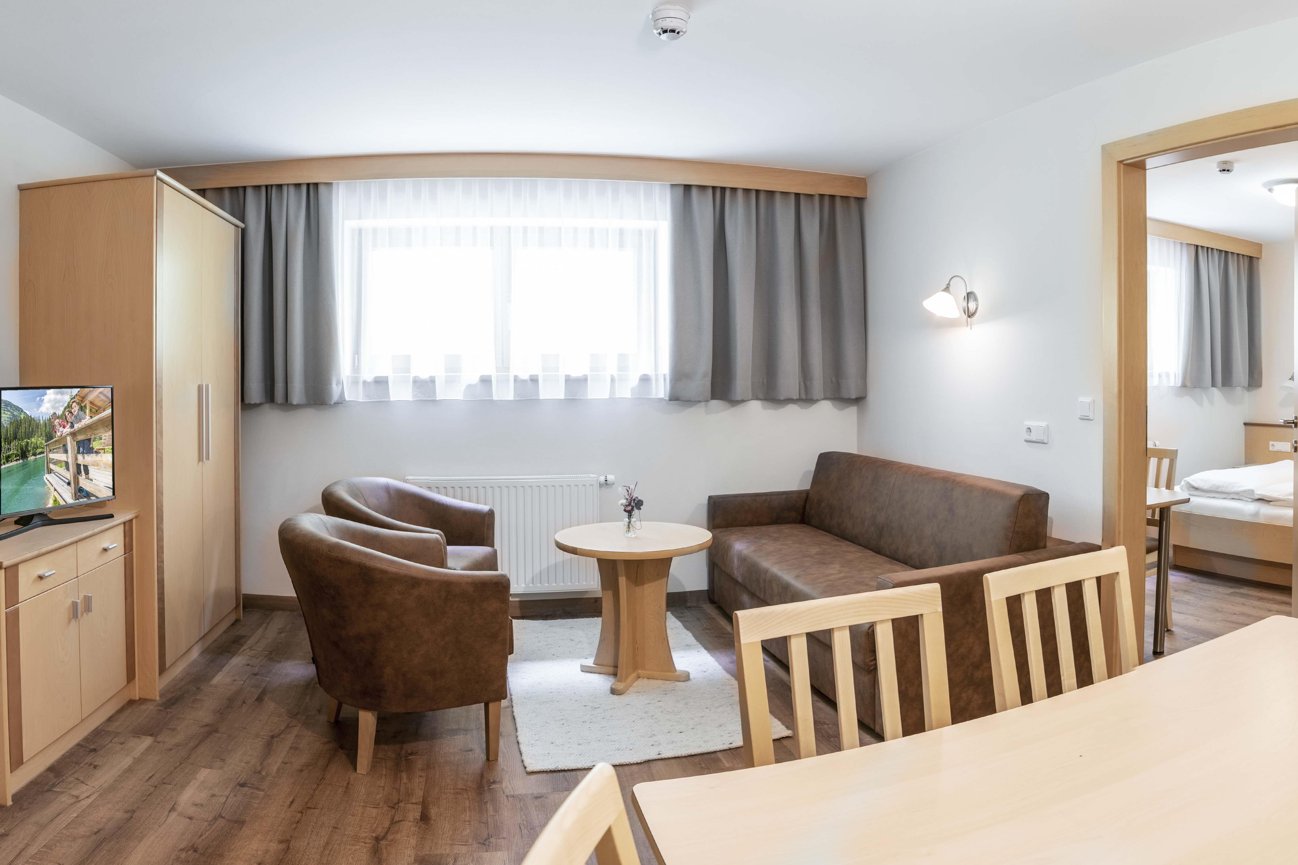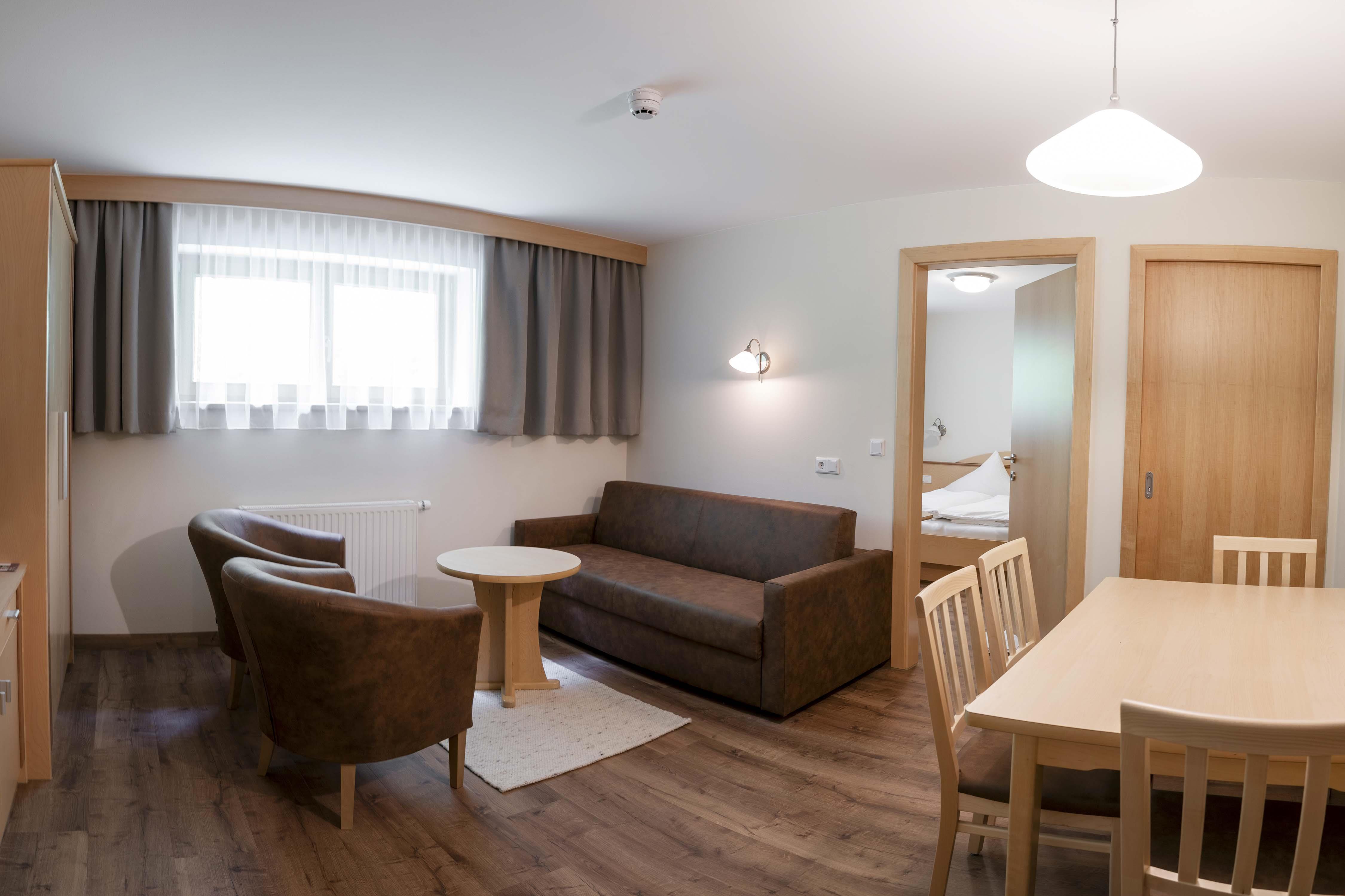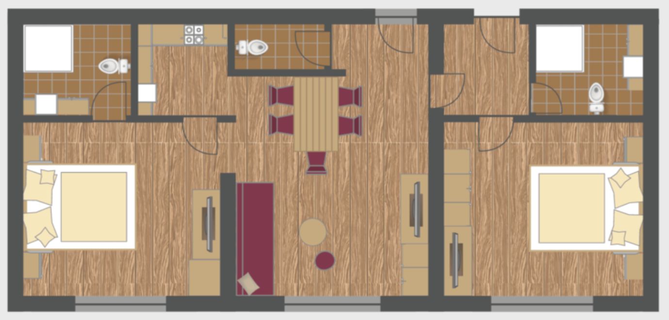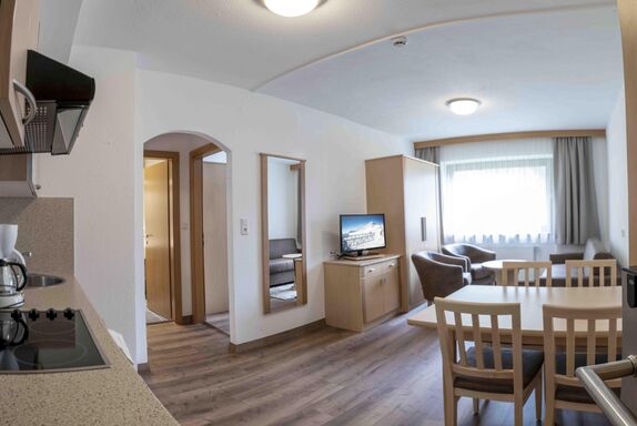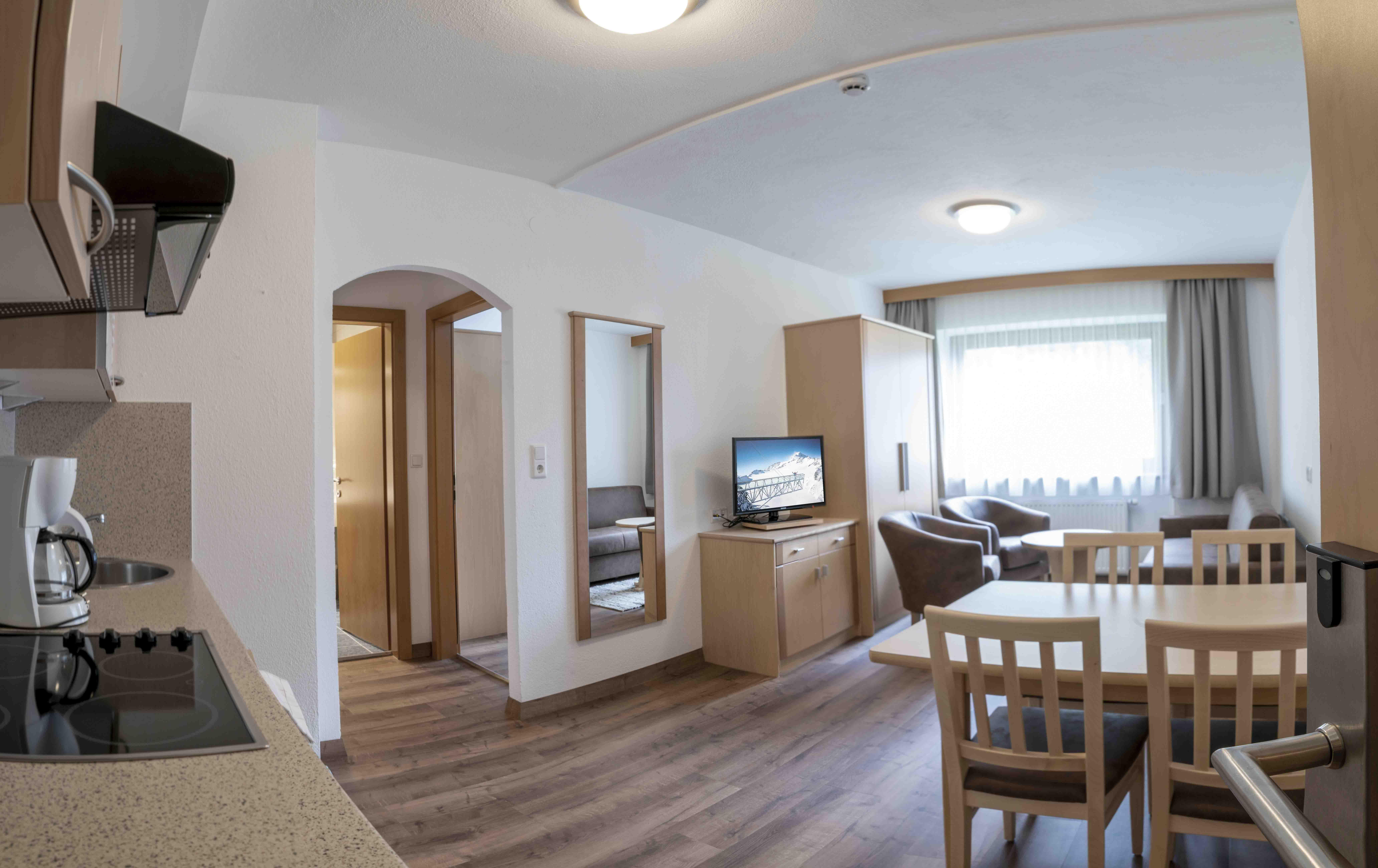 Gemütlich und komfortabel eingerichtetes Appartement (60 qm) mit 2 Doppelzimmern mit jeweils Dusche/WC und 1 Wohnschlafzimmer mit separatem WC zur Bergseite gelegen, kein Balkon(ruhig). Komplett eingerichtete Küche mit Kaffeemaschine, Wasserkocher, Mikrowellenherd, Toaster, Kühlschrank und Spülmaschine.