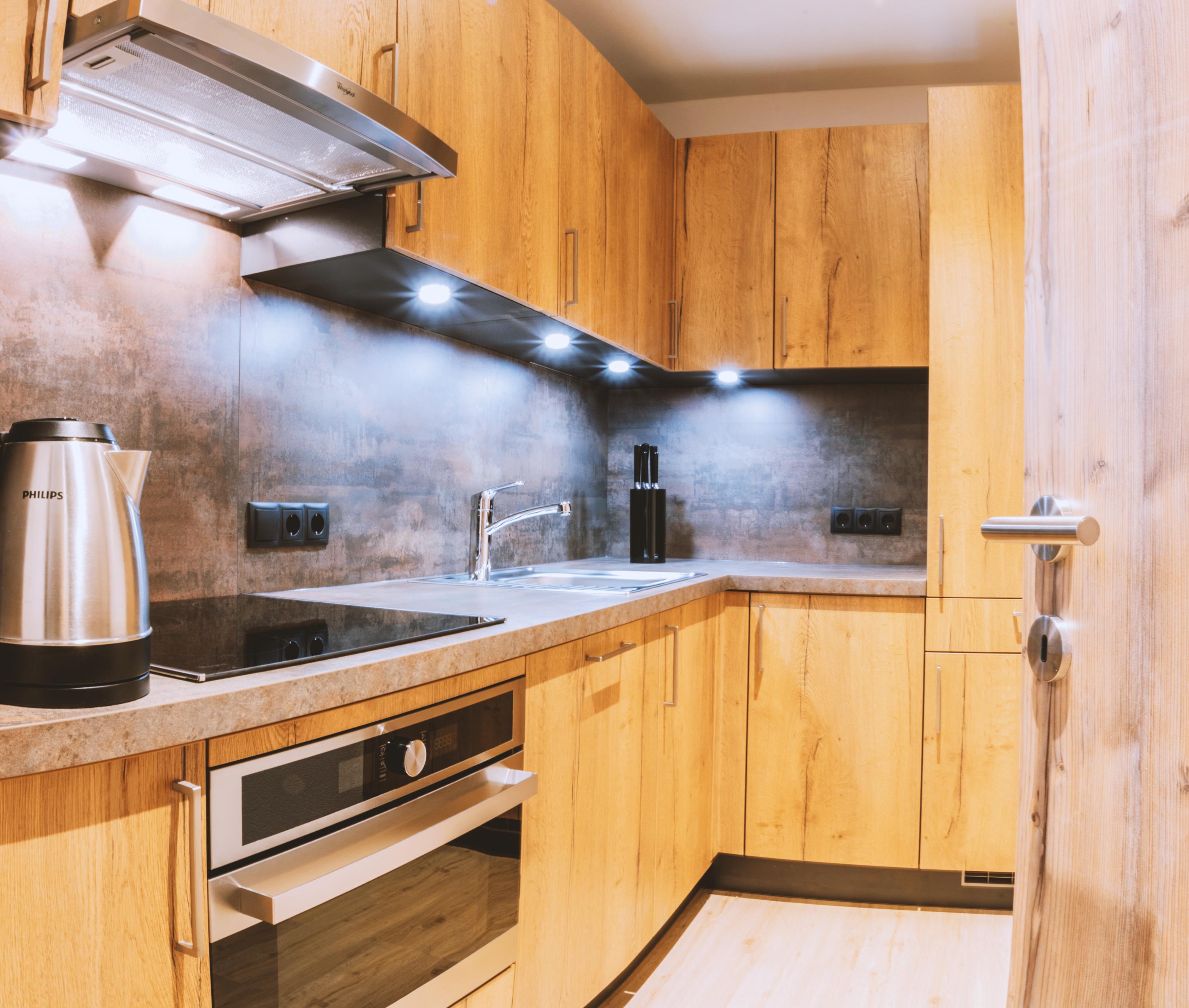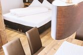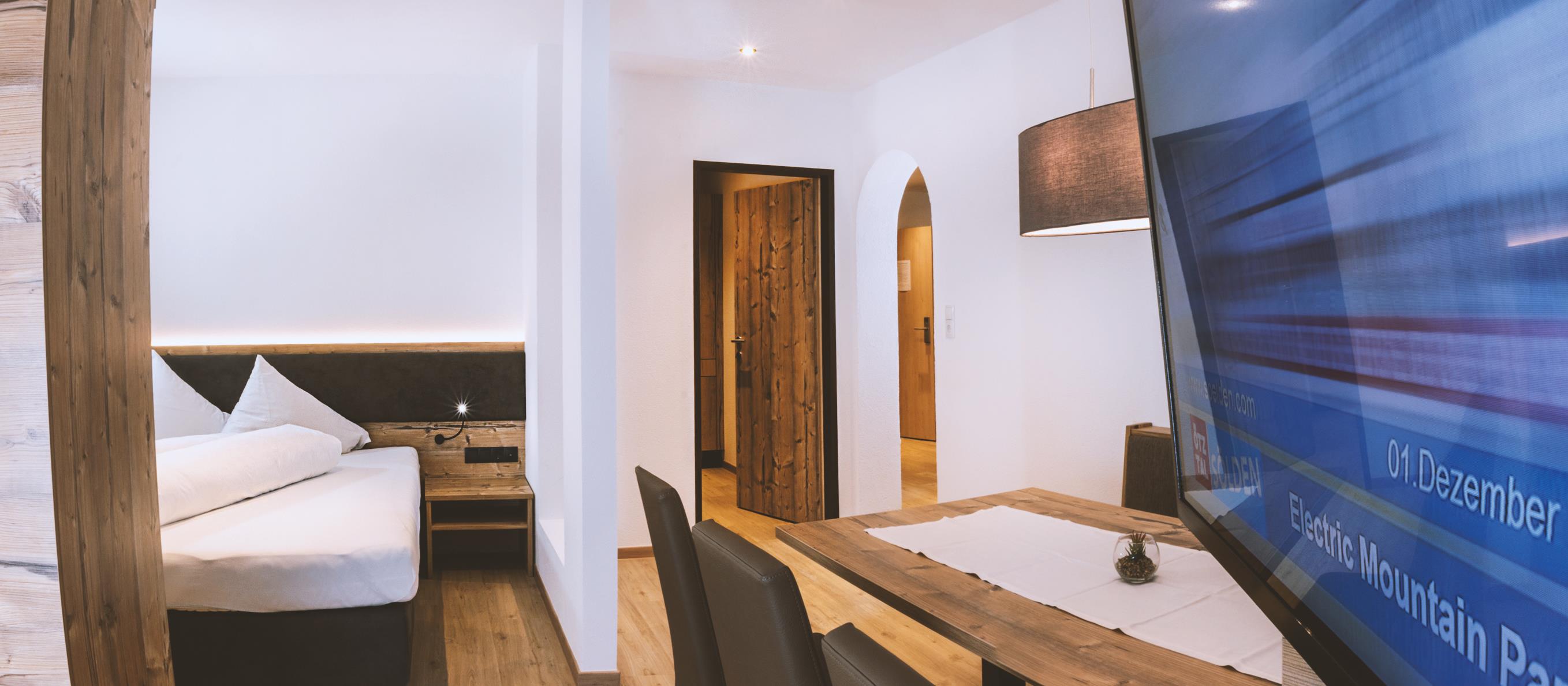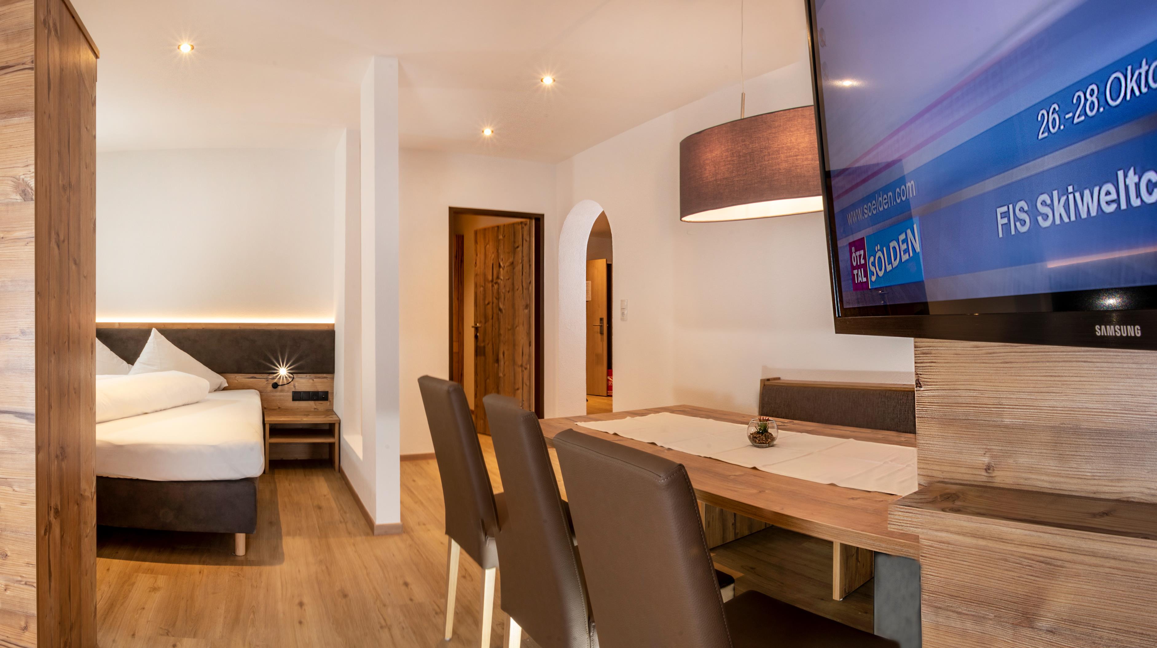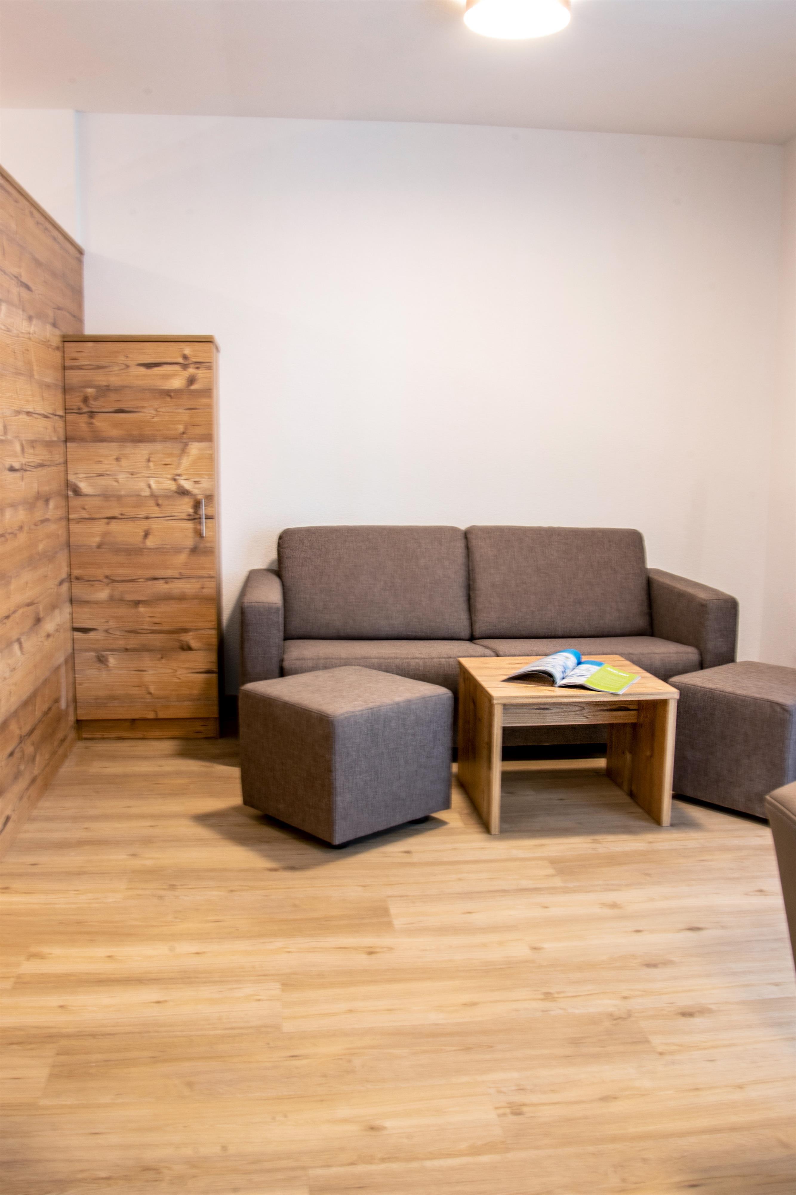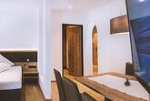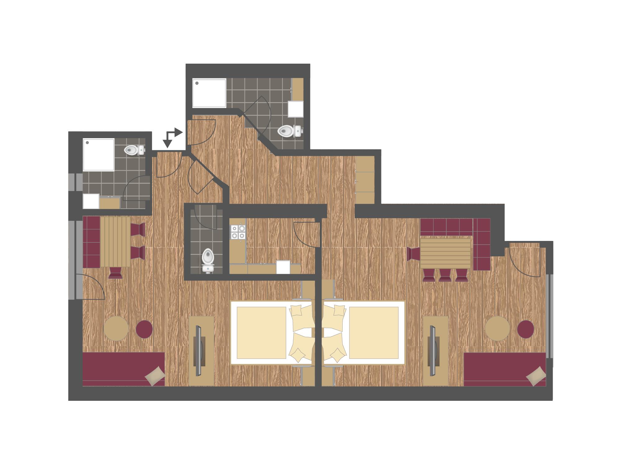 Dieses Komfortappartement mit insgesamt 82 m² verfügt über 2 Schlafzimmer mit Doppelbetten, 2 Wohnzimmer mit ausziehbarer Couch, 1 großzügiger Esstisch und ein kleinerer Essbereich im 2. Wohnzimmer, sowie eine komplett vollausgestattete Küche. Balkon und Terrasse, zwei Badezimmer mit Dusche/WC und ein separates WC. Warme Farben, Naturmaterialien und Holzboden machen dieses Appartement zu einer ganz besonderen Wohlfühloase.